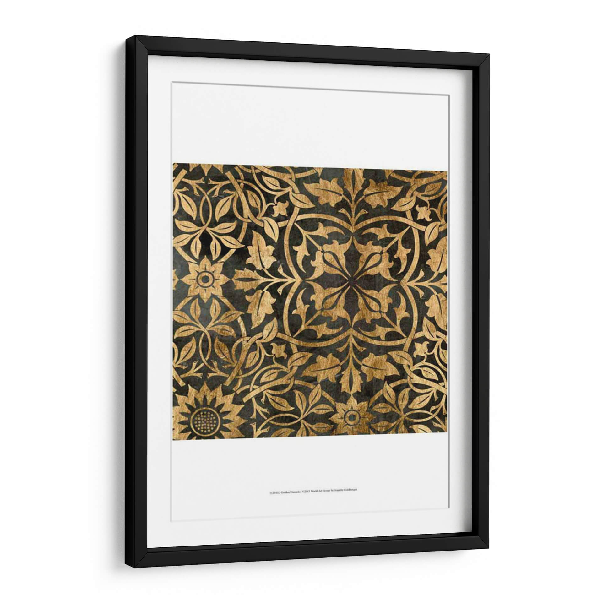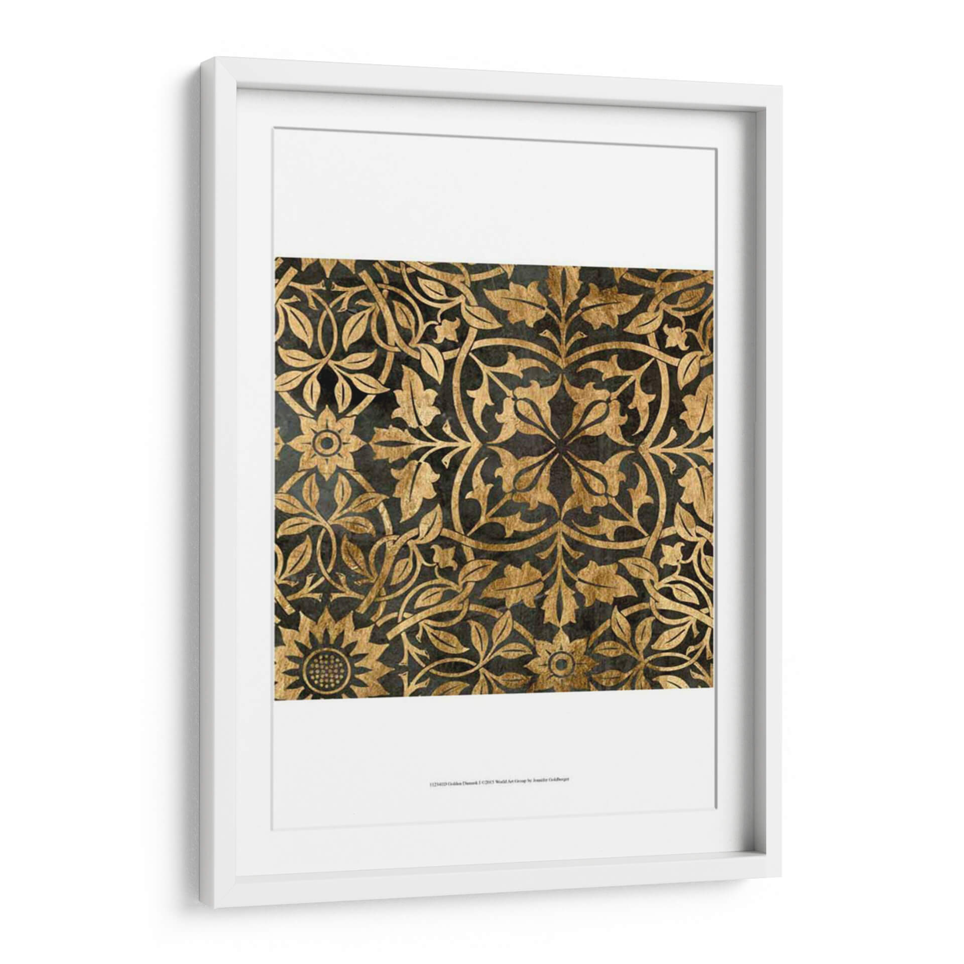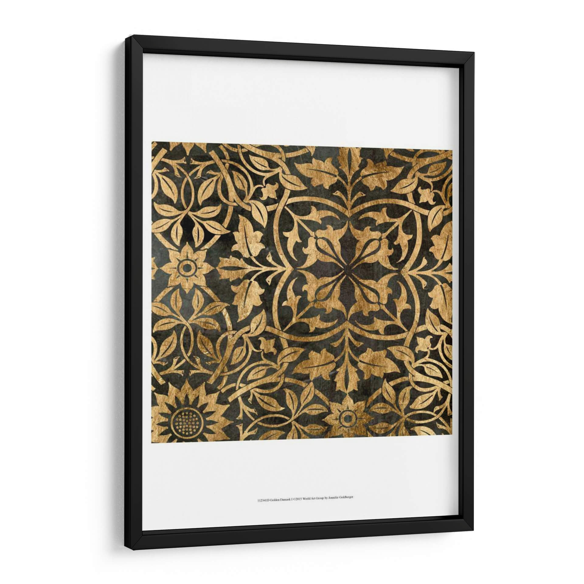 Sumérgete en la opulencia y el detalle intrincado de "Damasco Dorado I", una obra de arte de Jennifer Goldberger que evoca elegancia atemporal. Este cuadro decorativo presenta un patrón botánico damasceno en tonos dorados vibrantes sobre un fondo oscuro y texturizado, creando un contraste visualmente impactante. Las volutas y las flores estilizadas se entrelazan en una composición simétrica y armoniosa, que recuerda a los ricos textiles y los intrincados diseños de épocas pasadas. La paleta de colores, dominada por el oro brillante y los negros profundos, confiere una sensación de lujo y sofisticación, haciendo de esta pieza un acento perfecto para espacios que buscan un toque de glamour y refinamiento. Ideal para añadir un punto focal histórico y artístico a salones, comedores o estudios, "Damasco Dorado I" inspira admiración y añade una dimensión de opulencia clásica a la decoración moderna. Su diseño detallado y su rica paleta de colores lo convierten en una elección excepcional para quienes aprecian el arte con un legado ornamental y una ejecución contemporánea.