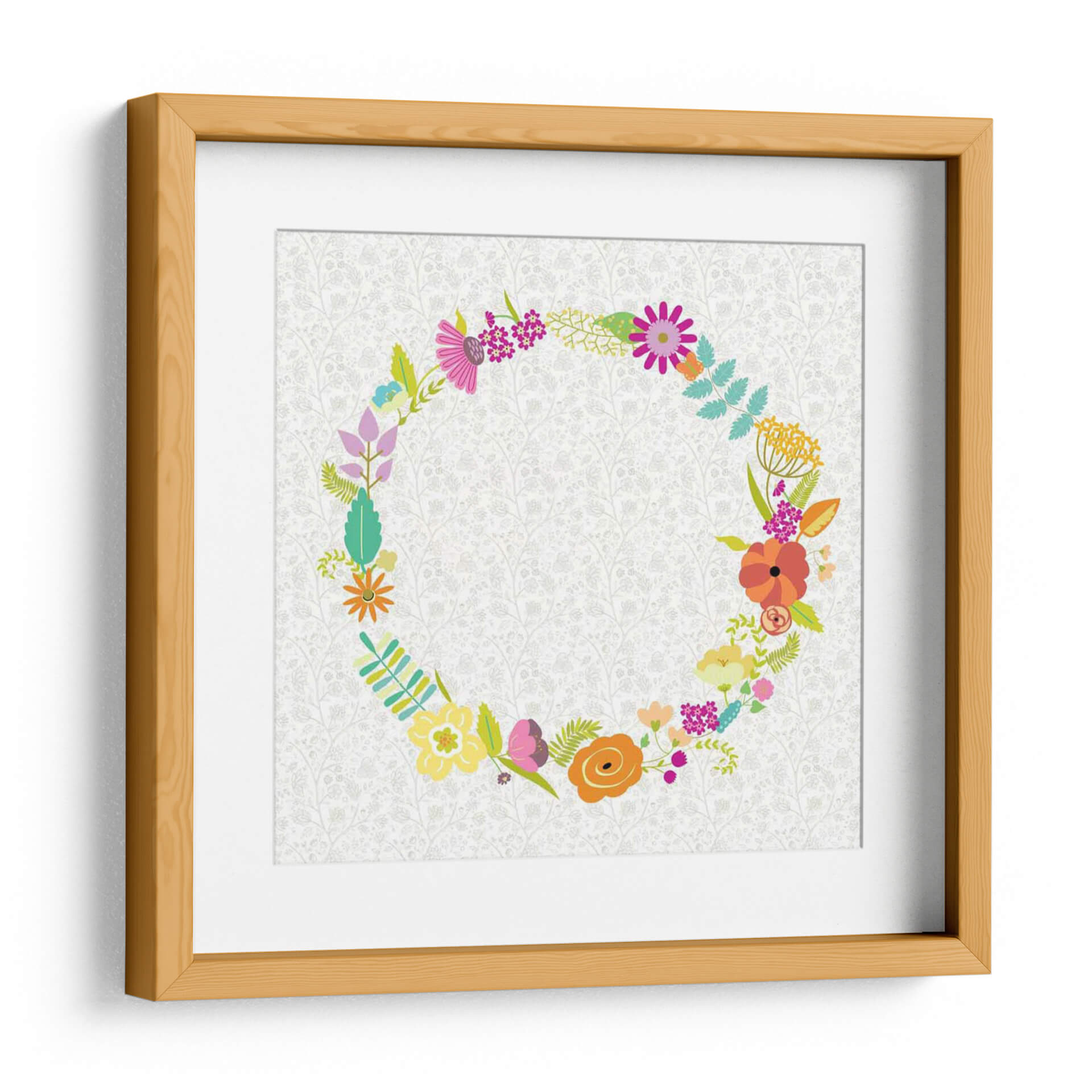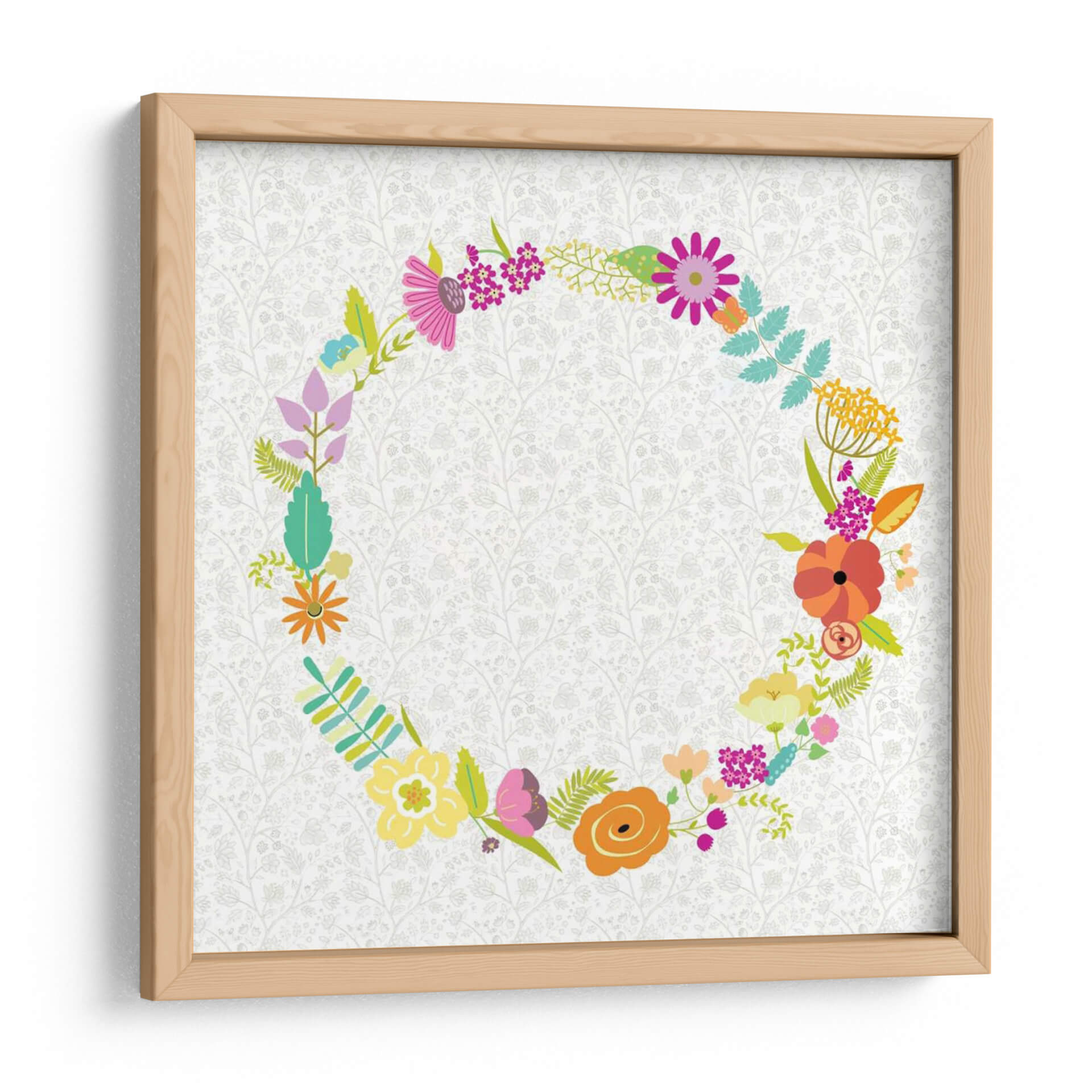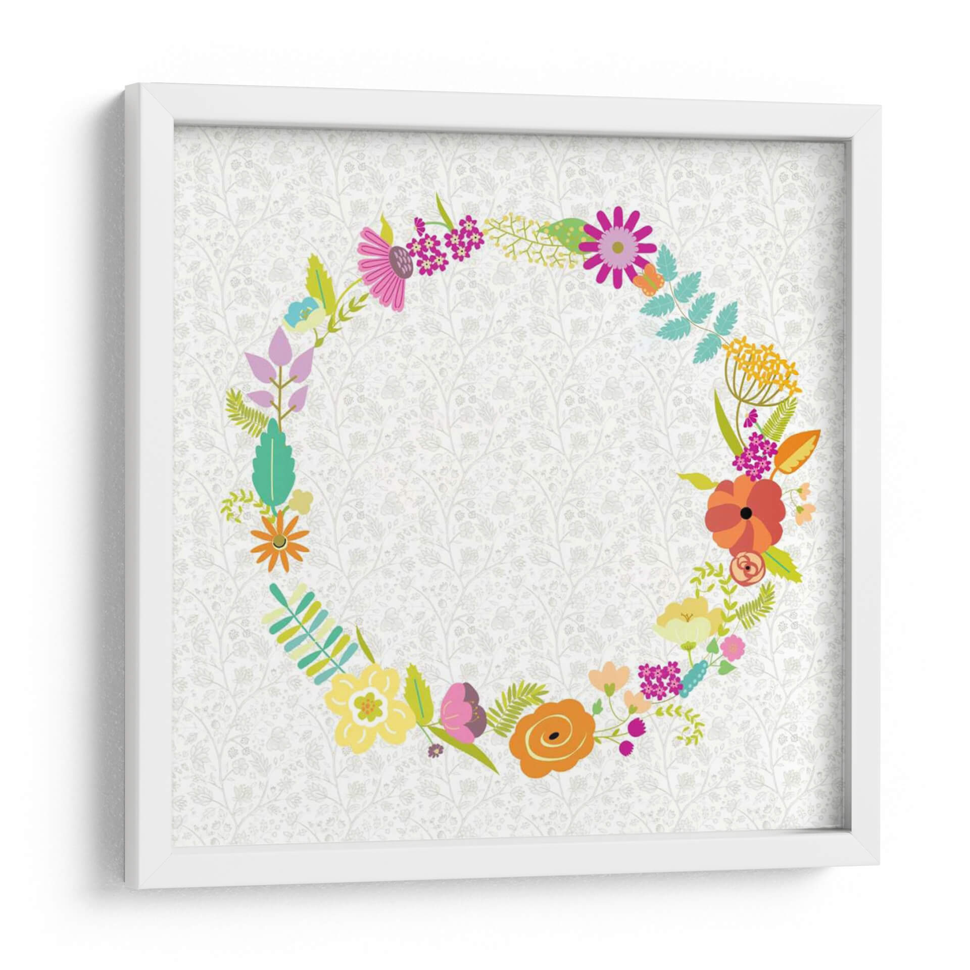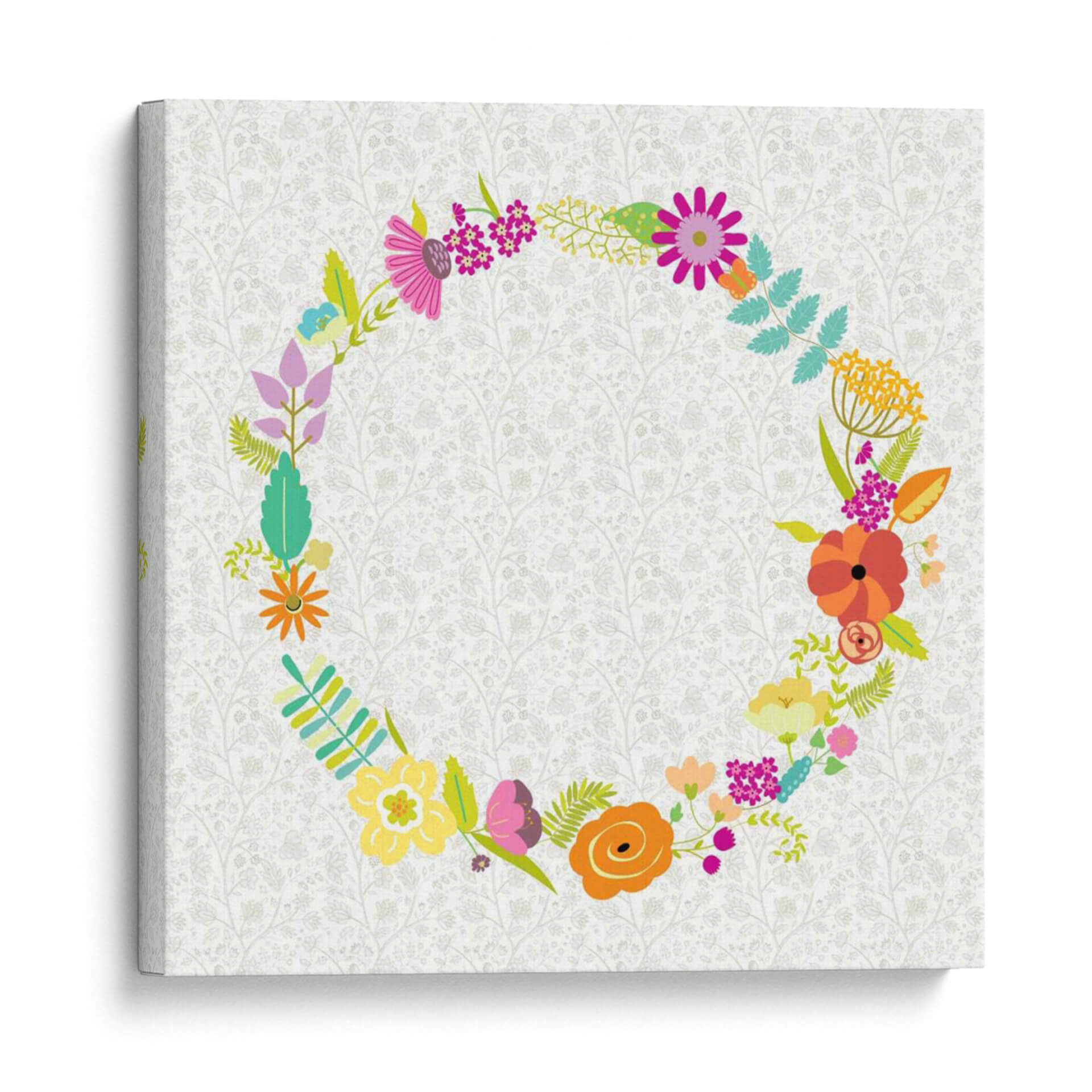 Inyecta vitalidad y encanto floral en tu espacio con "Giro Girly II" de Chariklia Zarris. Este vibrante cuadro decorativo presenta una exuberante corona de flores y follaje, meticulosamente dispuesta en un patrón circular. Cada flor, representada con trazos audaces y colores alegres, evoca la frescura de un jardín en plena floración. La paleta de colores es una celebración de la primavera, con toques de rosa fucsia, naranja cálido, amarillo brillante y verde esmeralda, contrastando maravillosamente con un delicado fondo texturizado en tonos crema y gris pálido. La composición circular crea una sensación de armonía y movimiento, invitando a la contemplación. Ideal para añadir un toque de alegría y color a salas de estar, dormitorios o cualquier rincón que necesite un respiro de optimismo. "Giro Girly II" es más que una simple decoración de pared; es una invitación a celebrar la belleza de la naturaleza y el arte contemporáneo, aportando luz y serenidad a tu hogar. Descubre la obra de Chariklia Zarris y transforma tus ambientes con este diseño único.