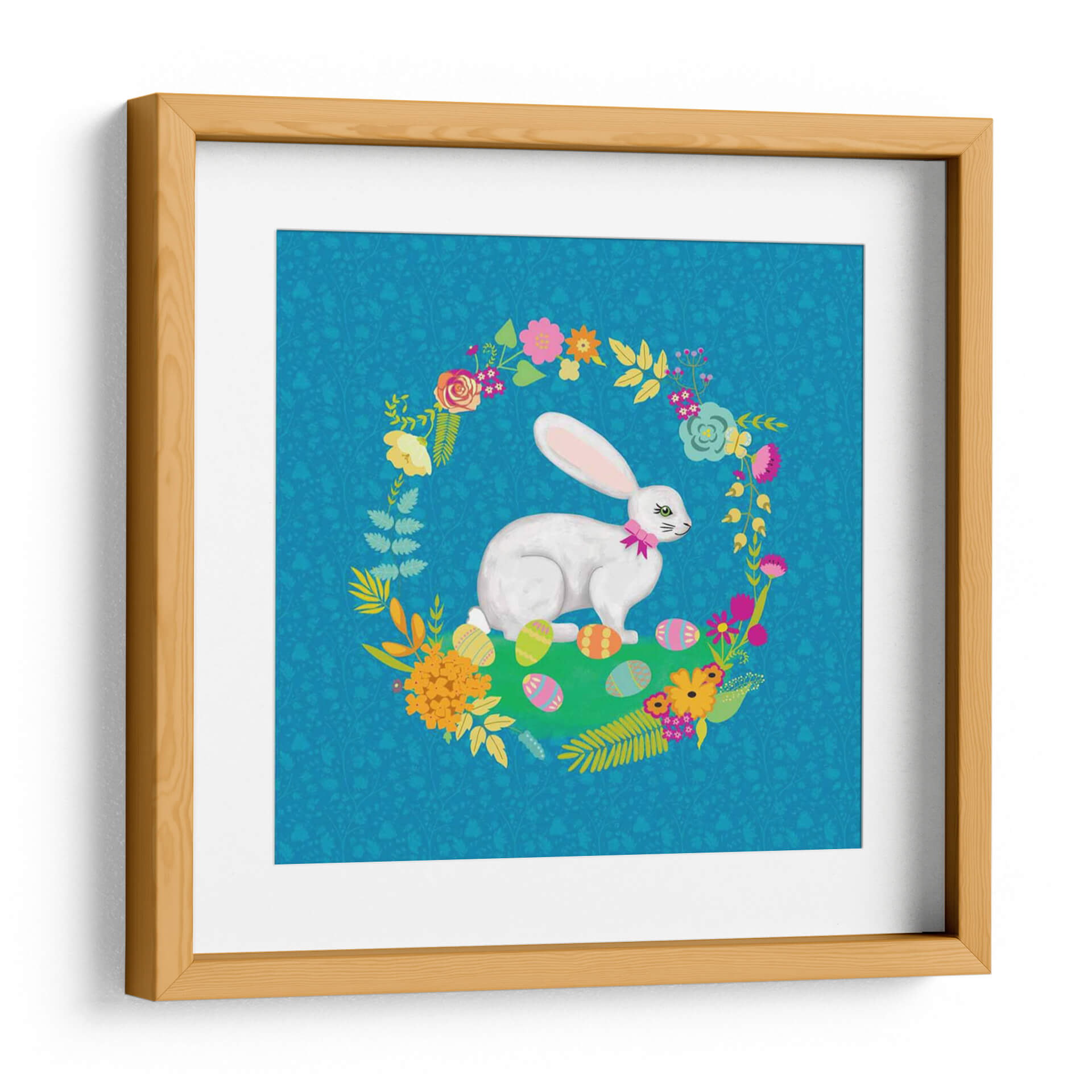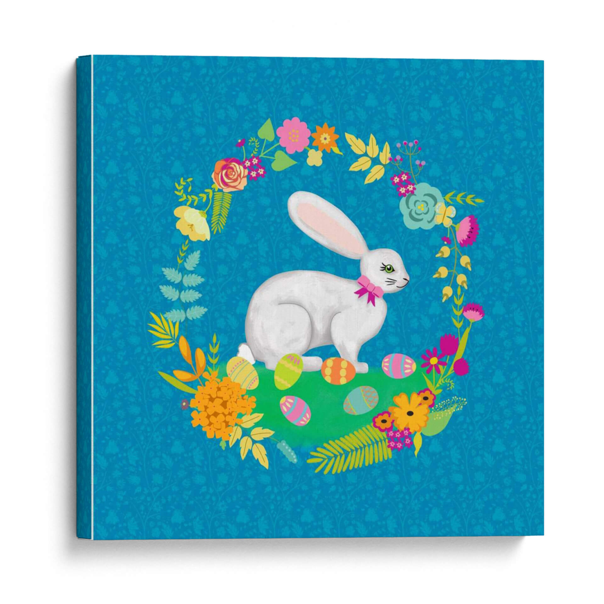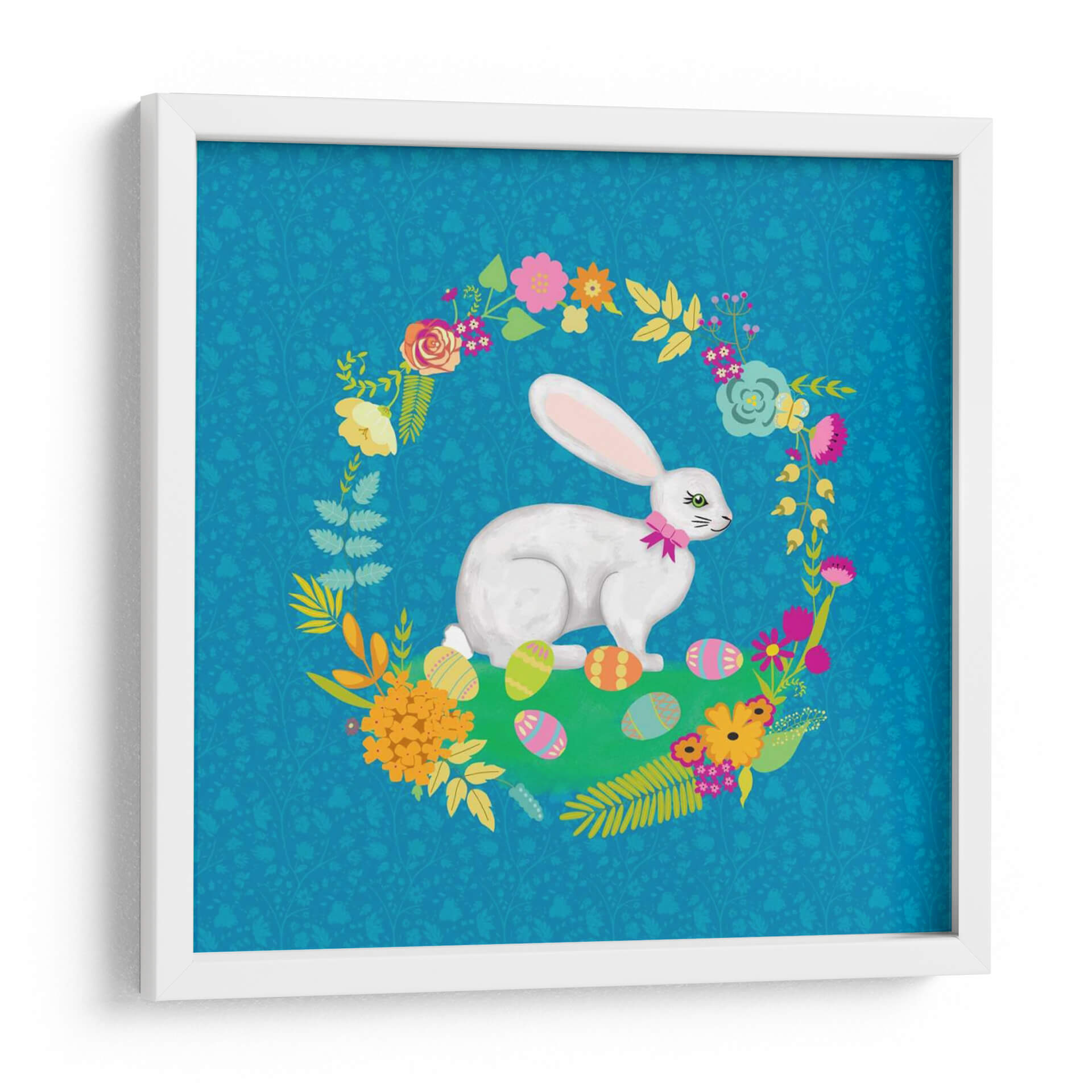 Sumérgete en la dulzura y el encanto de la primavera con "Guirnalda de Conejito I", una obra de arte vibrante y alegre del artista Chariklia Zarris. Esta pieza captura la esencia de la renovación y la festividad, presentando un tierno conejito blanco rodeado de un exuberante semicírculo de flores coloridas y hojas verdes, todo sobre un fondo azul turquesa con un delicado patrón botánico. Los huevos de Pascua decorados esparcidos en la hierba verde añaden un toque juguetón y festivo, evocando la magia de la temporada. La paleta de colores, rica en azules, verdes, rosas, naranjas y amarillos, crea una atmósfera de vitalidad y optimismo. El estilo gráfico y la composición circular invitan la mirada a recorrer cada detalle, desde la expresión serena del conejito hasta la textura de las flores. Este cuadro decorativo es ideal para añadir un toque de color y alegría a la habitación de un niño, una sala de estar moderna o incluso un espacio de oficina que necesite un respiro visual. Su temática primaveral y su diseño encantador lo convierten en una pieza versátil que celebra la vida y la naturaleza. "Guirnalda de Conejito I" no es solo una decoración, es una invitación a la felicidad y al optimismo en tu hogar. Descubre cómo esta obra puede transformar tu espacio y llenar tus días de luz.