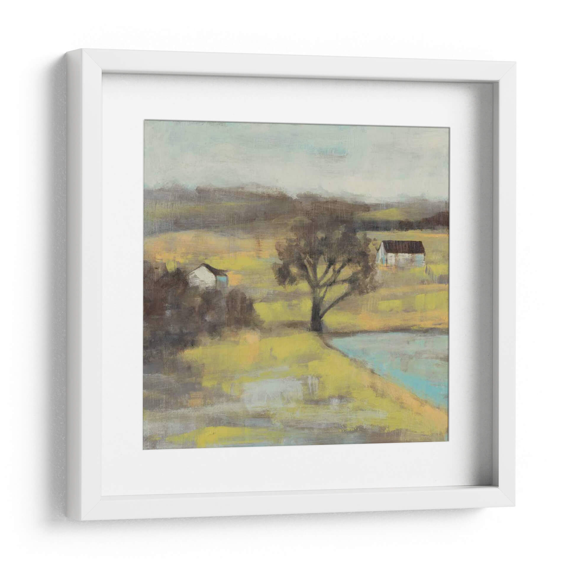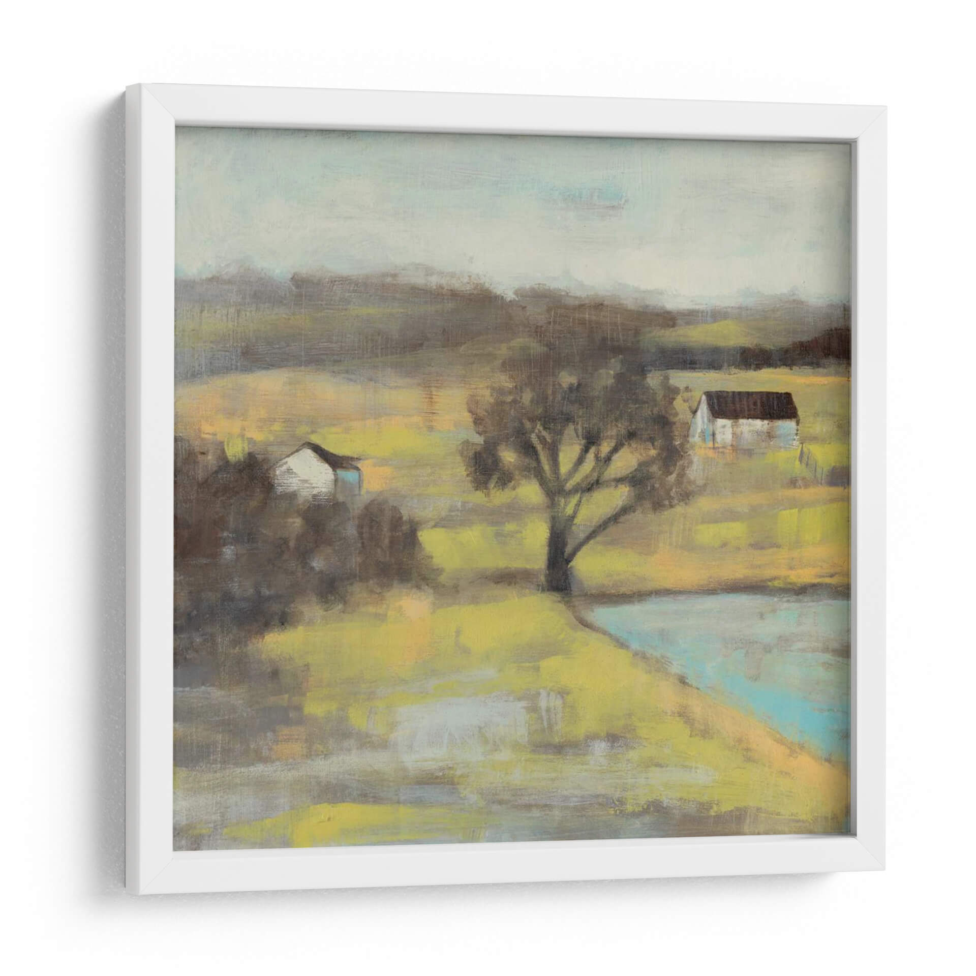 Sumérgete en la serena belleza de "Mist Pastoral II" de Jennifer Goldberger, una obra que evoca la tranquilidad de un paisaje rural bañado por una luz etérea. Este cuadro decorativo captura la esencia de un día brumoso en el campo, con dos sencillas edificaciones que se asoman entre la vegetación y un árbol solitario que actúa como guardián silente del escenario. La paleta de colores, dominada por tonos tierra, amarillos ocre y grises suaves, junto con sutiles toques de azul aguamarina en el cuerpo de agua, crea una atmósfera de calma y contemplación. El estilo pictórico, con pinceladas sueltas y una ligera abstracción, invita a la interpretación personal, permitiendo que cada espectador conecte con la pieza a un nivel íntimo. Es una invitación a la paz, perfecta para añadir un toque de naturaleza y sosiego a tu hogar u oficina. Ideal para espacios que buscan transmitir una sensación de retiro y conexión con la tierra, este cuadro decorativo contemporáneo transformará cualquier habitación en un refugio de tranquilidad y estilo.