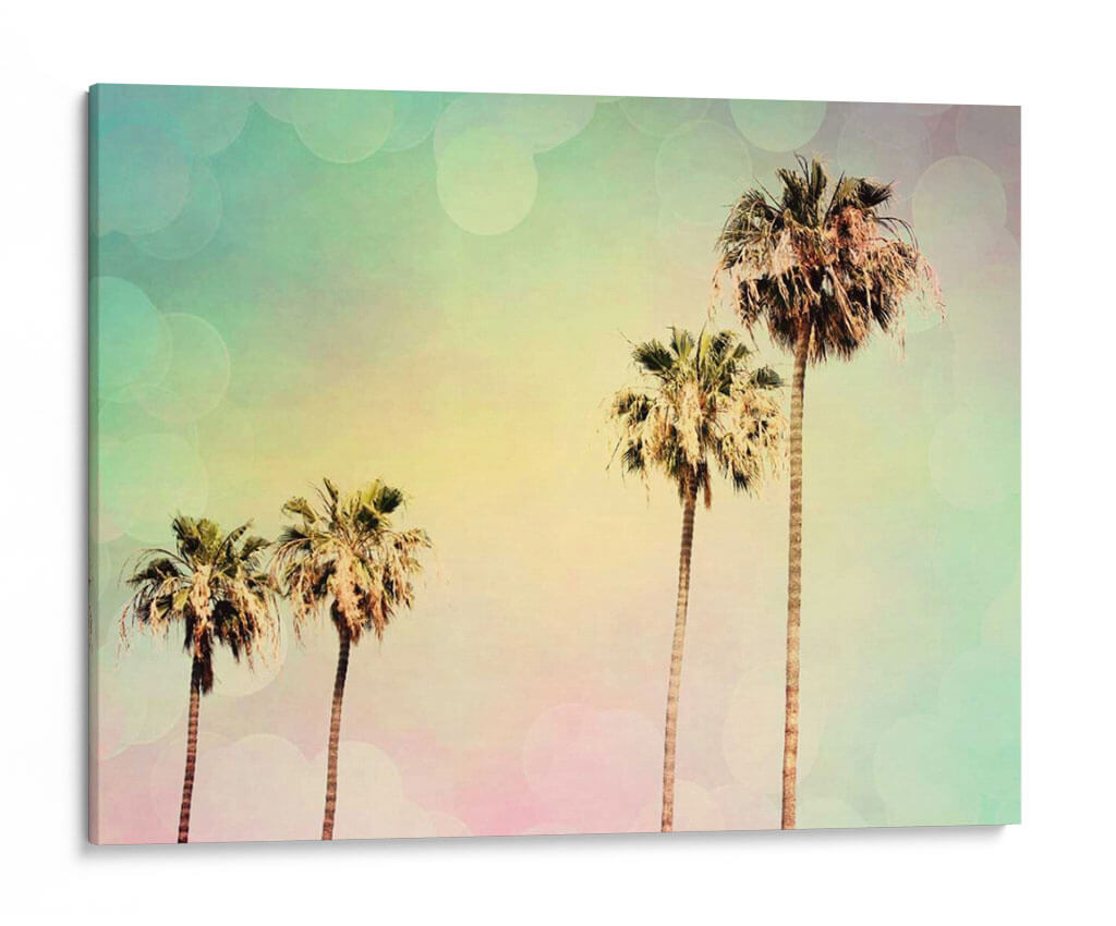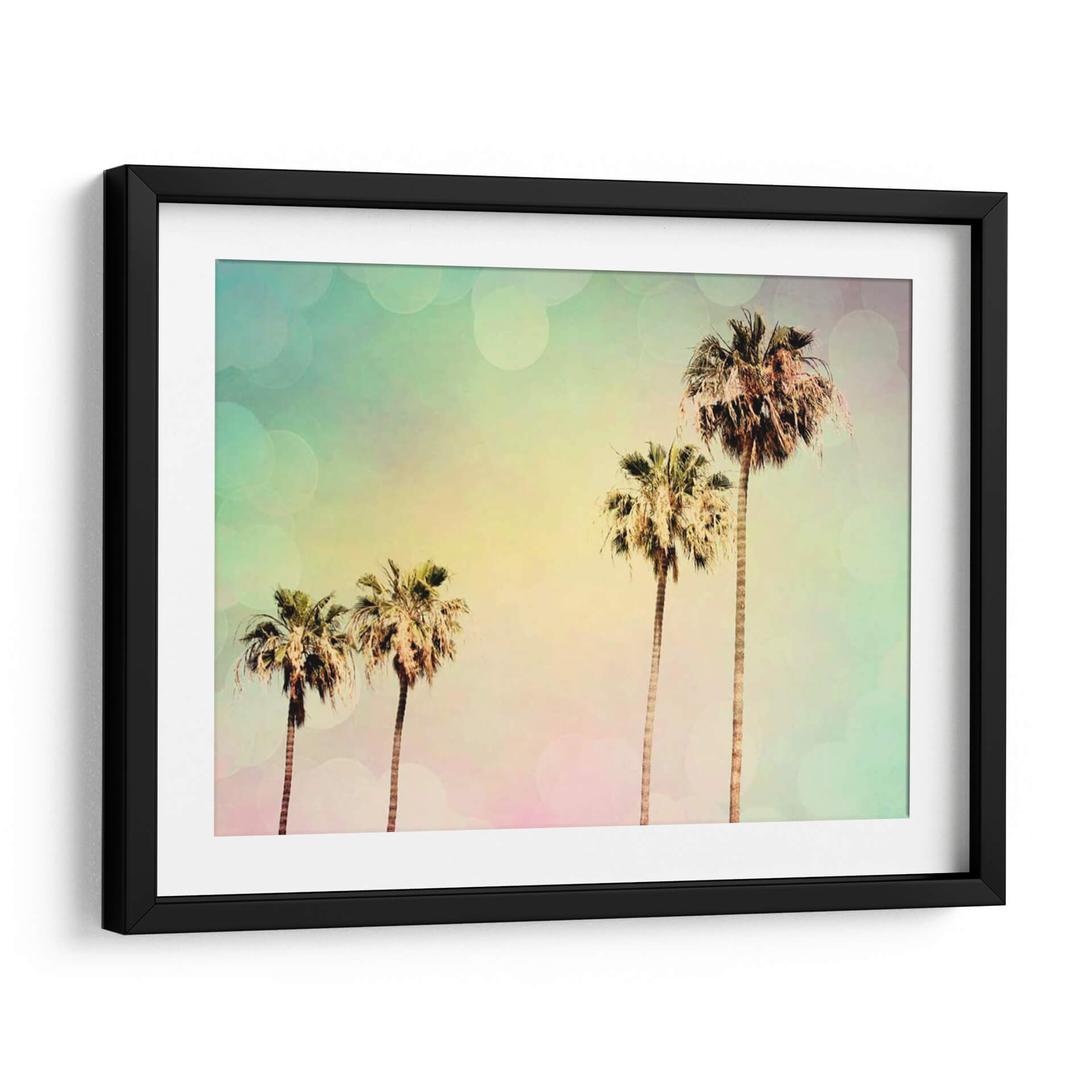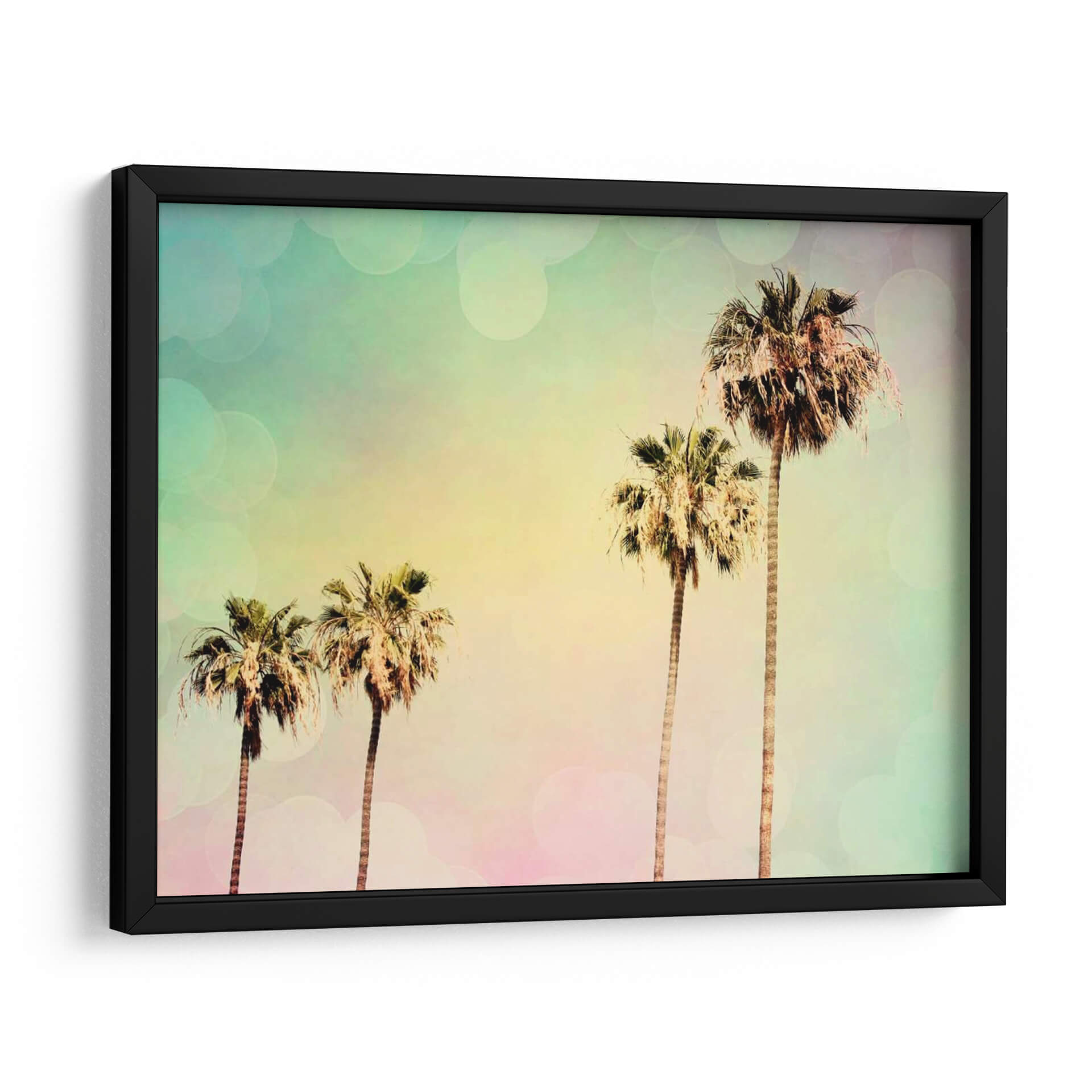 Evoca la serenidad y el encanto del trópico con este cautivador cuadro decorativo de palmeras. La obra, titulada 'Palmeras II' de la artista Sylvia Coomes, presenta una escena idílica donde cuatro esbeltas palmeras se alzan contra un cielo etéreo. Los colores pastel, que transitan suavemente del verde menta al amarillo cálido y al rosa suave, crean una atmósfera soñadora y relajante. Las sutiles bokeh o luces difuminadas añaden un toque mágico y etéreo, transportándote a un paraíso vacacional. El estilo fotográfico con un tratamiento de color vintage y texturas suaves confiere a la pieza una cualidad nostálgica y artística. Este cuadro es ideal para infundir calma y un toque de escapismo en cualquier espacio, desde dormitorios y salas de estar hasta oficinas o estudios. Su composición vertical y la vibrante paleta de colores lo convierten en un punto focal perfecto para añadir vida y personalidad a tus paredes. Transforma tu hogar en un oasis de tranquilidad con esta hermosa representación de la naturaleza.