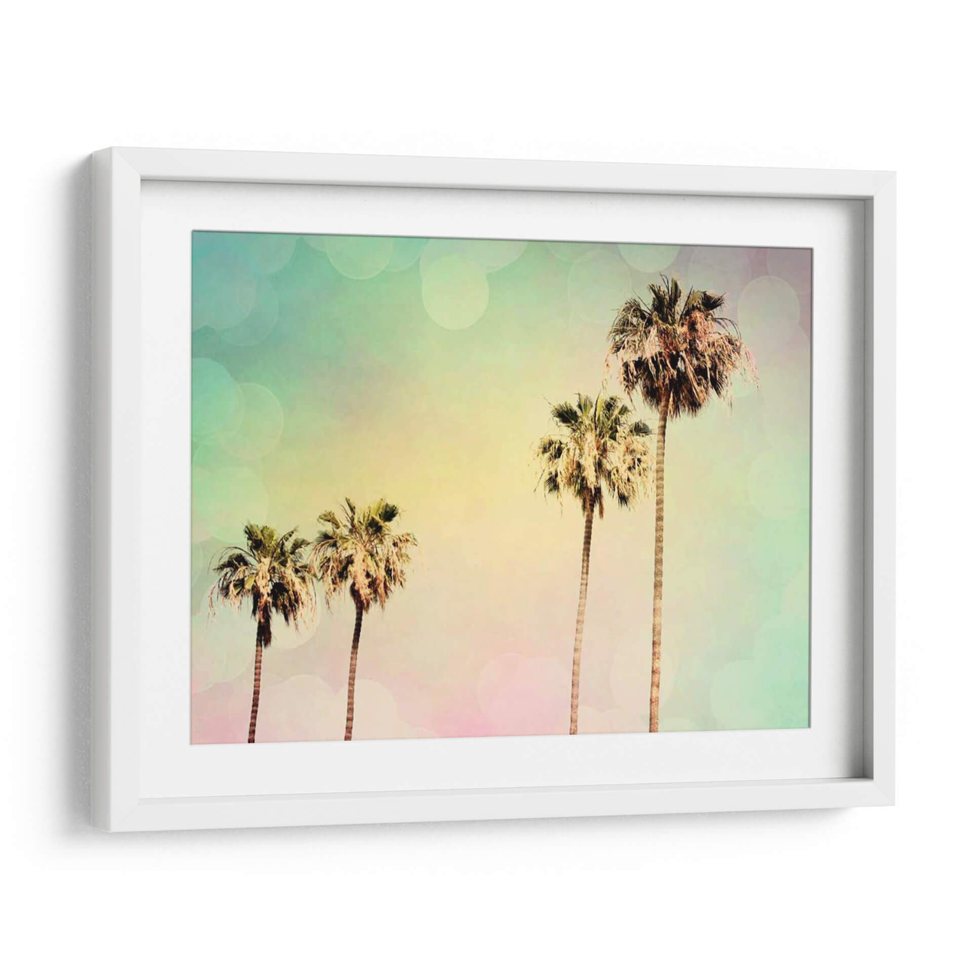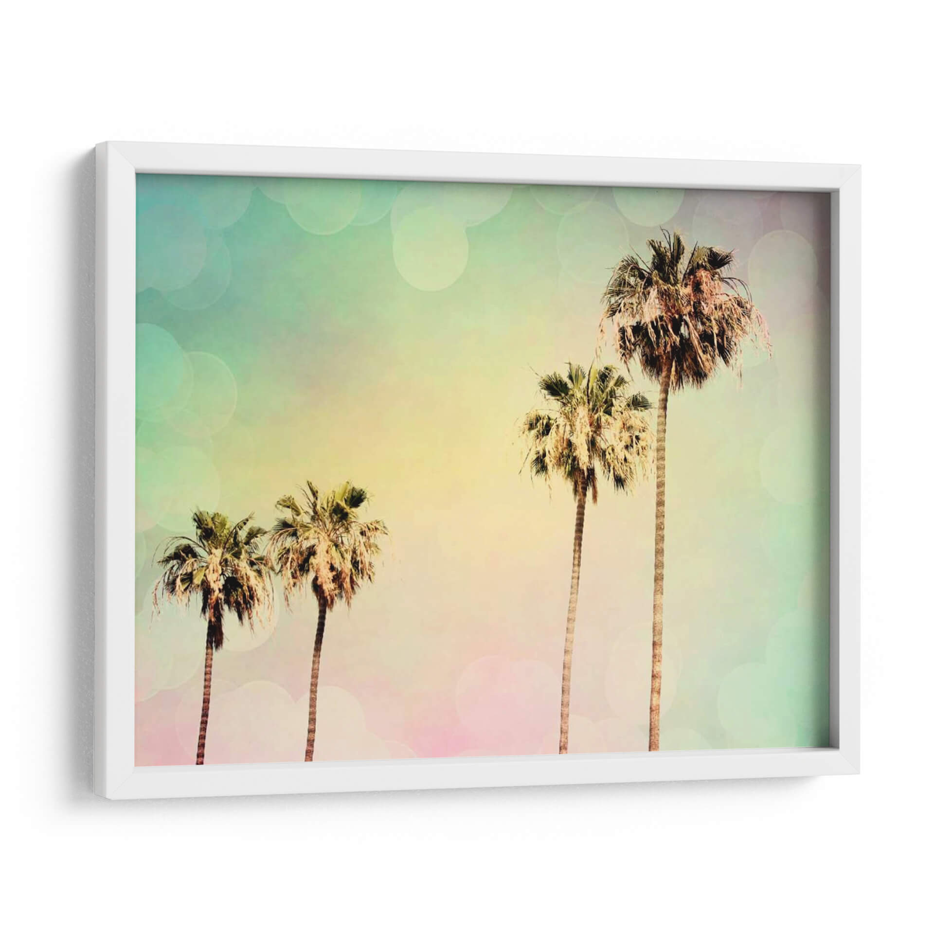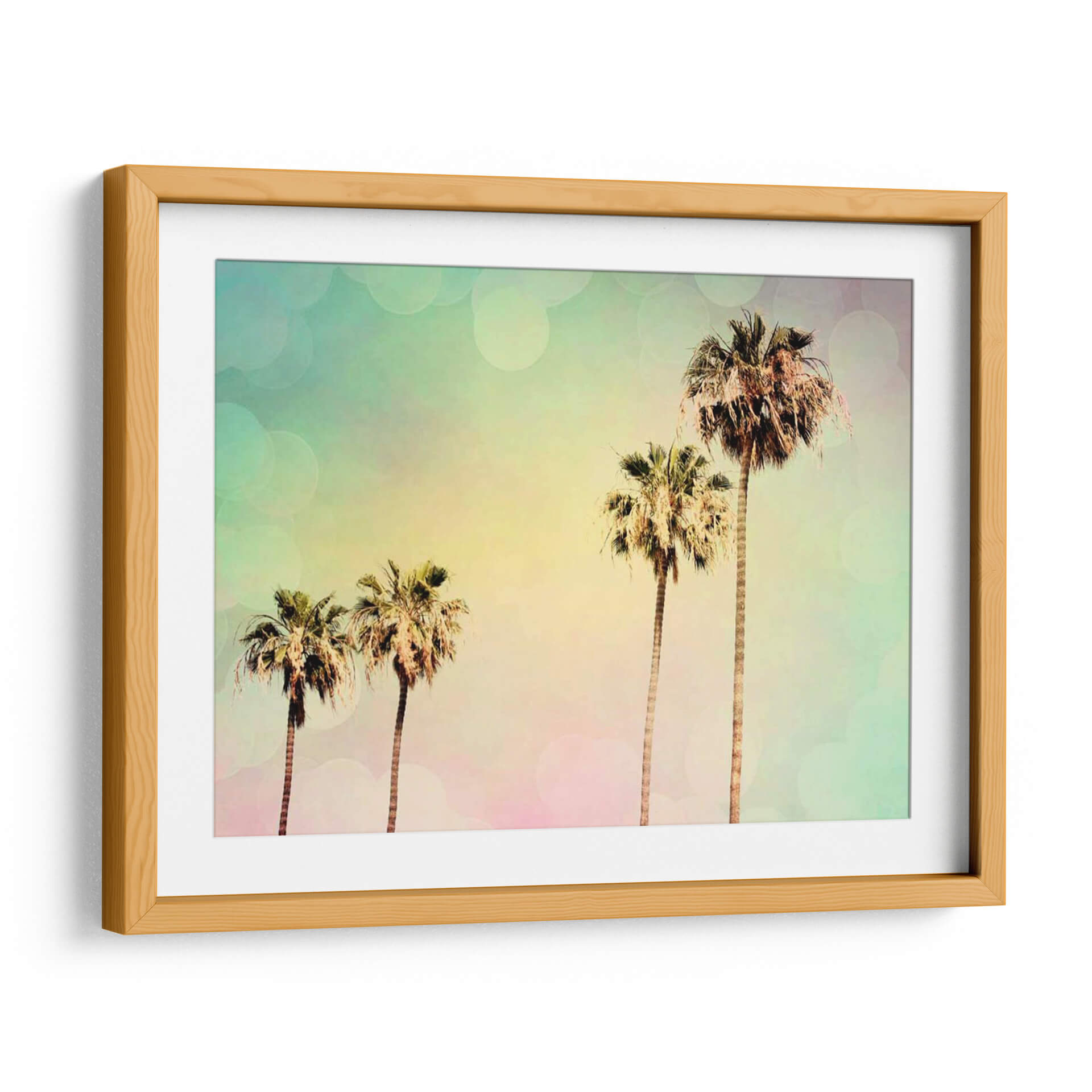Evoca la serenidad y el encanto del trópico con este cautivador cuadro decorativo de palmeras. La obra, titulada 'Palmeras II' de la artista Sylvia Coomes, presenta una escena idílica donde cuatro esbeltas palmeras se alzan contra un cielo etéreo. Los colores pastel, que transitan suavemente del verde menta al amarillo cálido y al rosa suave, crean una atmósfera soñadora y relajante. Las sutiles bokeh o luces difuminadas añaden un toque mágico y etéreo, transportándote a un paraíso vacacional. El estilo fotográfico con un tratamiento de color vintage y texturas suaves confiere a la pieza una cualidad nostálgica y artística. Este cuadro es ideal para infundir calma y un toque de escapismo en cualquier espacio, desde dormitorios y salas de estar hasta oficinas o estudios. Su composición vertical y la vibrante paleta de colores lo convierten en un punto focal perfecto para añadir vida y personalidad a tus paredes. Transforma tu hogar en un oasis de tranquilidad con esta hermosa representación de la naturaleza.