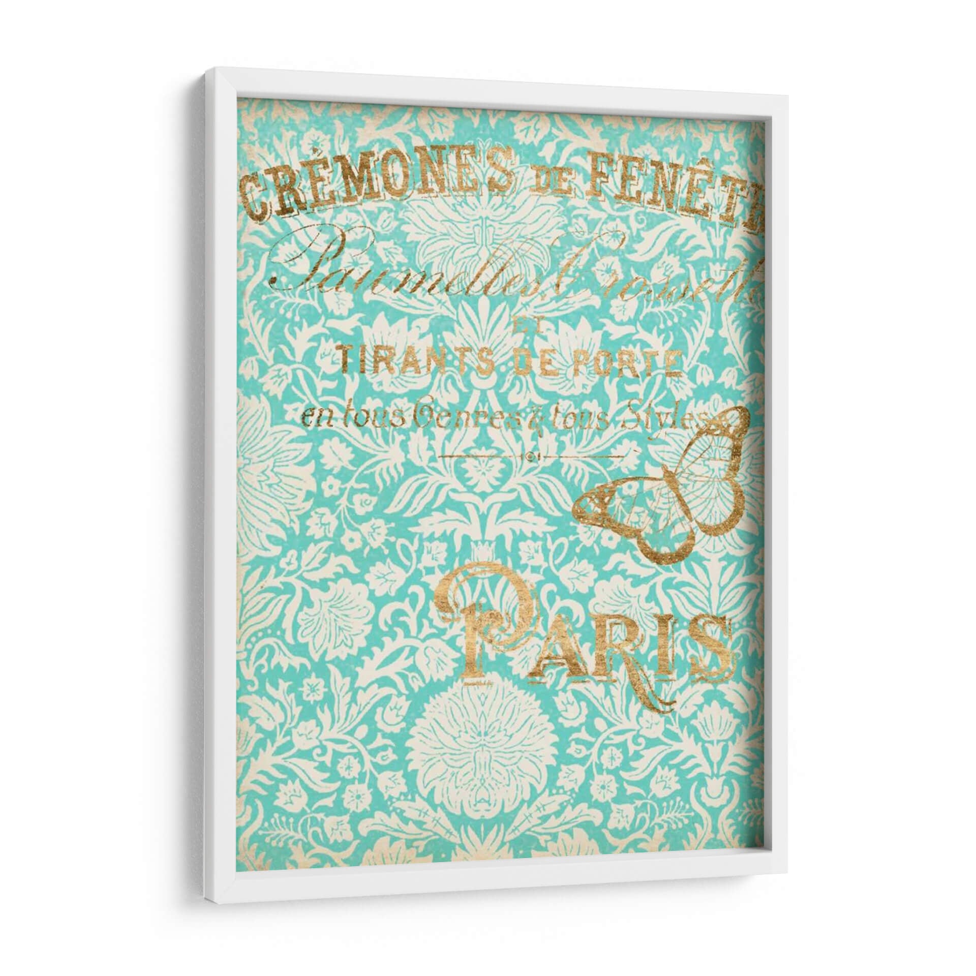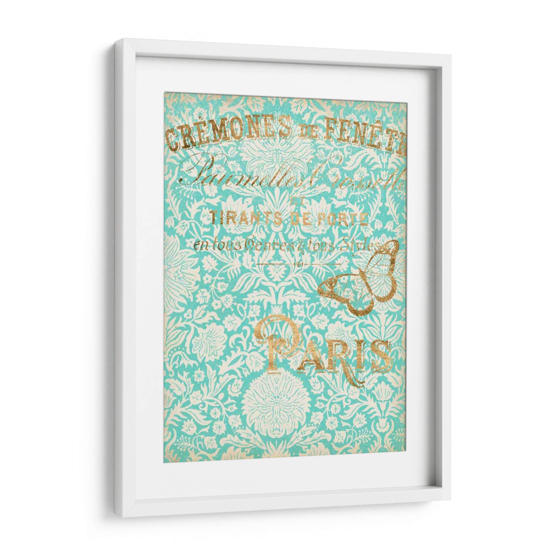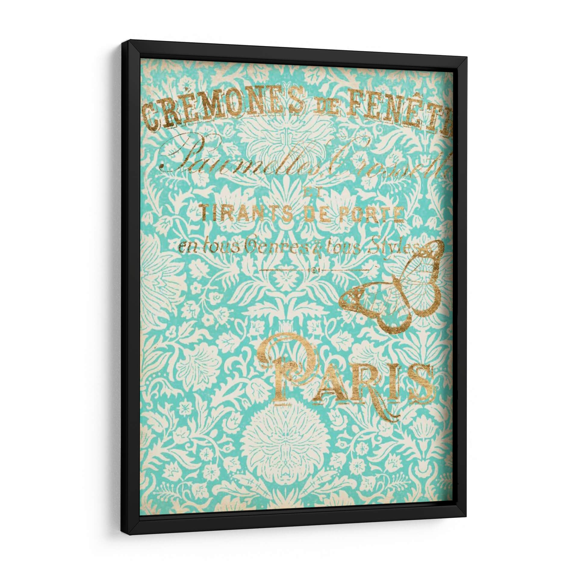 Sumérgete en la elegancia atemporal de "París En Oro II", una obra de arte que evoca la sofisticación y el encanto de la capital francesa. Este cuadro decorativo presenta un intrincado patrón floral en tonos turquesa y blanco, adornado con detalles dorados que aportan un toque de lujo y calidez. La composición visual se ve realzada por elegantes tipografías y la delicada silueta de una mariposa dorada, elementos que transportan a una época de refinamiento y estilo. La paleta de colores, dominada por el vibrante turquesa y el brillante oro, crea una atmósfera de serenidad y distinción, perfecta para añadir un acento de color y personalidad a cualquier espacio. Ideal para salones, comedores o estudios que busquen una pieza de conversación con un aire vintage y chic. Este cuadro decorativo, inspirado en la estética parisina, es una elección acertada para quienes aprecian el arte detallado y los diseños que fusionan lo clásico con lo contemporáneo, añadiendo un toque de distinción inigualable a tu decoración.