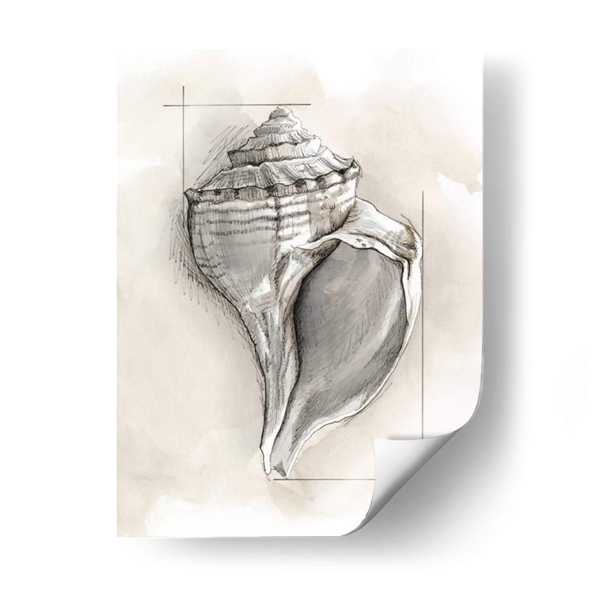Sumérgete en la belleza serena de 'Shell Esquemático I', una obra de arte cautivadora que captura la elegancia natural de una caracola. A través de trazos delicados y una paleta de colores suaves, esta pieza evoca una sensación de calma y conexión con el mar. El estilo detallado, que combina el boceto a lápiz con sutiles toques de acuarela en tonos tierra y grises, otorga profundidad y textura a la representación de la concha. La composición, centrada y definida por líneas geométricas sutiles, dirige la mirada hacia la intrincada espiral y la apertura de la caracola, invitando a la contemplación. Este cuadro decorativo es perfecto para añadir un toque de sofisticación orgánica a cualquier espacio, desde un sereno dormitorio hasta una sala de estar moderna o un tranquilo estudio. Su diseño atemporal y su atmósfera relajante lo convierten en una elección ideal para aquellos que buscan infundir paz y armonía en su hogar u oficina. Descubre la esencia del océano y la maestría del arte en esta pieza única de Megan Meagher.