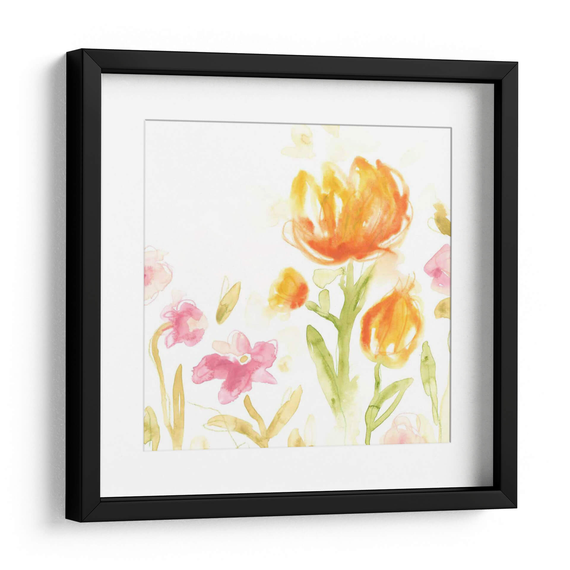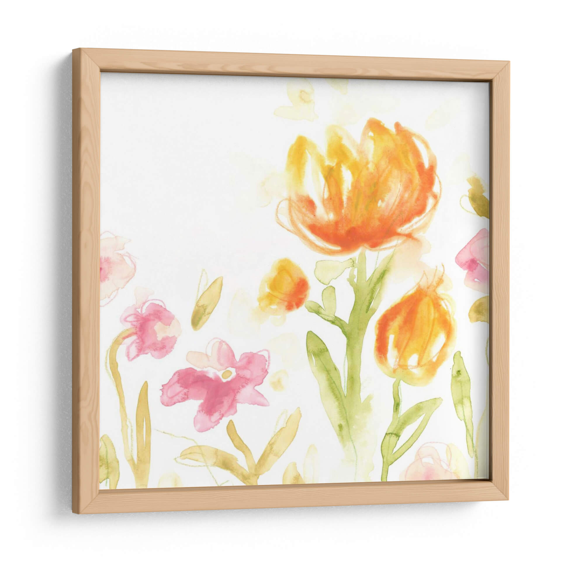 Sumérgete en la delicadeza floral de "Southern Sayings II", una obra de arte contemporáneo que captura la esencia de un jardín en flor con una técnica de acuarela etérea. La pieza presenta un despliegue vibrante de tulipanes y flores estilizadas en tonos cálidos de naranja, amarillo y rosa, contrastando suavemente con el fondo blanco y las hojas en verdes y ocres. La pincelada suelta y la transparencia de la acuarela evocan una sensación de ligereza y frescura, como si la brisa moviera suavemente los pétalos. Este cuadro decorativo es ideal para infundir alegría y un toque de naturaleza en cualquier espacio, desde una sala de estar luminosa hasta un dormitorio acogedor o un estudio inspirador. Su estilo abstracto-figurativo permite una interpretación personal, conectando con la belleza efímera de la naturaleza. "Southern Sayings II" es una invitación a la serenidad y a la celebración de la vida a través del color y la forma, una adición perfecta para quienes buscan un arte que eleve el espíritu y embellezca su hogar u oficina.
