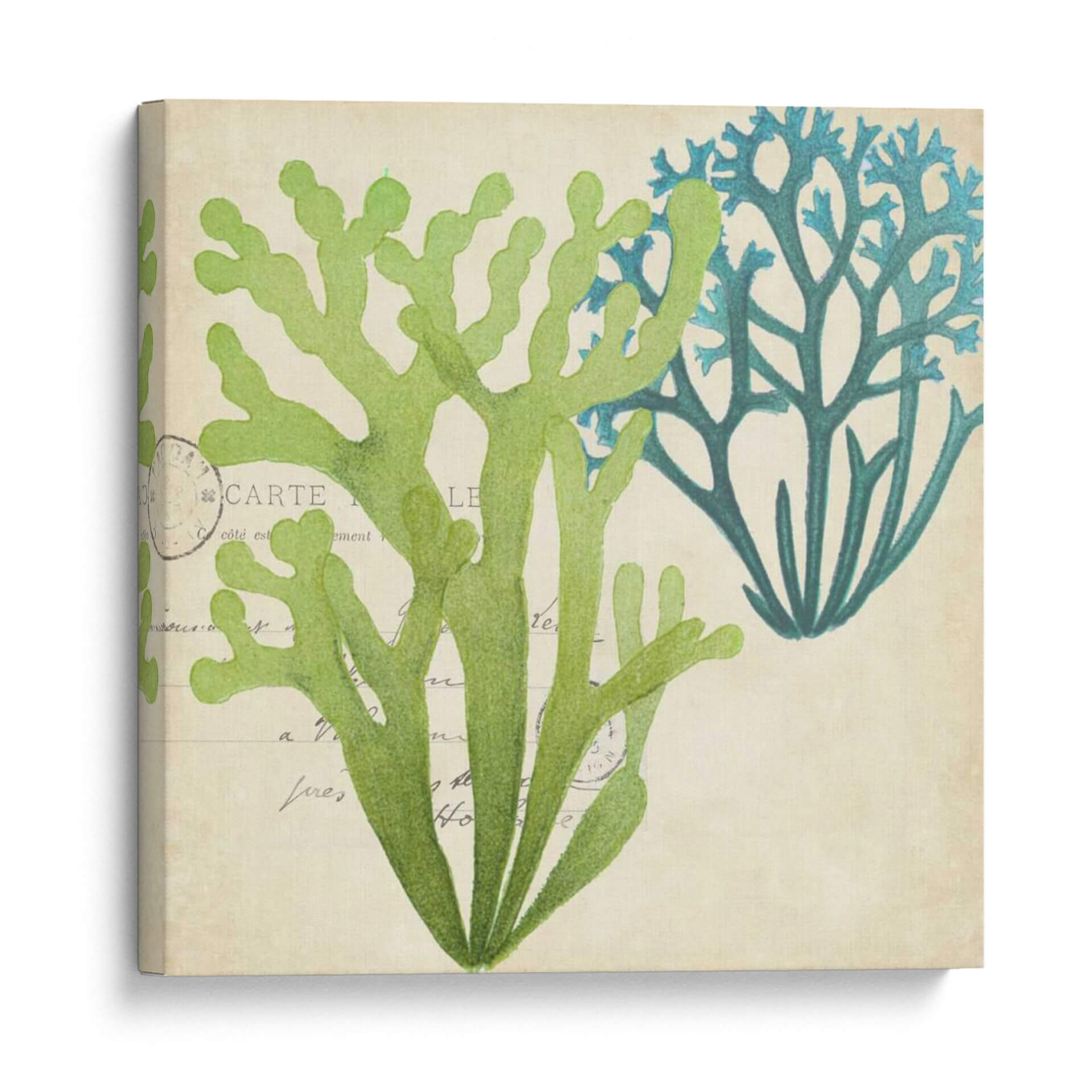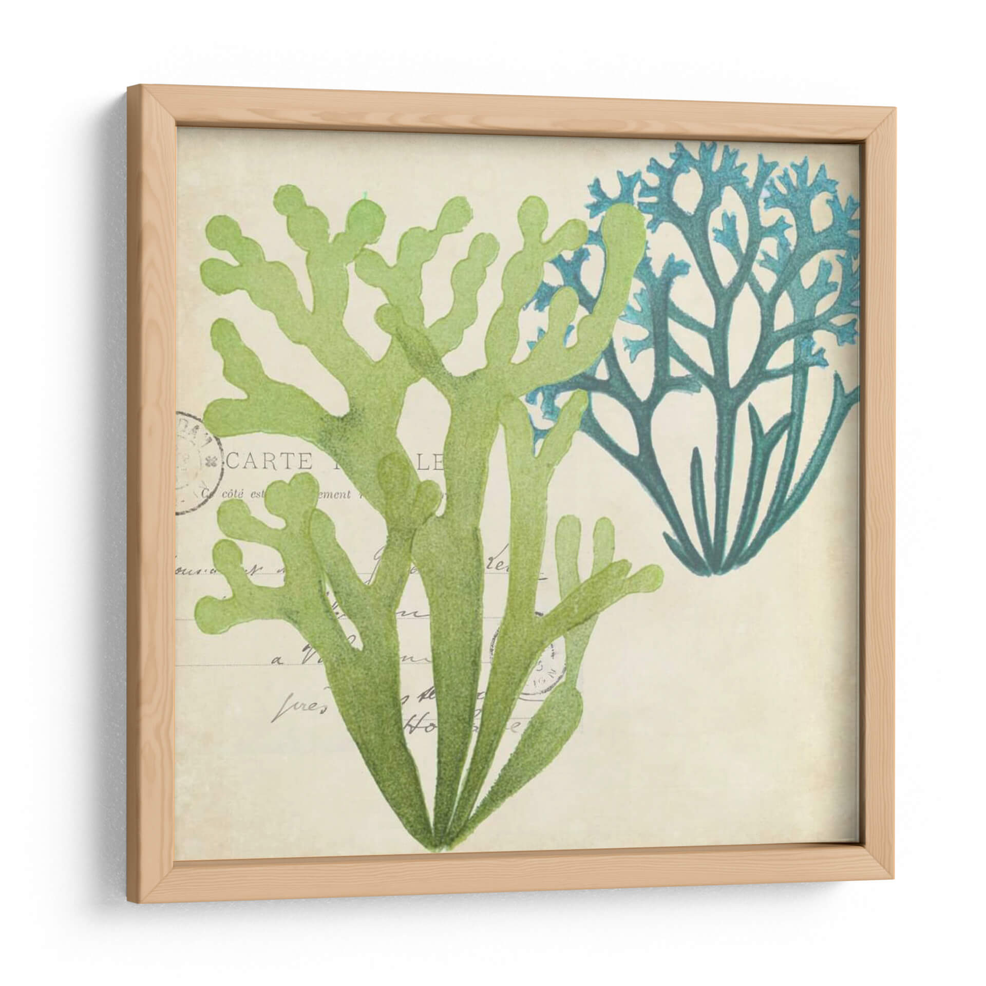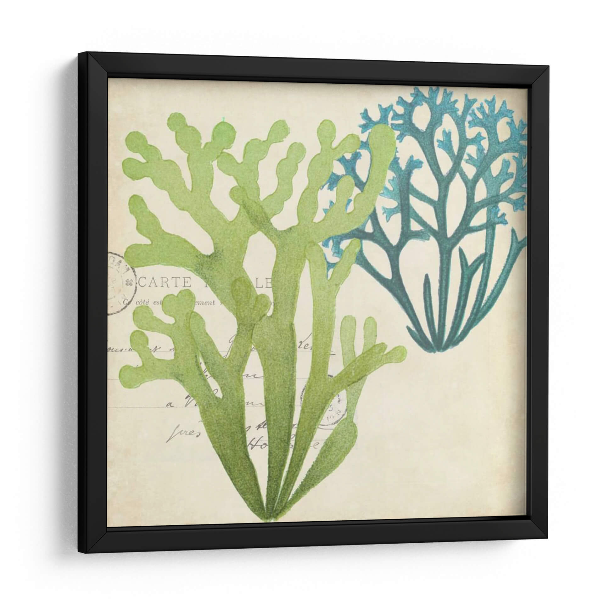 Sumérgete en la serenidad del océano con este exquisito cuadro decorativo que presenta una delicada superposición de algas marinas. La obra captura la belleza orgánica de la vida marina con un estilo que evoca ilustraciones botánicas clásicas, pero con un toque contemporáneo. Los tonos verdes vibrantes y los azules profundos de las algas contrastan armoniosamente sobre un fondo texturizado de color beige, que simula antiguos manuscritos o postales, añadiendo una capa de profundidad y nostalgia. La composición, centrada en la forma intrincada y ramificada de las algas, invita a la contemplación y aporta una sensación de calma y conexión con la naturaleza. Este cuadro decorativo es perfecto para infundir tranquilidad en tu dormitorio, aportar un toque de frescura a un baño inspirado en el mar, o como pieza focal en una sala de estar que busca reflejar la serenidad costera. Su diseño atemporal y su paleta de colores relajante lo convierten en una adición versátil y elegante a cualquier espacio que necesite un respiro visual y una pincelada de la belleza del mundo subacuático.
