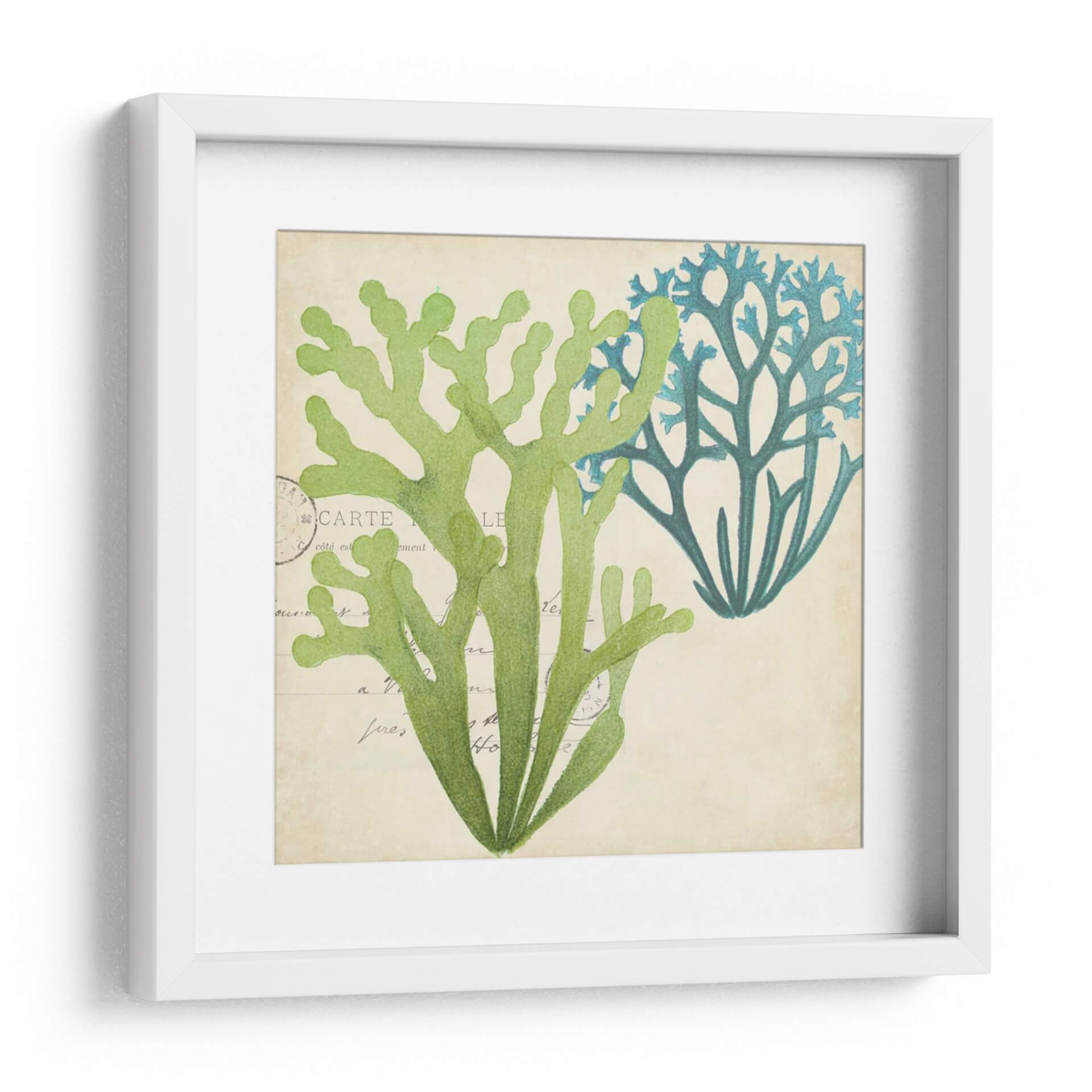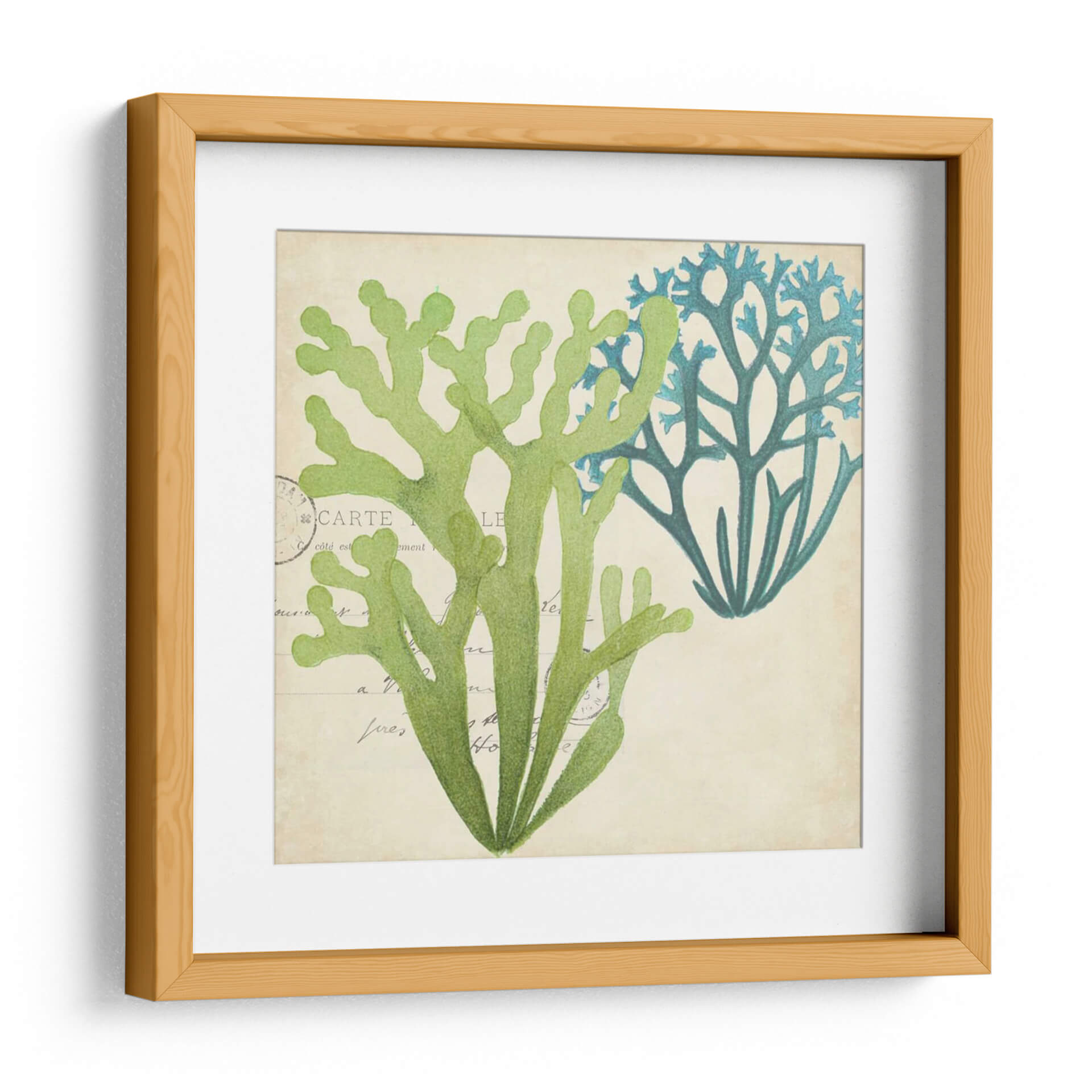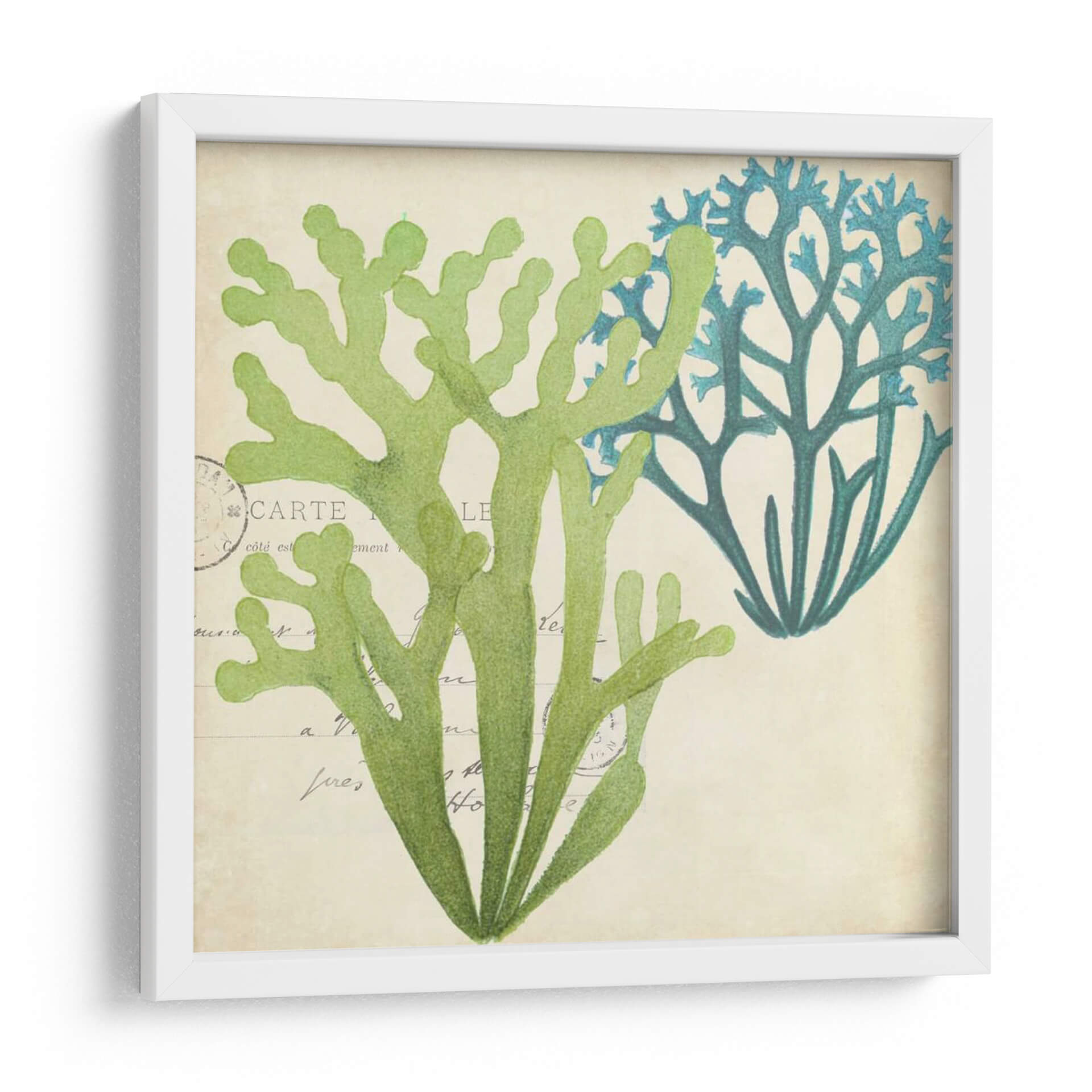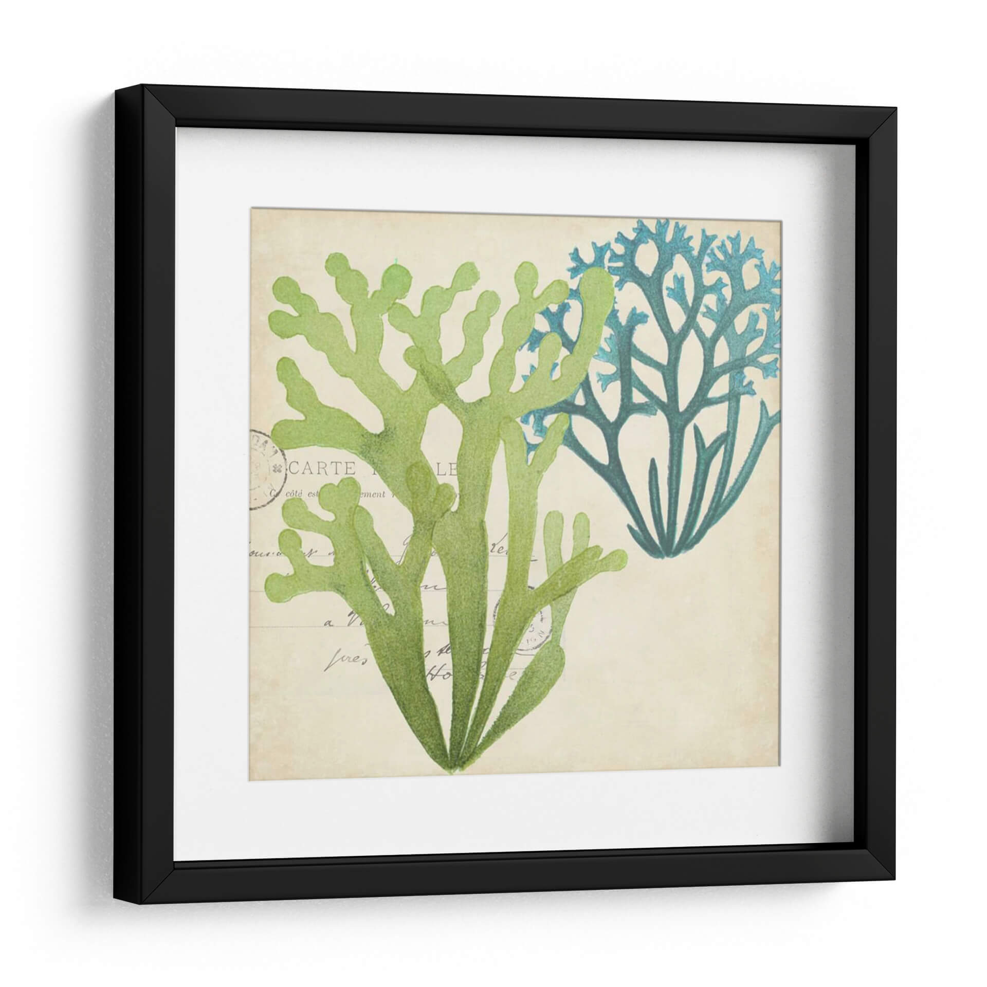 Sumérgete en la serenidad del océano con este exquisito cuadro decorativo que presenta una delicada superposición de algas marinas. La obra captura la belleza orgánica de la vida marina con un estilo que evoca ilustraciones botánicas clásicas, pero con un toque contemporáneo. Los tonos verdes vibrantes y los azules profundos de las algas contrastan armoniosamente sobre un fondo texturizado de color beige, que simula antiguos manuscritos o postales, añadiendo una capa de profundidad y nostalgia. La composición, centrada en la forma intrincada y ramificada de las algas, invita a la contemplación y aporta una sensación de calma y conexión con la naturaleza. Este cuadro decorativo es perfecto para infundir tranquilidad en tu dormitorio, aportar un toque de frescura a un baño inspirado en el mar, o como pieza focal en una sala de estar que busca reflejar la serenidad costera. Su diseño atemporal y su paleta de colores relajante lo convierten en una adición versátil y elegante a cualquier espacio que necesite un respiro visual y una pincelada de la belleza del mundo subacuático.