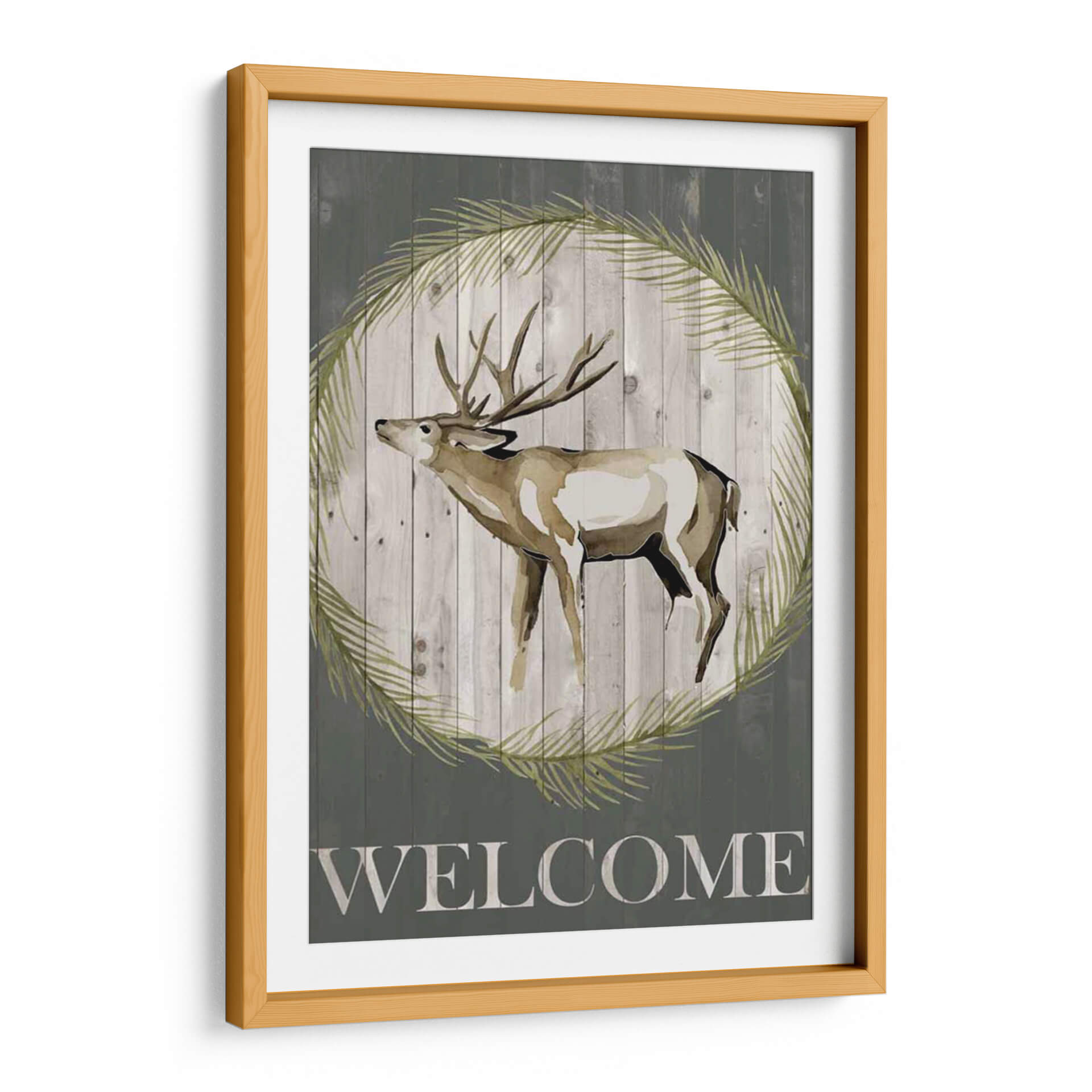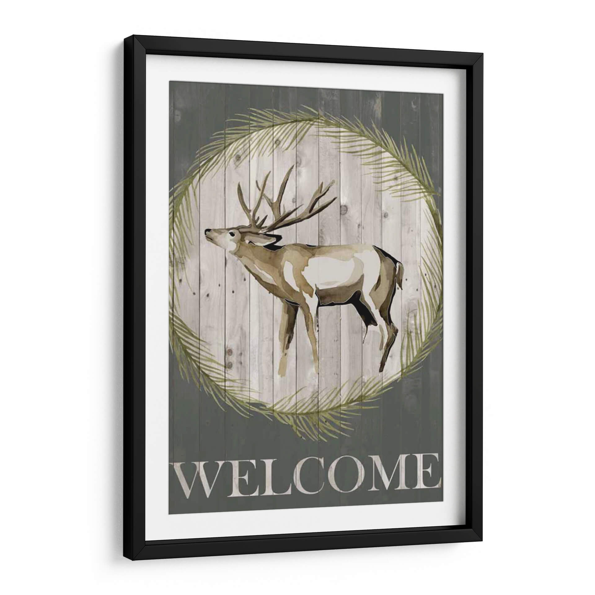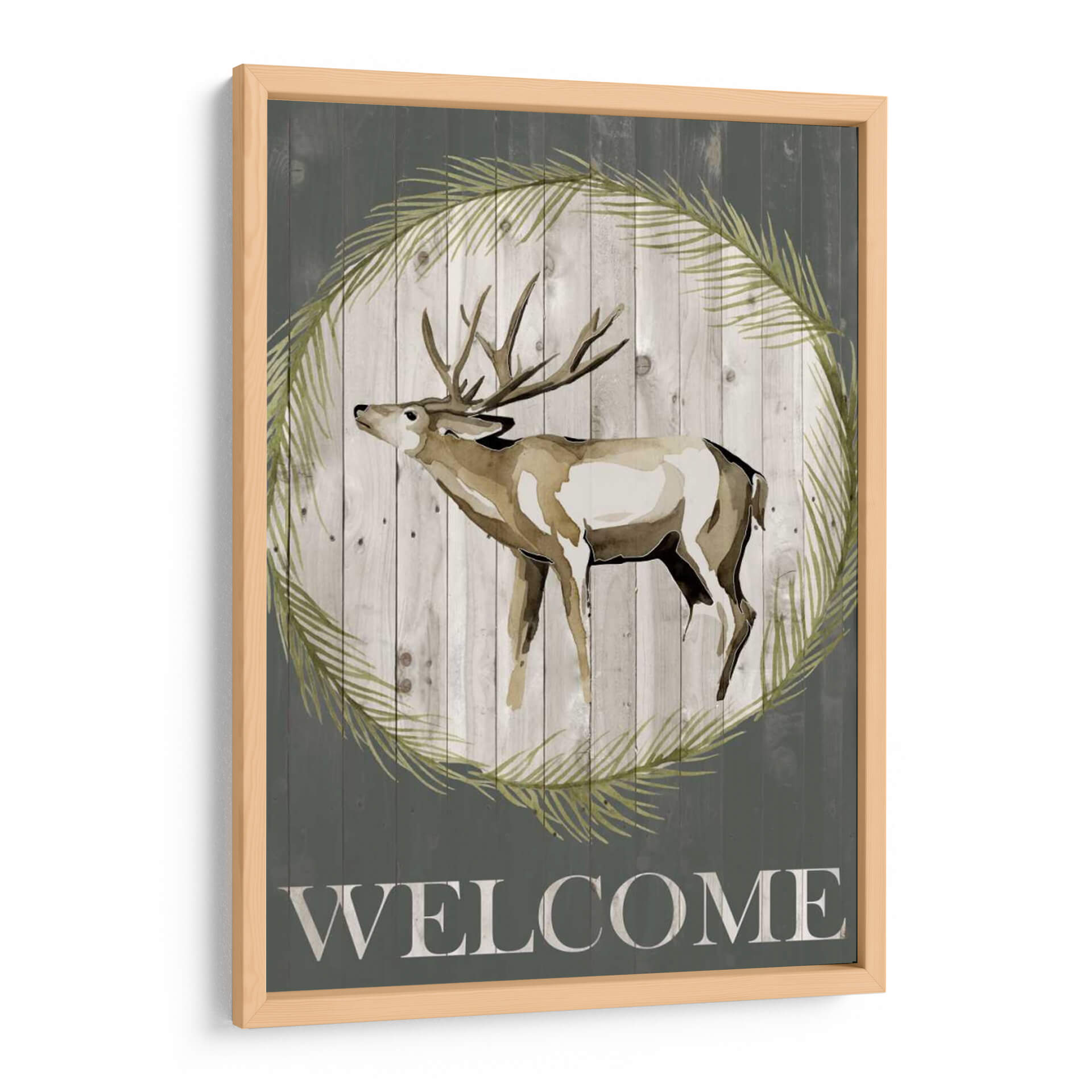 Da la bienvenida a tus invitados con el encantador cuadro decorativo "Woodland Bienvenido I" de Grace Popp. Esta obra de arte captura la majestuosidad de un ciervo de cola blanca, representado con trazos acuarelados que evocan la delicadeza de la naturaleza. La figura del ciervo se presenta enmarcada por una corona de hojas verdes, sobre un fondo rústico de tablones de madera grisácea, creando una atmósfera serena y acogedora. La palabra "WELCOME" inscrita en la parte inferior refuerza su propósito de hospitalidad, haciendo de esta pieza un punto focal ideal para recibidores, salas de estar o estudios con un toque rústico o de inspiración campestre. La paleta de colores, dominada por tonos tierra, verdes suaves y grises, aporta calma y naturalidad a cualquier espacio. Este cuadro decorativo es perfecto para quienes buscan añadir un elemento de la vida silvestre y un sentimiento de bienvenida a su hogar, combinando arte contemporáneo con un aire rústico y atemporal. Su estilo artístico, con influencias de acuarela y un toque de arte digital, lo convierte en una adición única a tu decoración.
