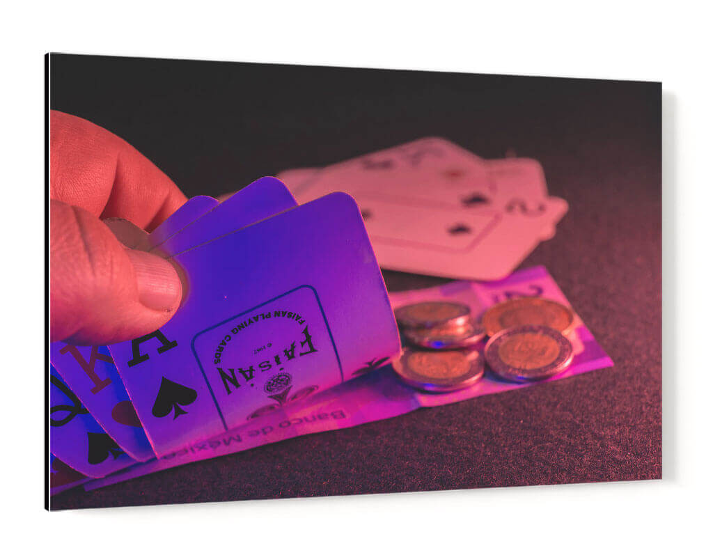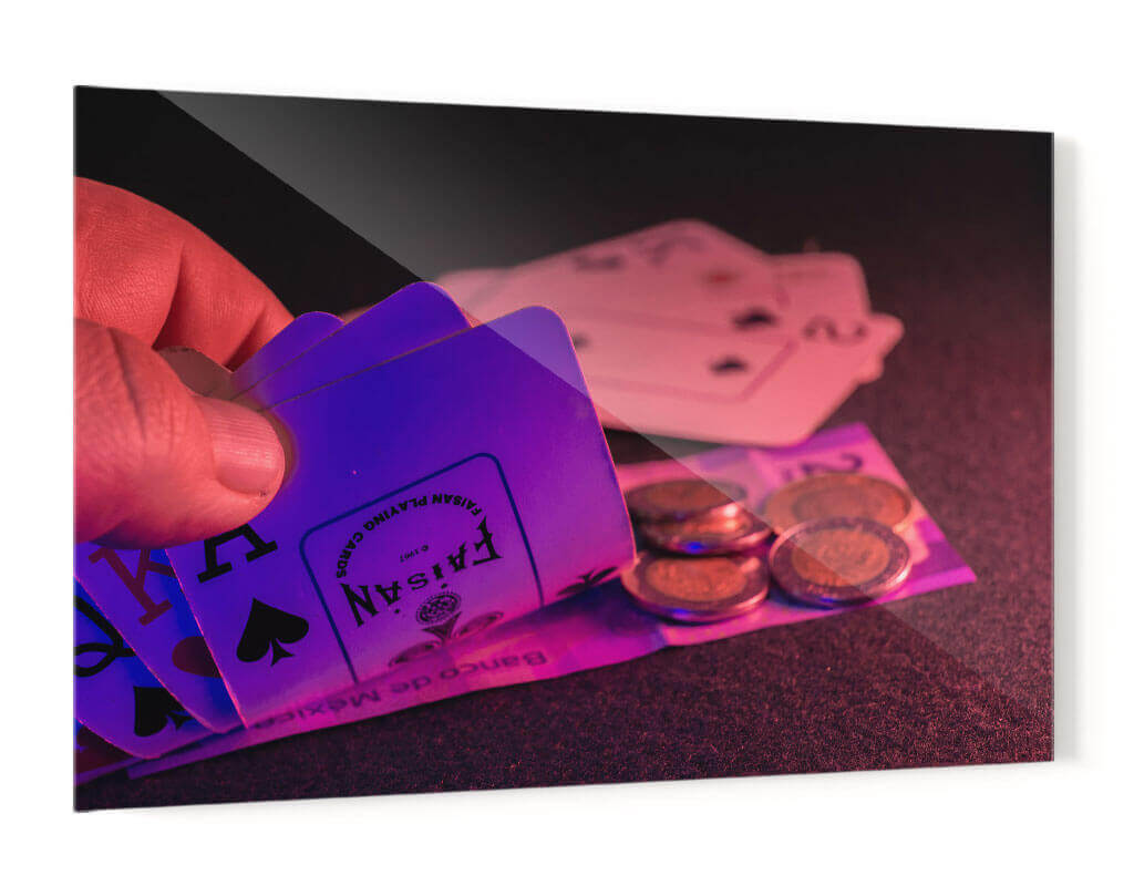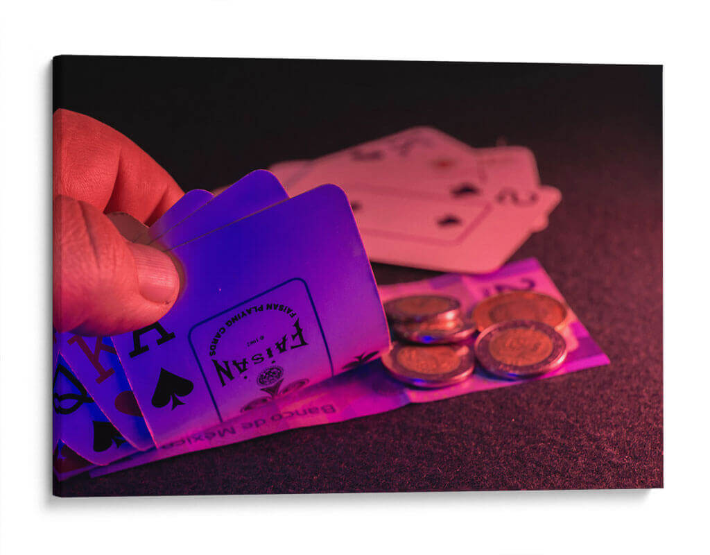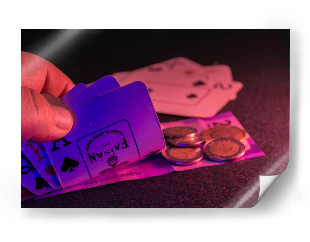 Sumérgete en el intrigante mundo del juego con "Póquer I", una obra de arte contemporáneo que captura la esencia de la estrategia y el azar. Esta pieza visualmente impactante presenta una mano sosteniendo cartas de póquer, con el distintivo logotipo "Faisan" visible, junto a monedas y billetes de banco, todo bañado en una atmósfera de iluminación dramática con tonos púrpuras y rojizos. La composición cercana y el enfoque selectivo invitan a la contemplación de los detalles, creando una sensación de misterio y anticipación. Ideal para espacios que buscan un toque de sofisticación y un guiño a los juegos de mesa o la estrategia, como estudios, salas de estar modernas o bares temáticos. "Póquer I" es más que una imagen; es una invitación a la conversación y a la reflexión sobre la suerte, la habilidad y los momentos decisivos. Añade un elemento de intriga y elegancia a tu decoración con este cautivador cuadro decorativo, perfecto para aquellos que aprecian el arte que cuenta una historia y evoca emociones profundas, transformando cualquier pared en un punto focal lleno de carácter y estilo.