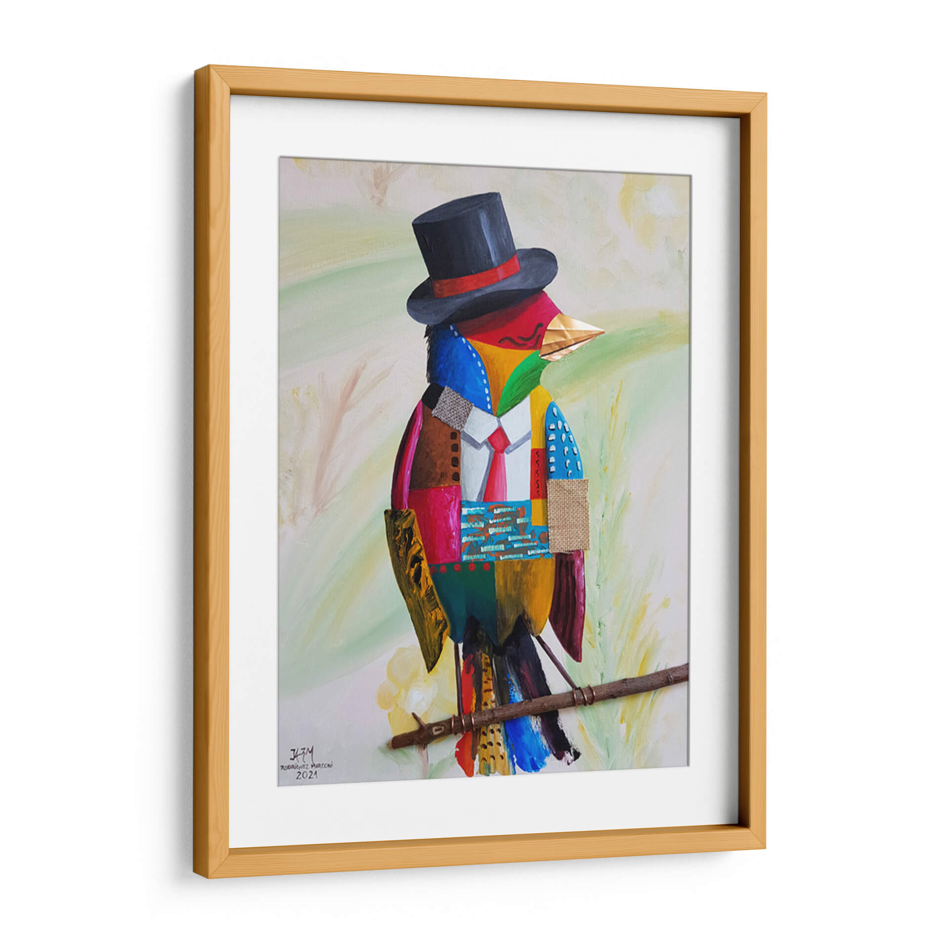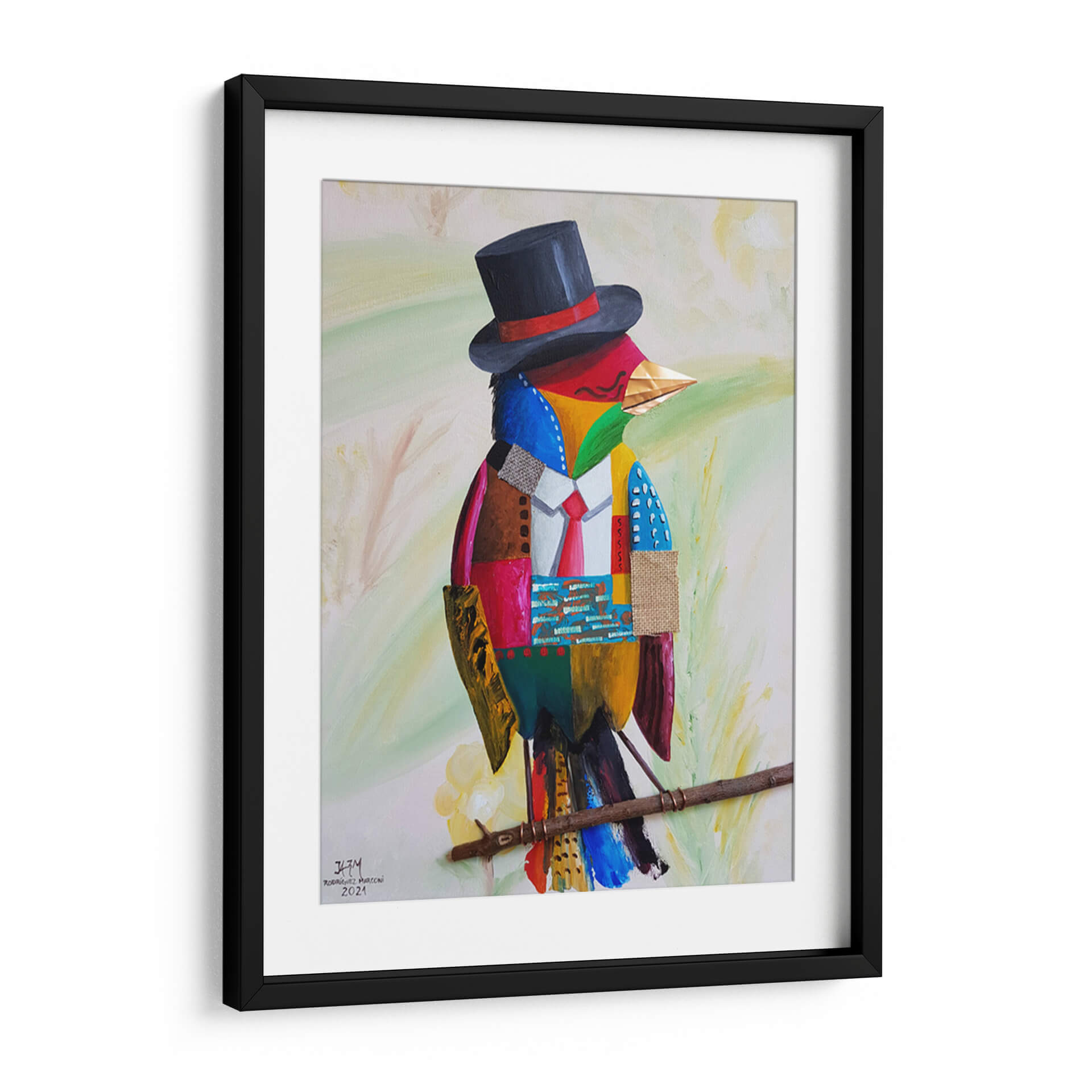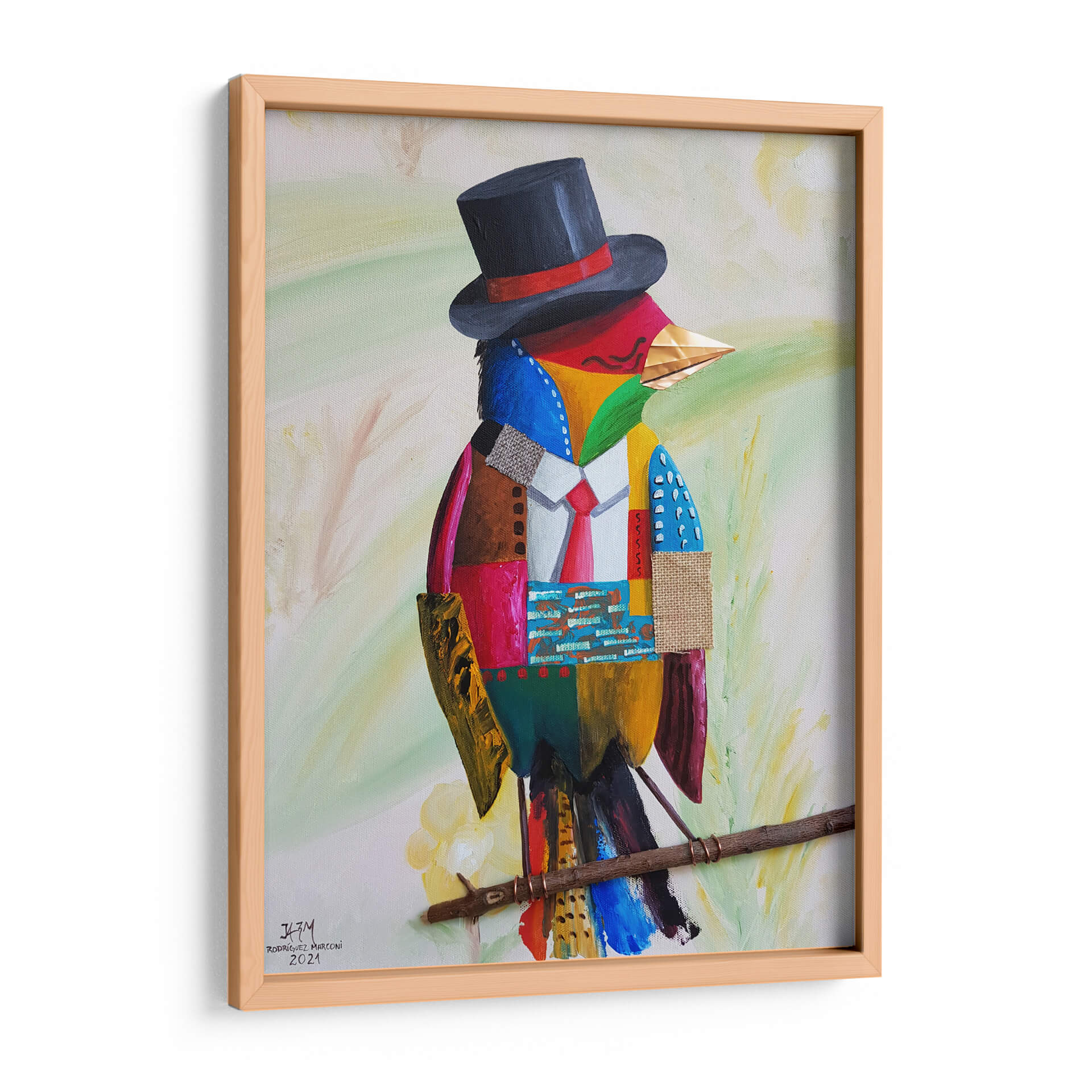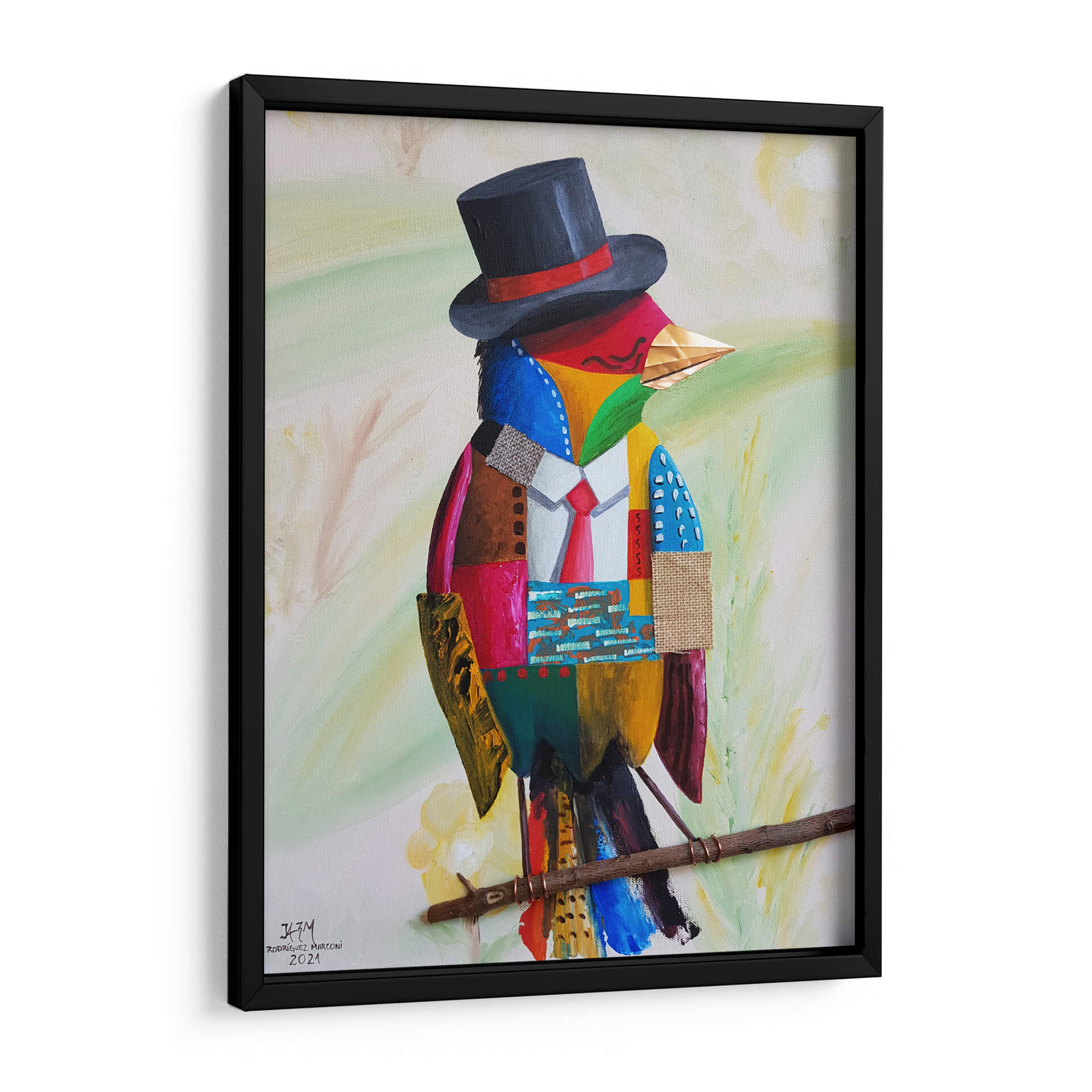 Embárcate en un viaje de imaginación con "Monsieur Pájaro", una obra vibrante y llena de carácter del artista Rodríguez Marconi. Este cautivador cuadro decorativo presenta un pájaro de estilo cubista, vestido elegantemente con un sombrero de copa y corbata roja, capturando una esencia lúdica y sofisticada a la vez. La paleta de colores es un festín visual, con un mosaico de tonos vivos como el azul, el rojo, el amarillo y el verde, combinados con texturas que simulan tela y arpillera, creando una profundidad y un interés táctil únicos. El fondo suavemente difuminado en tonos pastel y tierra permite que el protagonista destaque, invitando a la contemplación. "Monsieur Pájaro" es una pieza que evoca alegría, originalidad y un toque de humor, perfecta para añadir personalidad a cualquier espacio, desde una sala de estar moderna hasta un despacho creativo. Su composición audaz y su estilo contemporáneo lo convierten en un punto focal que sin duda generará conversación, ideal para quienes buscan un arte que rompa con lo convencional y refleje una personalidad audaz y divertida. Añade un toque de arte único a tu decoración con este encantador cuadro.