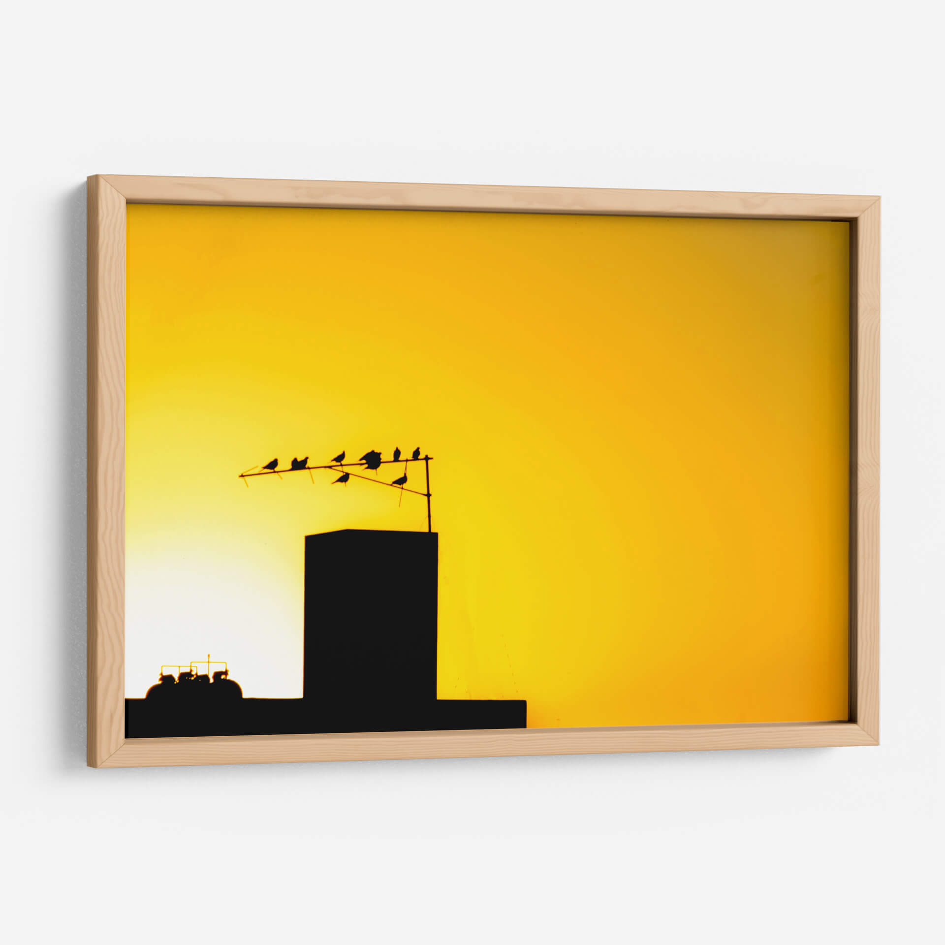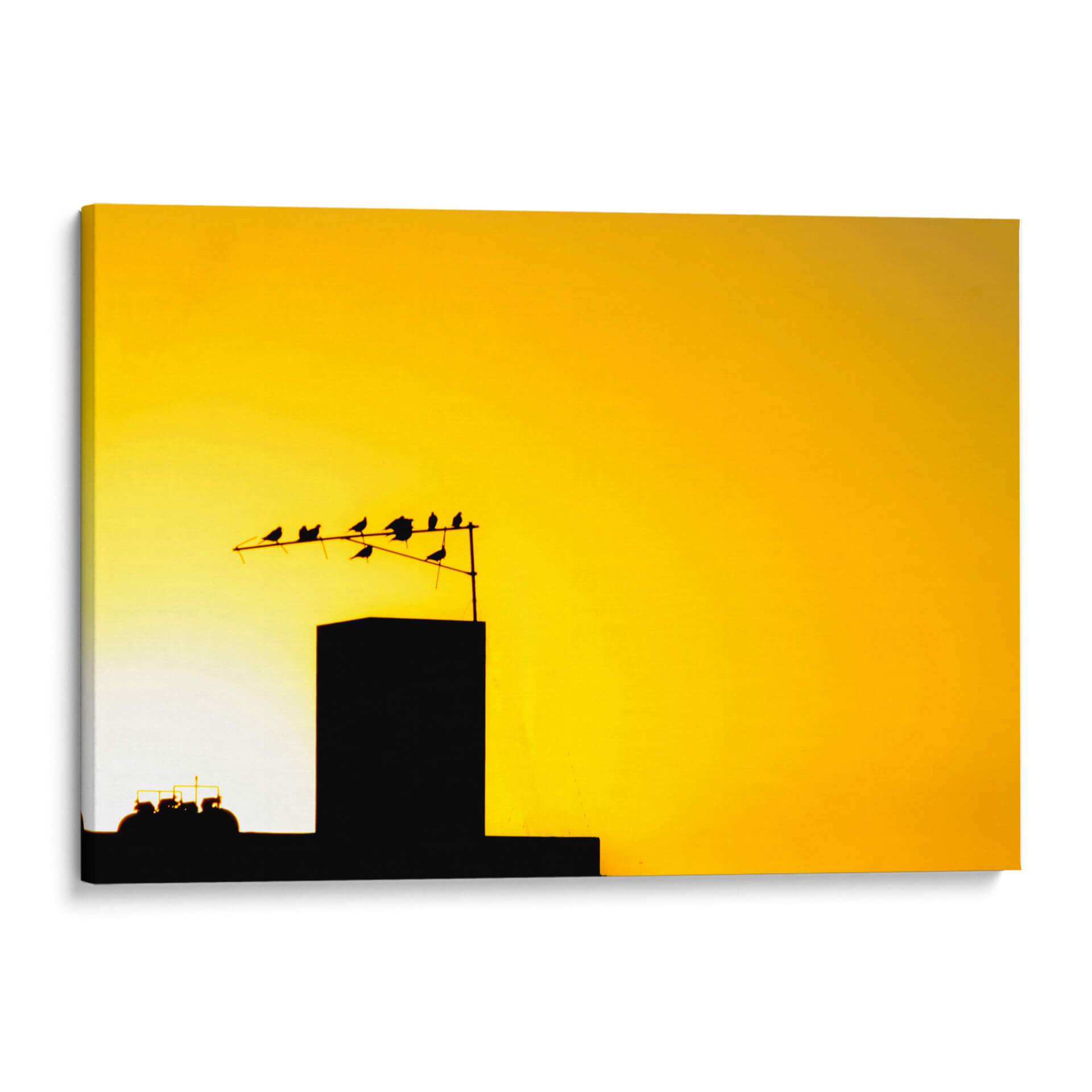 Captura la esencia de un atardecer vibrante con este cautivador cuadro decorativo de "Pájaros al Atardecer" de Dreamer Studio. La obra presenta una silueta urbana minimalista, donde la arquitectura oscura de un edificio se recorta contra un cielo de un intenso color amarillo dorado, evocando la calidez y la serenidad del final del día. Un grupo de pájaros, también en silueta, se posan sobre un tendido, añadiendo un toque de vida y movimiento a la escena. La composición es audaz y gráfica, utilizando el contraste entre las formas oscuras y el brillante fondo para crear un impacto visual inmediato. Los colores predominantes, el amarillo vibrante y los negros profundos, generan una atmósfera de calma, contemplación y un sutil toque de melancolía, ideal para aquellos que buscan añadir un punto de interés reflexivo a su hogar u oficina. Este cuadro decorativo es perfecto para espacios modernos y contemporáneos, aportando un toque de color y una narrativa visual única. Su estilo minimalista y el uso de la silueta lo convierten en una pieza versátil que puede complementar diversas paletas de colores y estilos de mobiliario, invitando a la reflexión y a la admiración por la belleza efímera del crepúsculo.