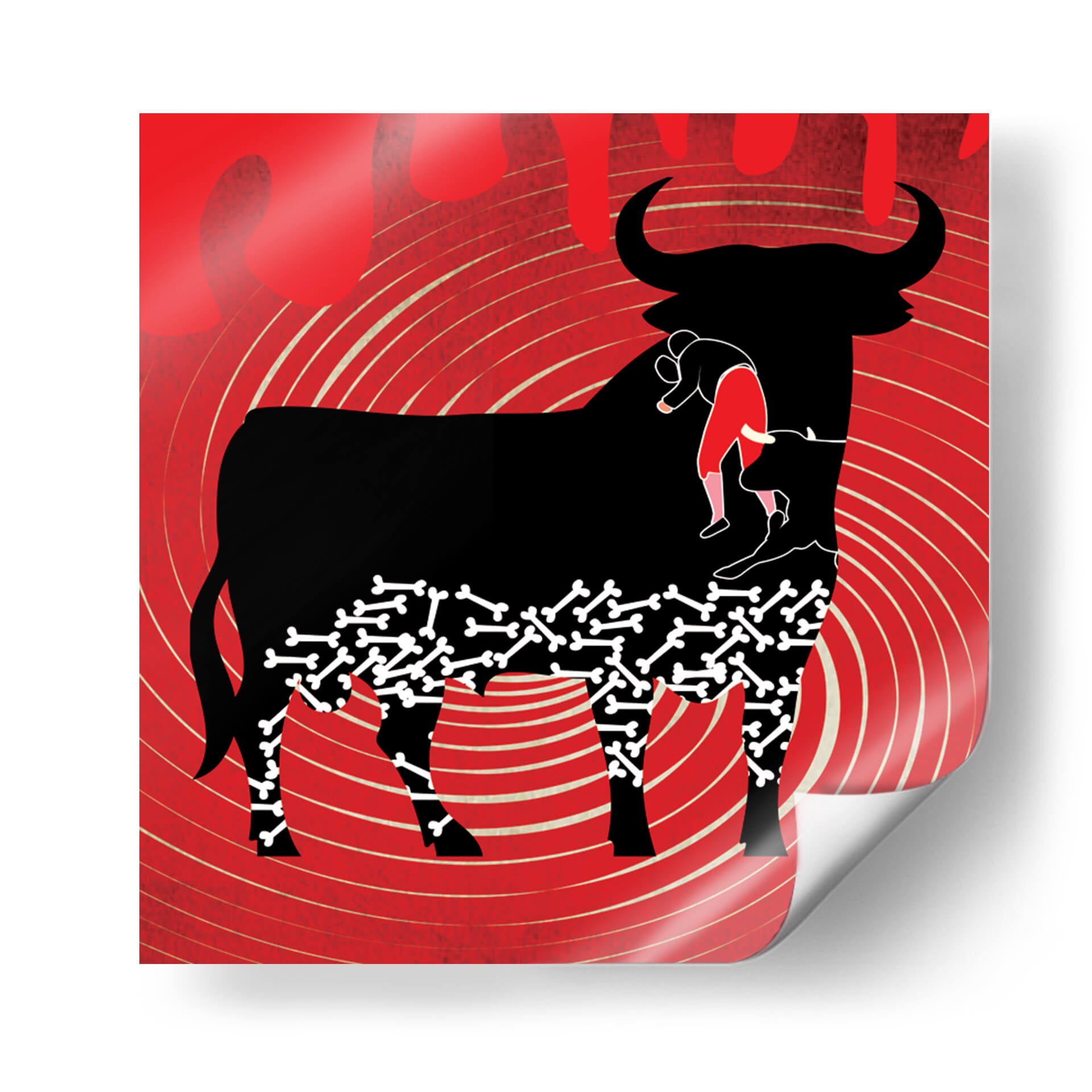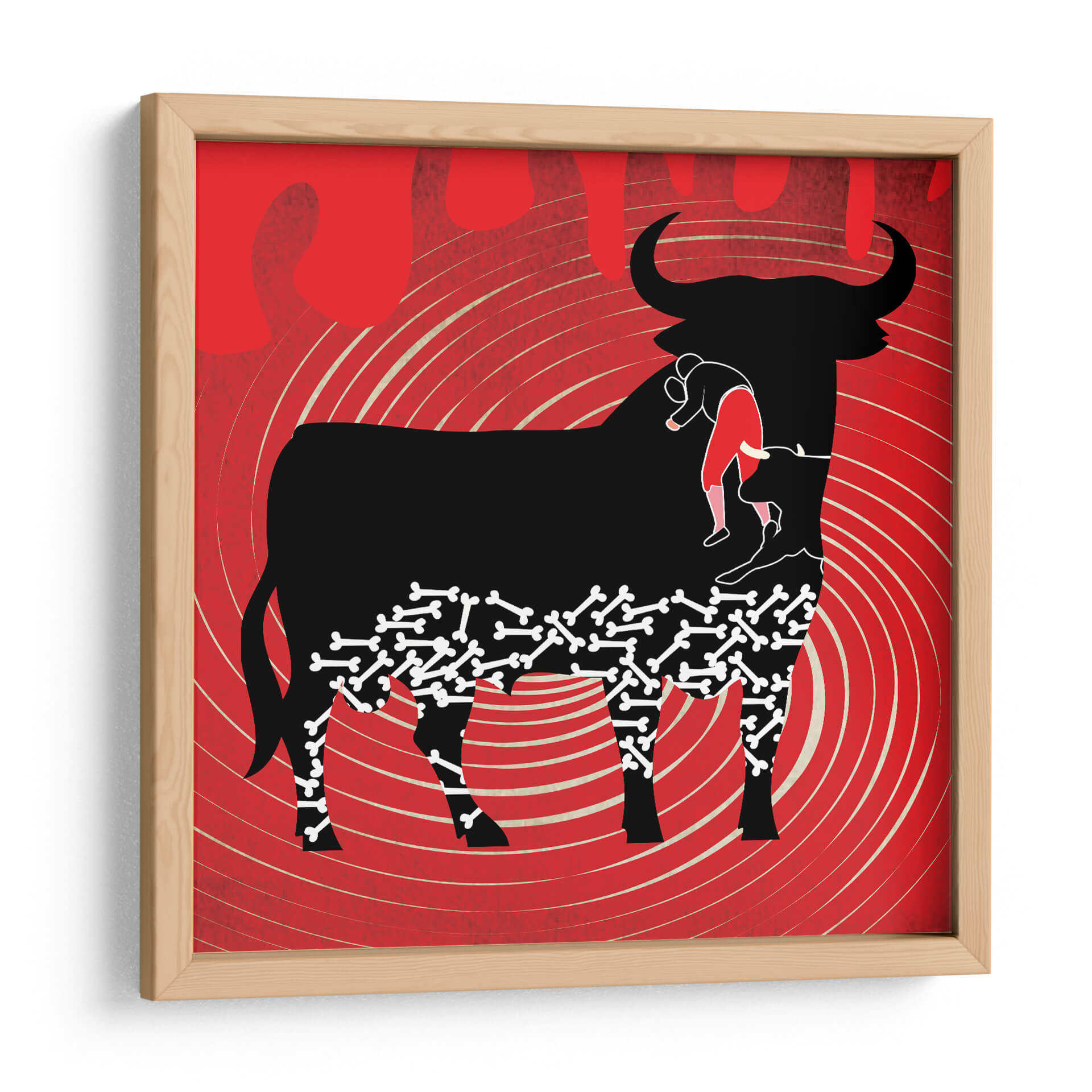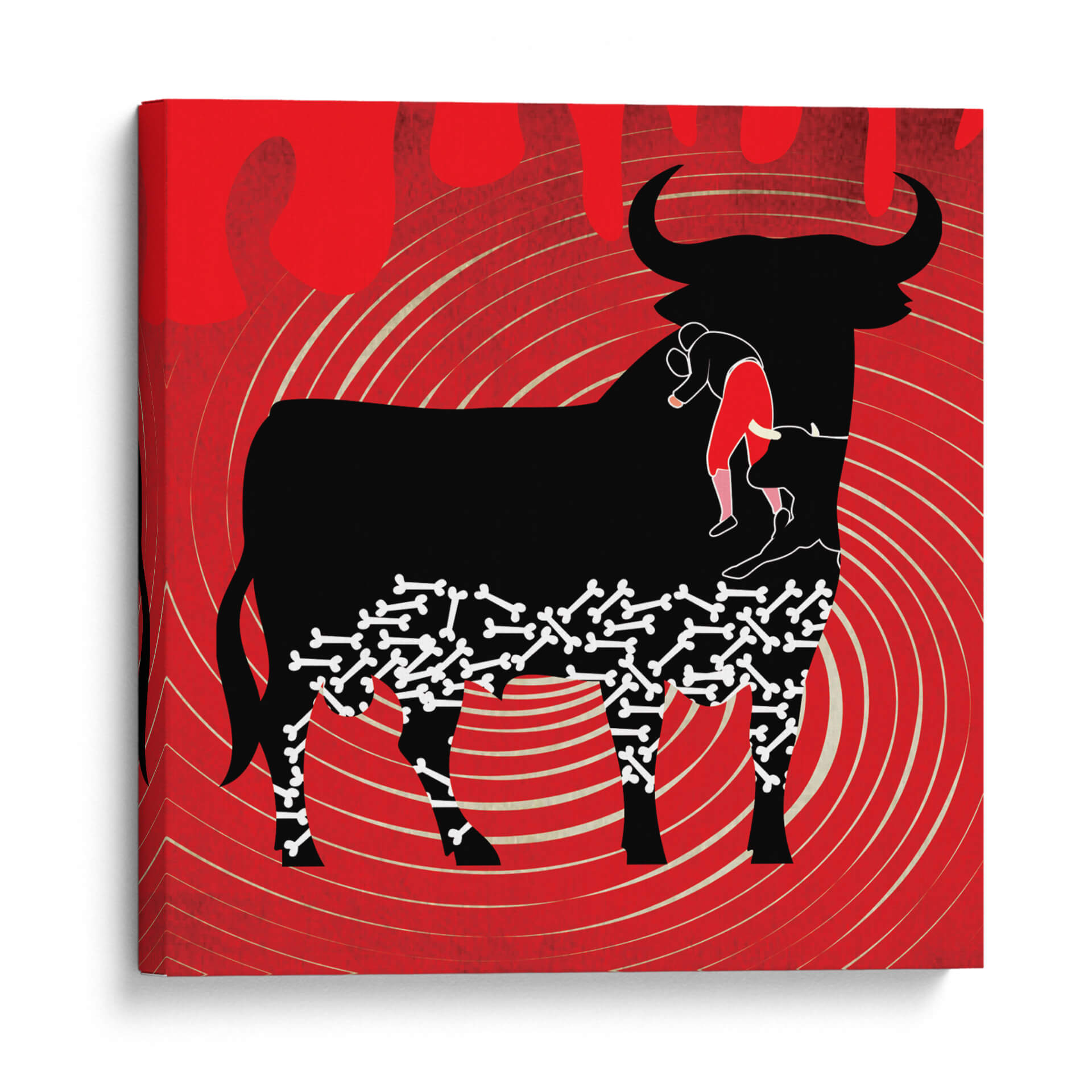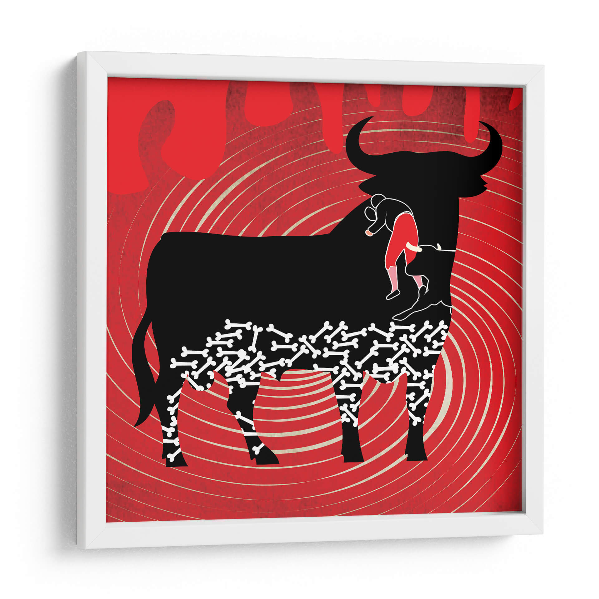 Sumérgete en la intensidad y el drama de "Adiós a la Fiesta Taurina", una obra de arte contemporáneo que captura la esencia de una despedida épica. Este cuadro decorativo presenta una silueta imponente de un toro negro, símbolo de fuerza y tradición, que internaliza un peculiar patrón de huesos y una figura humana vestida con traje de luces rojo. El fondo, vibrante en tonos rojos intensos con un efecto de espiral y líneas onduladas en beige, evoca la pasión, el peligro y la energía del ruedo. La composición es audaz y simbólica, invitando a la reflexión sobre la vida, la muerte y el fin de una era. El estilo gráfico y distintivo del artista Homo Cosmicam utiliza el contraste entre el negro profundo, el rojo apasionado y los detalles en beige para crear una pieza visualmente impactante. Ideal para aquellos que buscan un cuadro decorativo con carácter y profundidad, perfecto para salones modernos, estudios o cualquier espacio que requiera un toque de conversación artística y un punto focal lleno de significado.