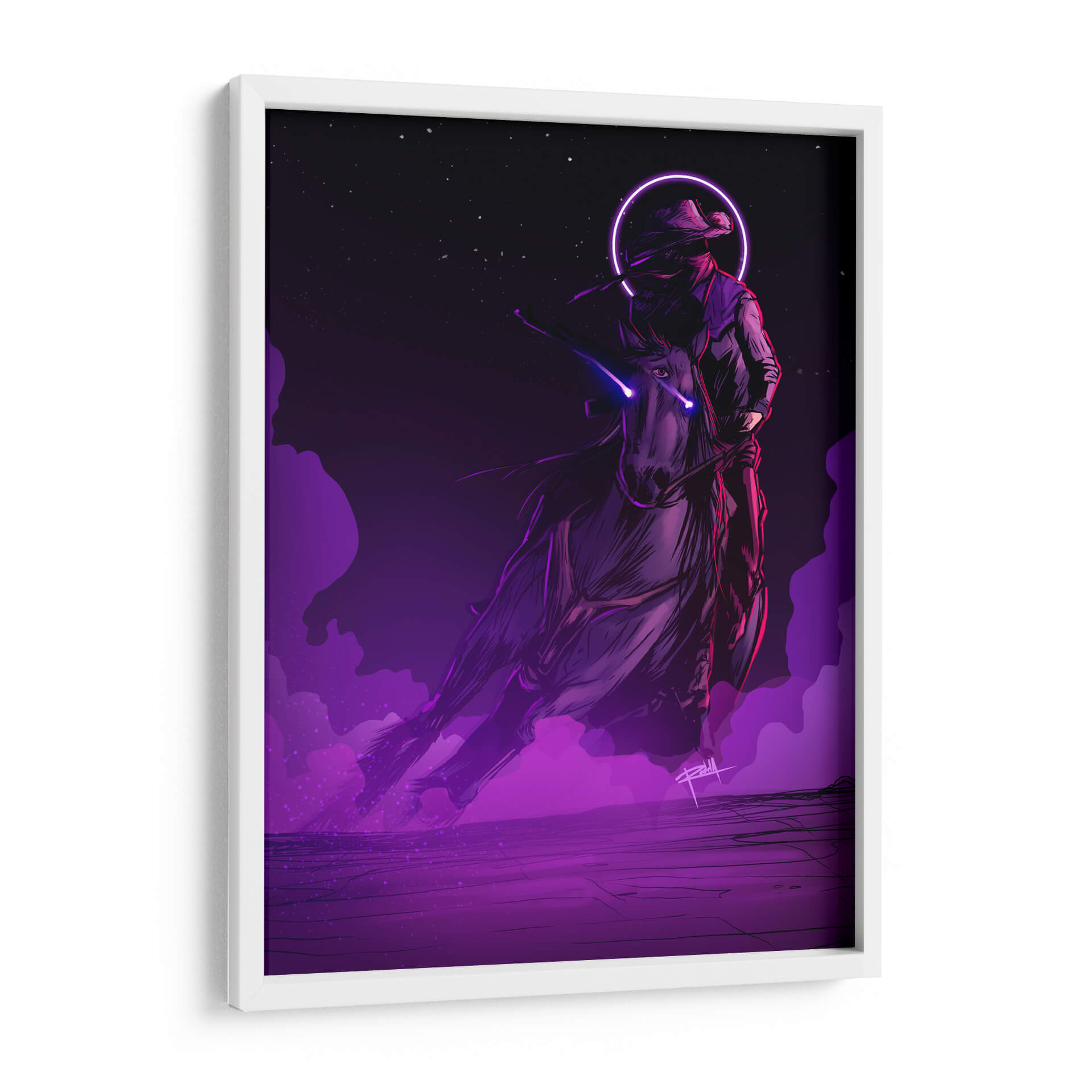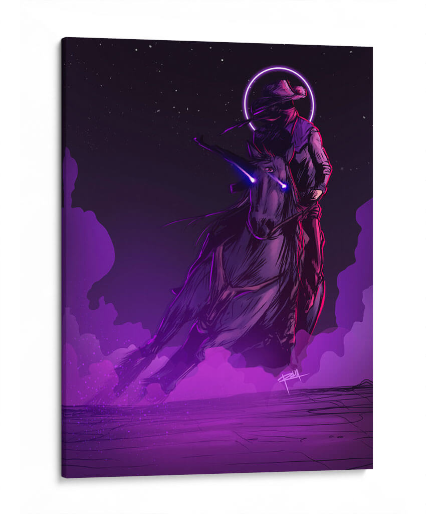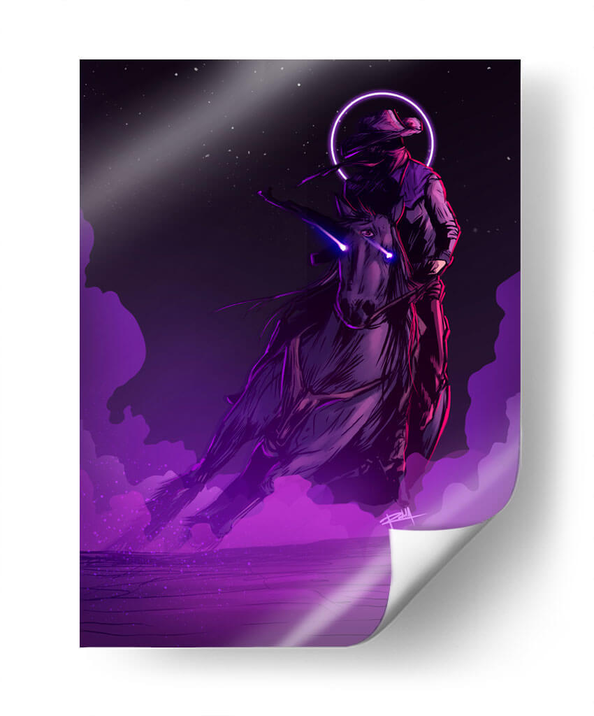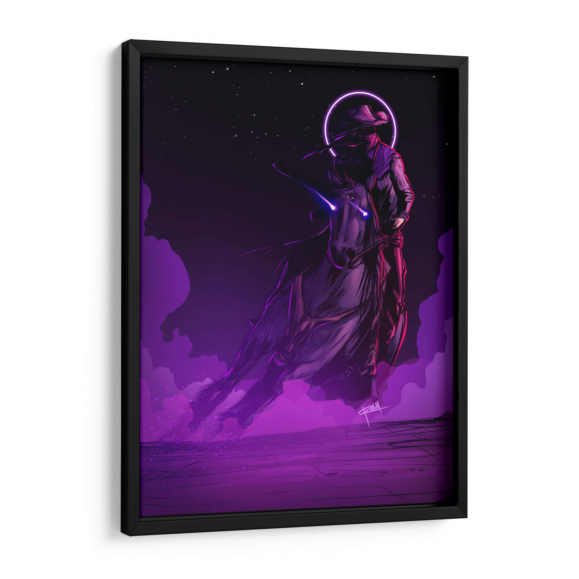 Embárcate en un viaje a través de la noche con "Caballo Negro", una obra de arte digital que captura la mística y el poder de un jinete solitario bajo un cielo estrellado. La paleta de colores, dominada por intensos tonos púrpuras y negros, crea una atmósfera de misterio y aventura. El caballo, representado con líneas dinámicas y un aura violeta vibrante, parece galopar a través de nubes etéreas, mientras que el jinete, con un sombrero de vaquero y el rostro oculto, irradia una presencia enigmática. Un halo de neón circular rodea la cabeza del jinete, añadiendo un toque futurista y casi celestial a la escena. Las estrellas dispersas en el oscuro fondo y los destellos de luz azul en los ojos del caballo refuerzan la sensación de un universo vasto y desconocido. Esta pieza es ideal para quienes buscan añadir un toque de fantasía oscura y energía a su decoración, funcionando como un punto focal impactante en salas de estar modernas, estudios o incluso oficinas. El estilo distintivo de Gerardo Rodela fusiona elementos del western con una estética contemporánea y surrealista, resultando en un cuadro decorativo que invita a la contemplación y evoca una narrativa personal de libertad y exploración. Transforma tu espacio con la potencia y el misterio de "Caballo Negro".