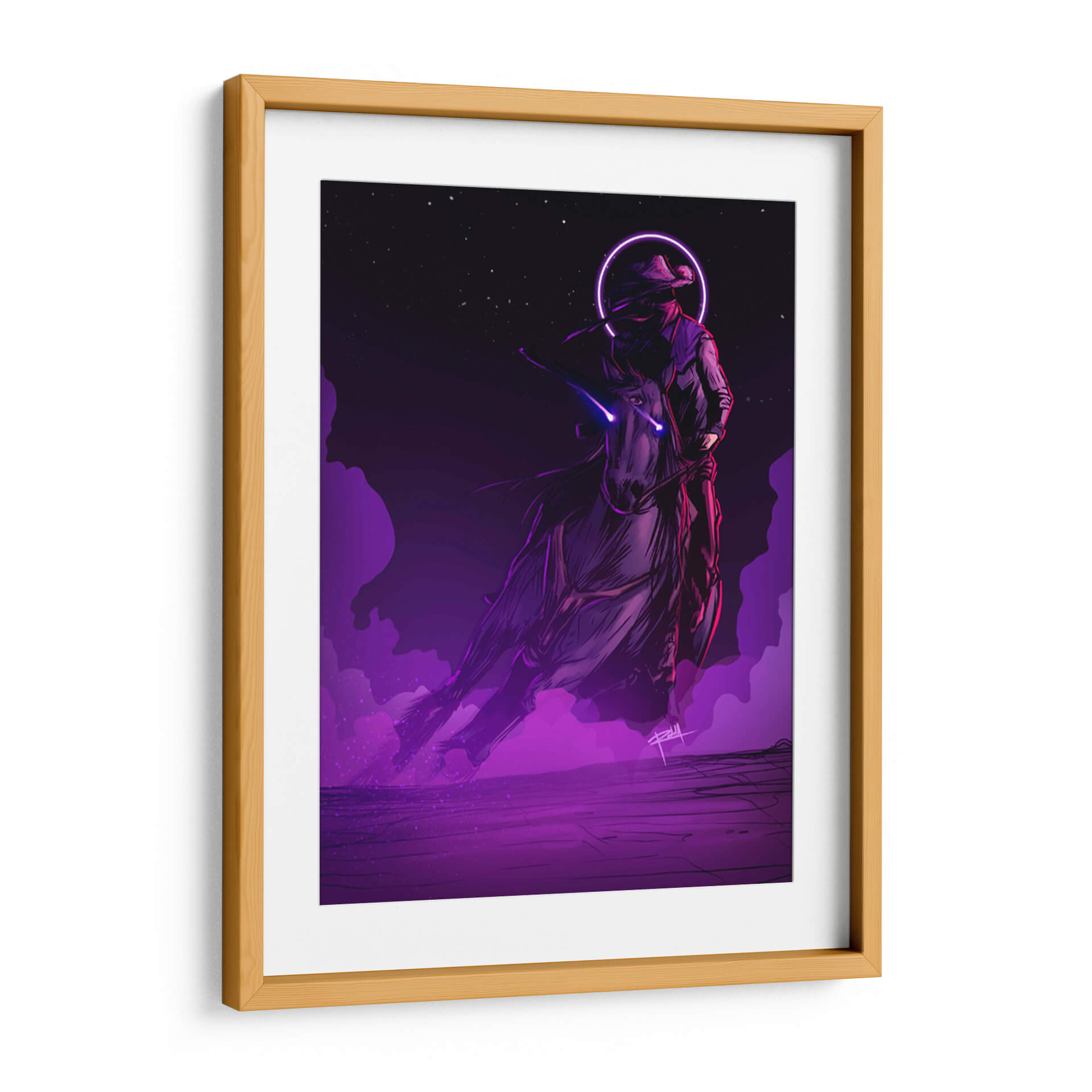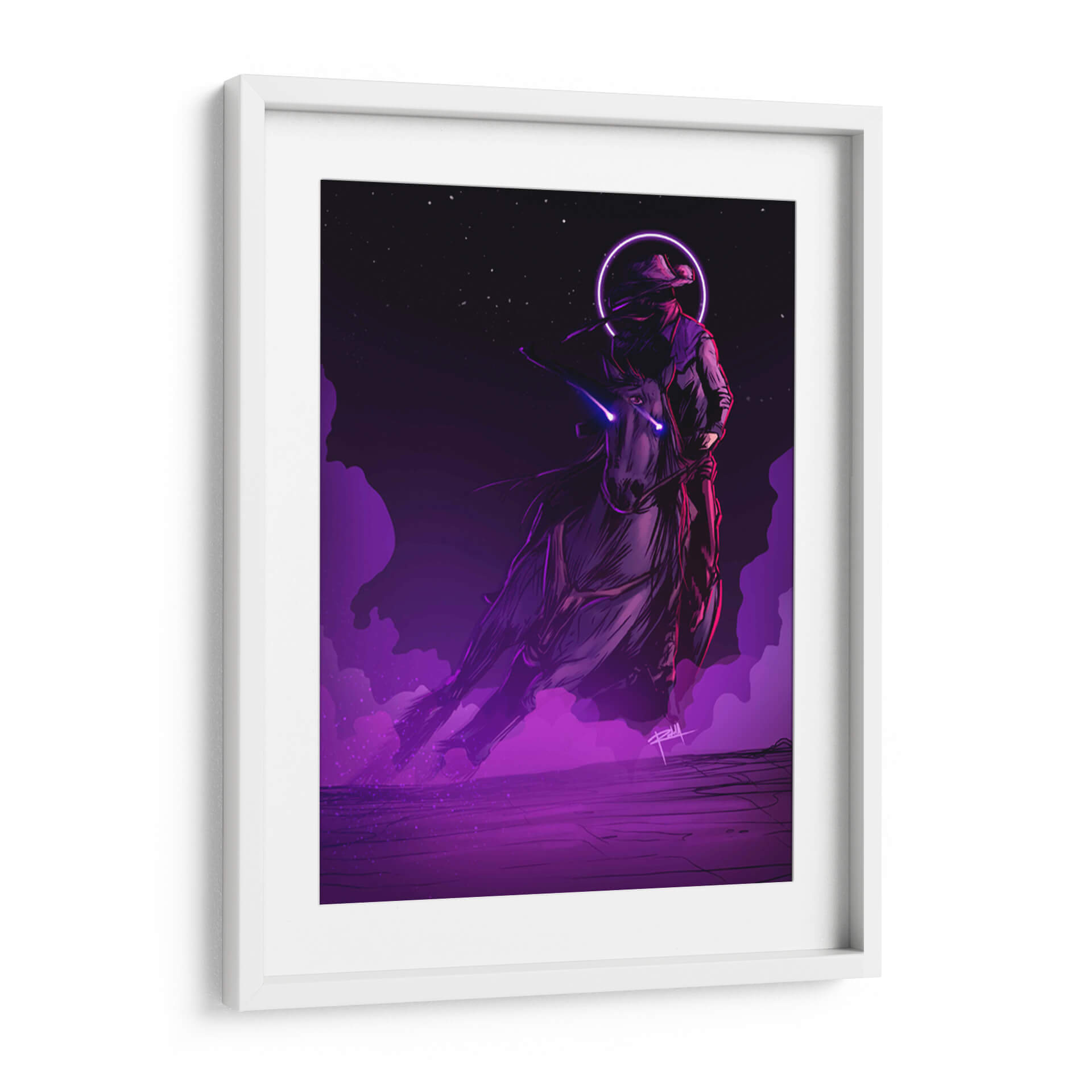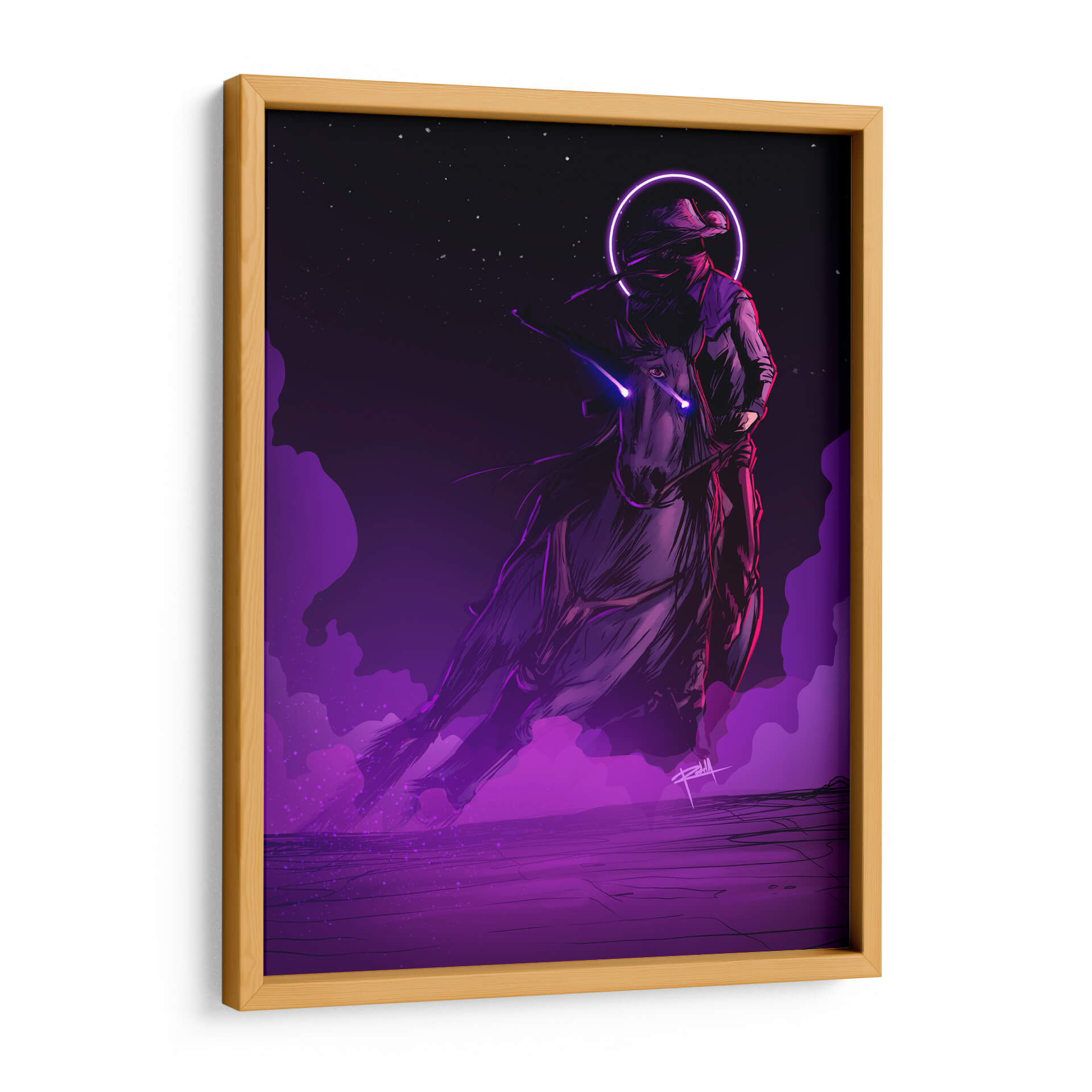 Embárcate en un viaje a través de la noche con "Caballo Negro", una obra de arte digital que captura la mística y el poder de un jinete solitario bajo un cielo estrellado. La paleta de colores, dominada por intensos tonos púrpuras y negros, crea una atmósfera de misterio y aventura. El caballo, representado con líneas dinámicas y un aura violeta vibrante, parece galopar a través de nubes etéreas, mientras que el jinete, con un sombrero de vaquero y el rostro oculto, irradia una presencia enigmática. Un halo de neón circular rodea la cabeza del jinete, añadiendo un toque futurista y casi celestial a la escena. Las estrellas dispersas en el oscuro fondo y los destellos de luz azul en los ojos del caballo refuerzan la sensación de un universo vasto y desconocido. Esta pieza es ideal para quienes buscan añadir un toque de fantasía oscura y energía a su decoración, funcionando como un punto focal impactante en salas de estar modernas, estudios o incluso oficinas. El estilo distintivo de Gerardo Rodela fusiona elementos del western con una estética contemporánea y surrealista, resultando en un cuadro decorativo que invita a la contemplación y evoca una narrativa personal de libertad y exploración. Transforma tu espacio con la potencia y el misterio de "Caballo Negro".