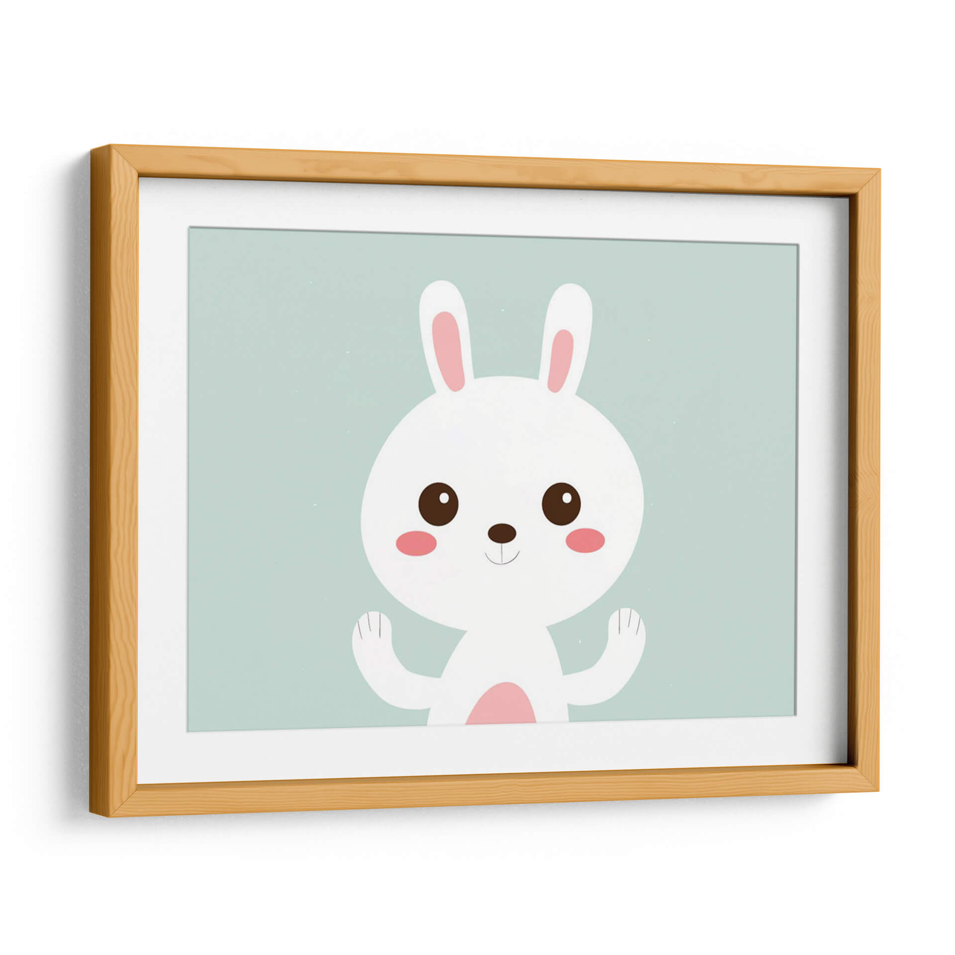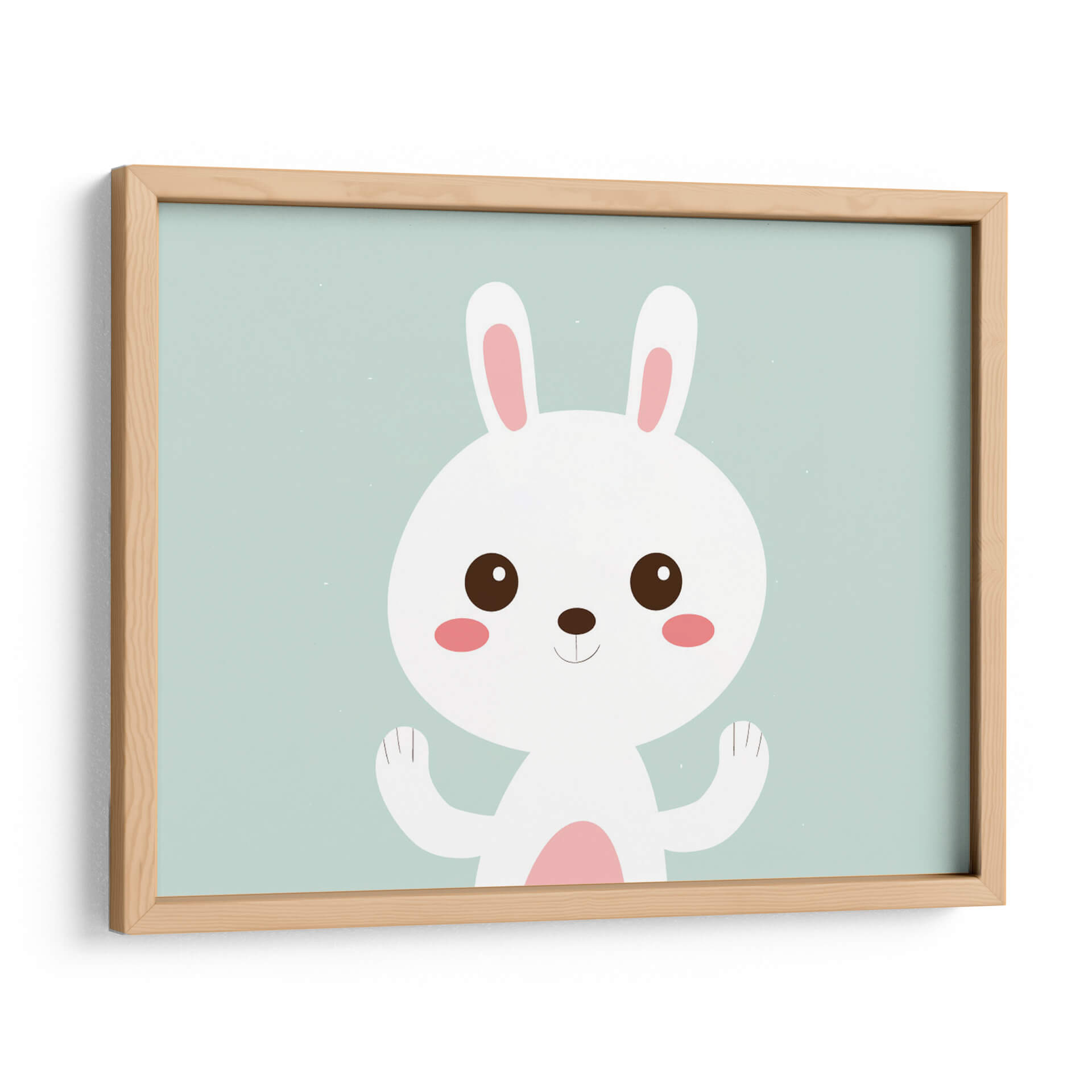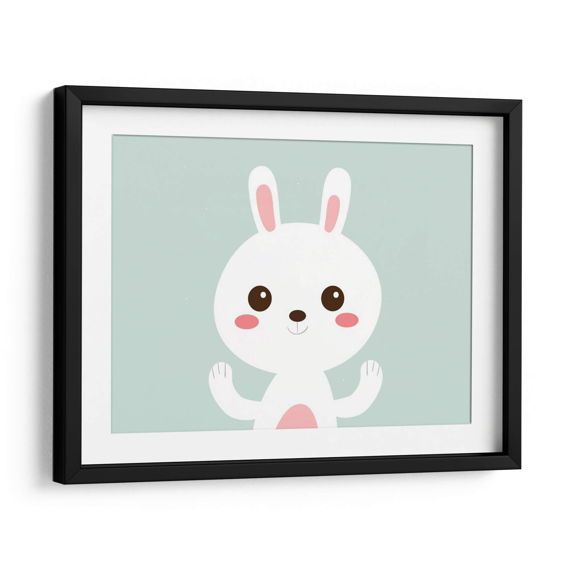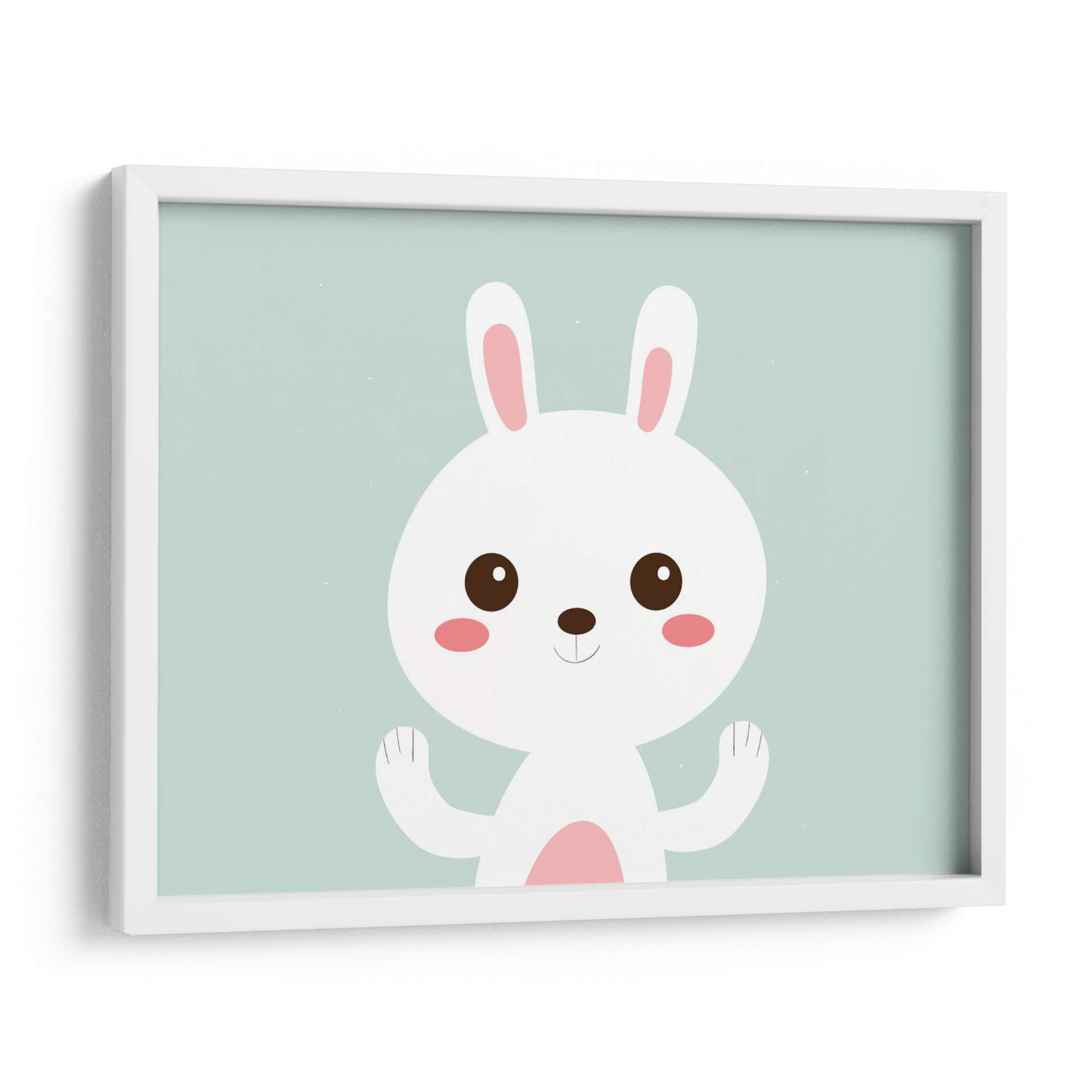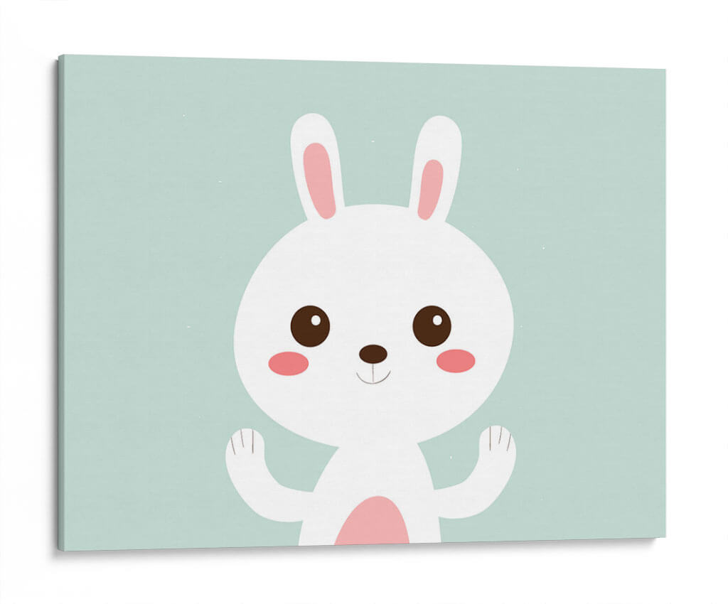Este encantador cuadro decorativo, titulado 'Conejito blanco feliz', captura la inocencia y la alegría a través de su sencilla pero cautivadora ilustración. La obra presenta un tierno conejito blanco con grandes ojos curiosos y mejillas sonrosadas, posicionado sobre un fondo de un suave y apacible color aguamarina. Su diseño minimalista y sus líneas limpias lo convierten en una pieza versátil, perfecta para añadir un toque de dulzura y calidez a cualquier espacio. La paleta de colores pastel, dominada por el blanco, el rosa suave y el aguamarina, evoca una sensación de calma y serenidad, ideal para habitaciones infantiles, dormitorios o cualquier rincón que busque un ambiente relajado y acogedor. La sonrisa sutil y las patitas levantadas del conejito transmiten una sensación de bienvenida y positividad. Este cuadro decorativo es una excelente opción para quienes buscan una pieza de arte que irradie felicidad y simplicidad, aportando un punto de luz y ternura a la decoración del hogar u oficina.