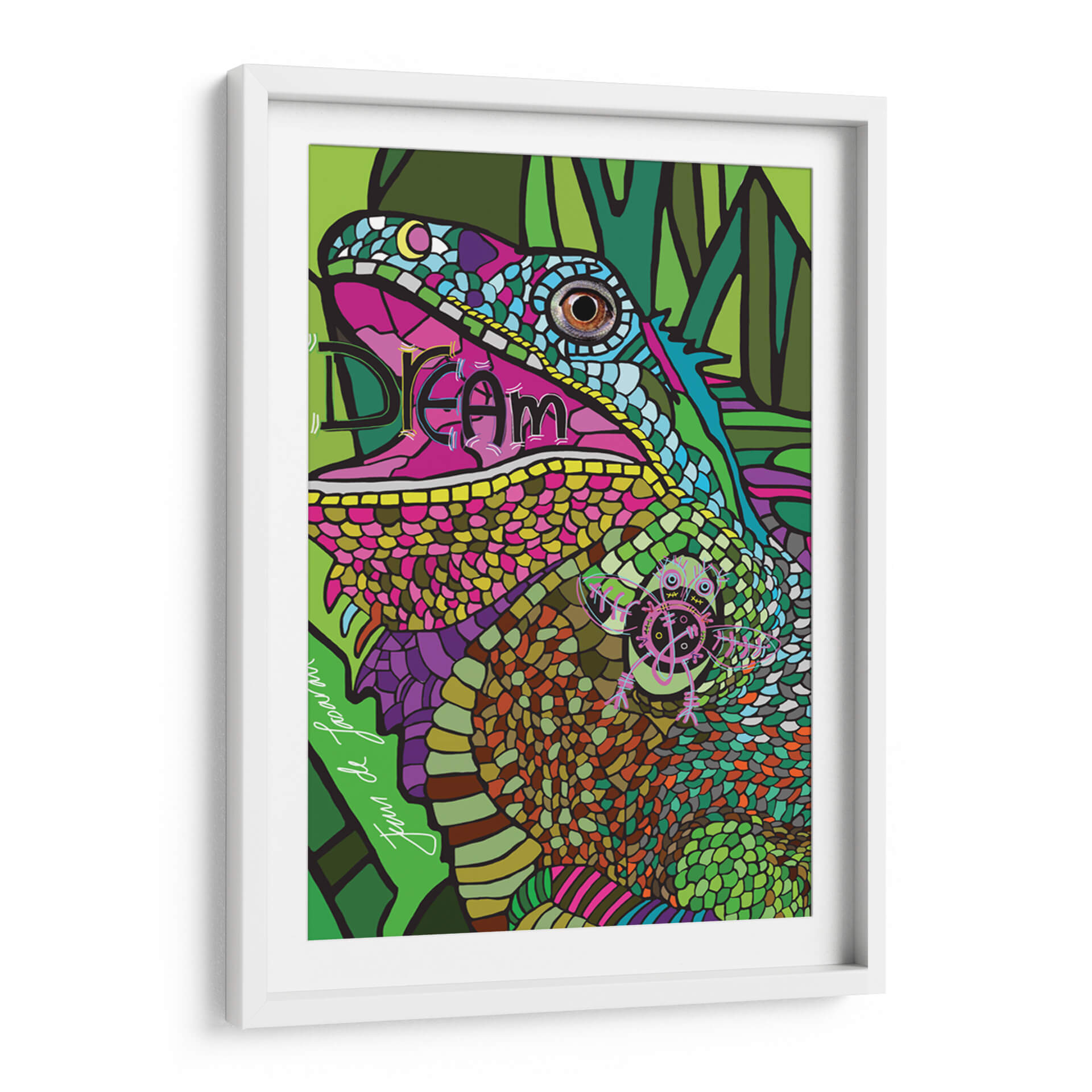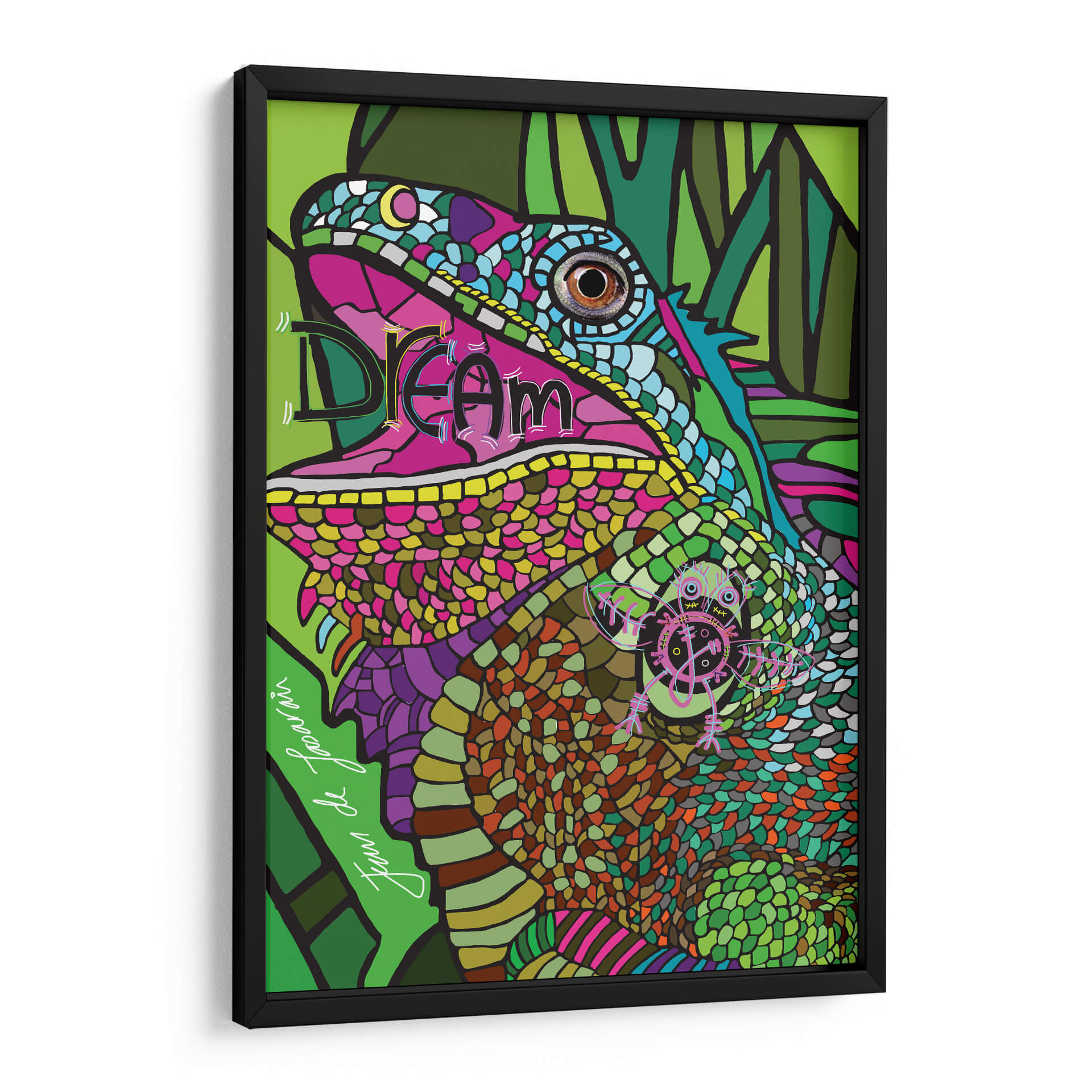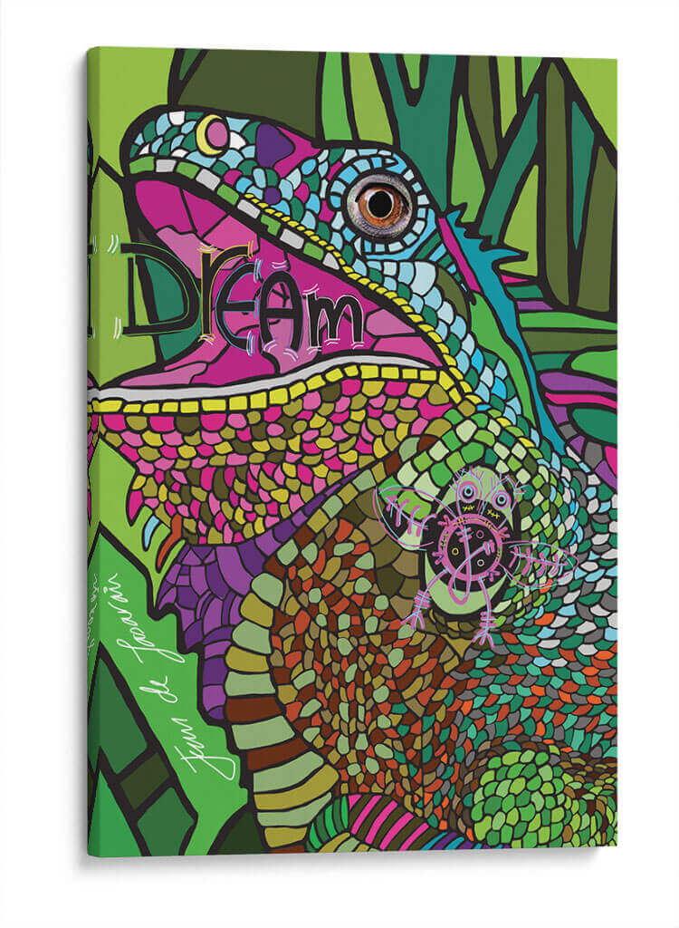 Sumérgete en la vibrante y detallada obra de arte titulada "IGUANA" del artista Juan de Lascurain. Este cuadro decorativo captura la esencia de un lagarto con una explosión de colores y texturas que invitan a la contemplación. La paleta, dominada por verdes intensos, fucsias eléctricos, azules vibrantes y toques de naranja y morado, crea una atmósfera exótica y llena de vida. El estilo, una mezcla de arte pop y surrealismo con influencias tribales, se manifiesta en la intrincada representación de las escamas y las formas geométricas que componen el fondo. "IGUANA" no es solo una pieza decorativa, es una invitación a soñar y a conectar con la naturaleza salvaje y la imaginación sin límites. La composición audaz y el primer plano del reptil generan un impacto visual inmediato, haciendo de este cuadro un punto focal perfecto para cualquier espacio moderno, una sala de estar llena de personalidad o un estudio creativo. Su energía y originalidad transformarán tu hogar en un santuario de arte contemporáneo, ofreciendo una experiencia visual única y estimulante.
