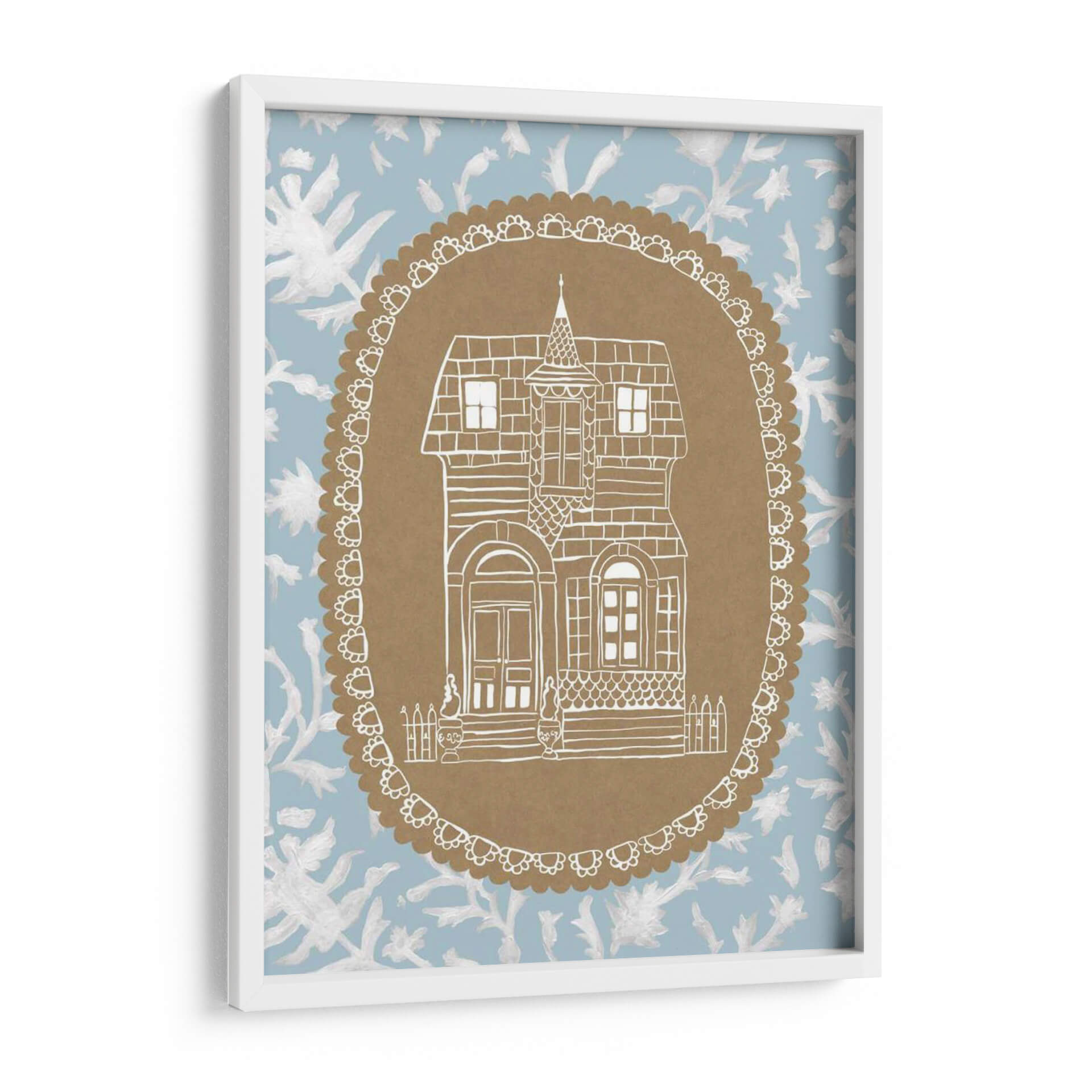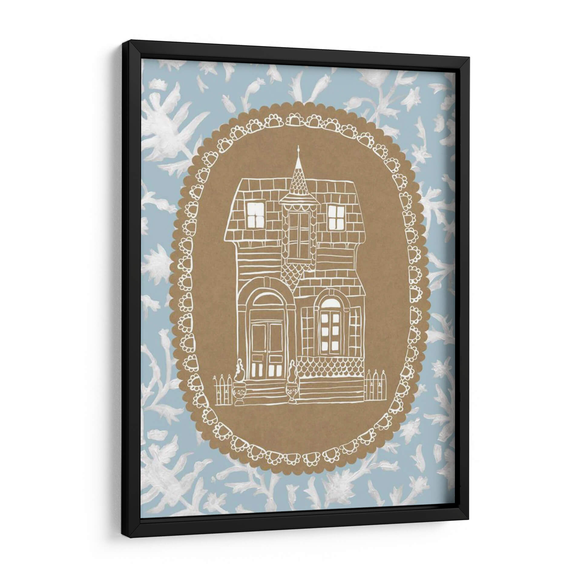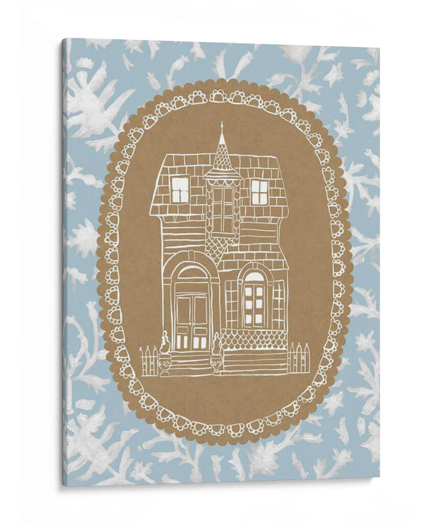 Sumérgete en el encanto nostálgico de 'Avery Dollhouse Iv', una obra de arte que evoca la calidez y la imaginación de un hogar de muñecas vintage. Este cuadro decorativo presenta una detallada ilustración lineal en blanco de una casa de estilo victoriano, enmarcada dentro de un óvalo decorativo con un borde festoneado. El contraste entre la delicadeza del dibujo y el fondo de estampado floral en tonos azul claro y blanco crea una atmósfera etérea y soñadora. La paleta de colores suave y la composición simétrica invitan a la calma y la contemplación. Es la pieza perfecta para añadir un toque de fantasía y serenidad a cualquier espacio, ya sea una sala de estar acogedora, un dormitorio tranquilo o un estudio creativo. 'Avery Dollhouse Iv' es ideal para quienes buscan una decoración con alma, que invite a la reflexión y al ensueño, aportando un aire de cuento de hadas moderno a tu hogar.