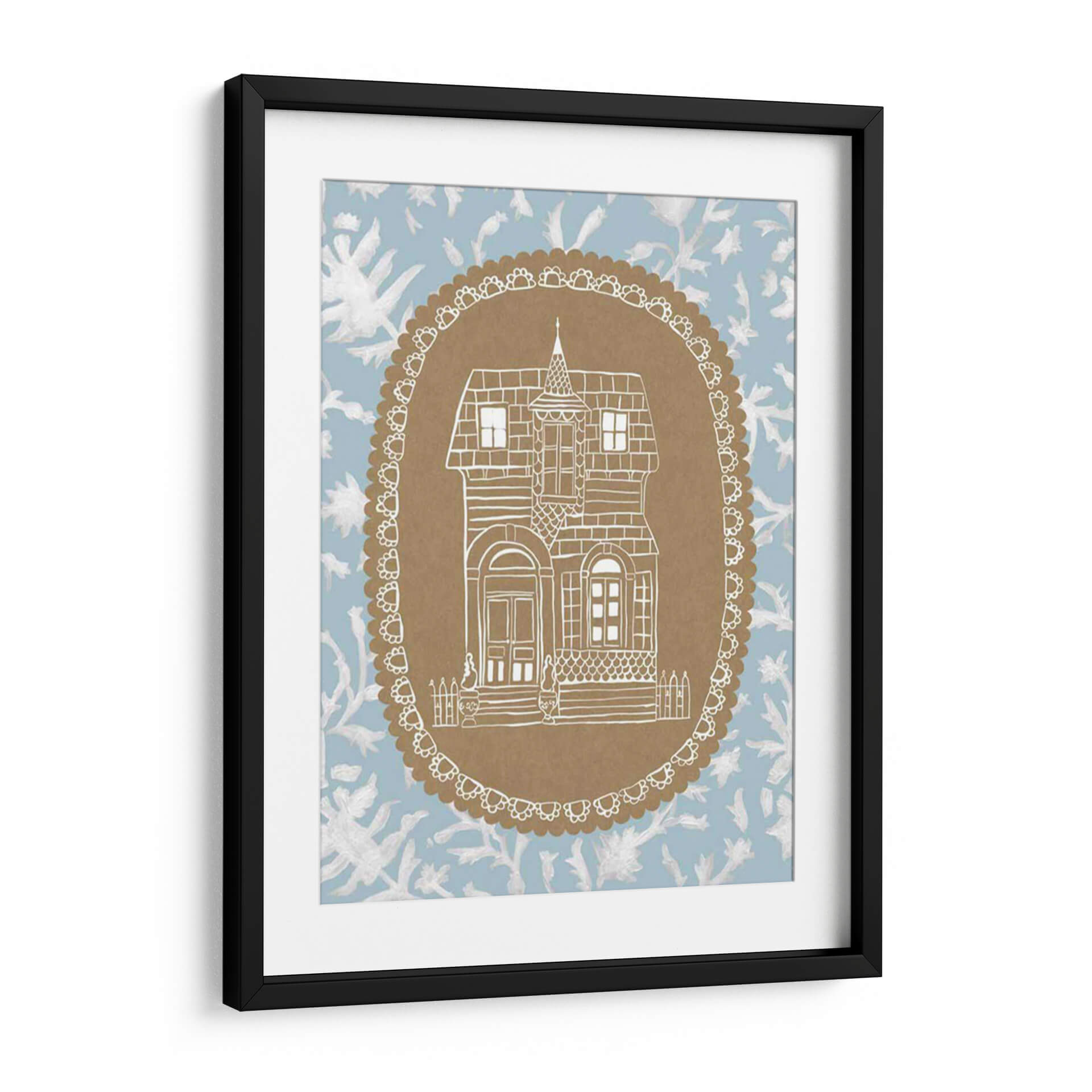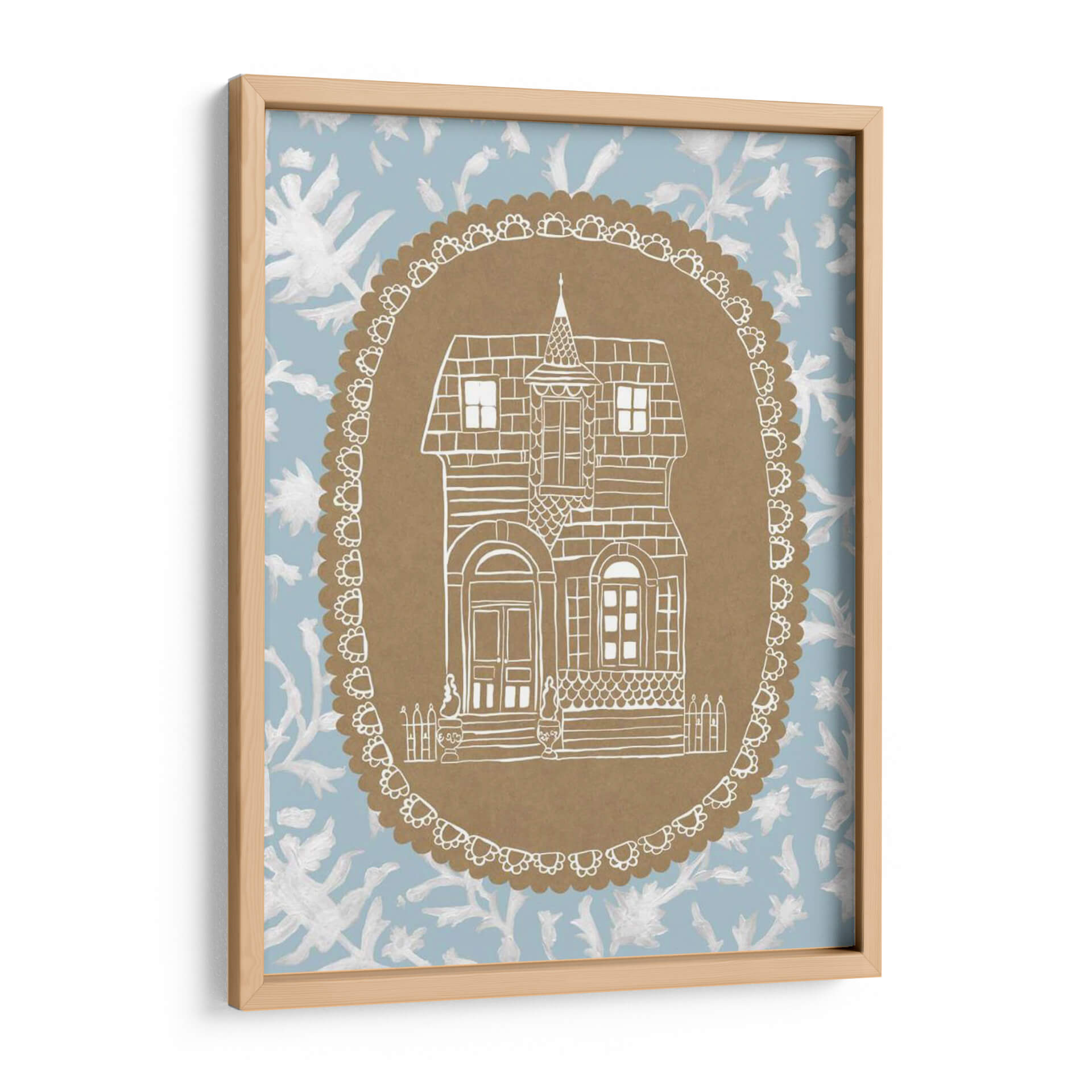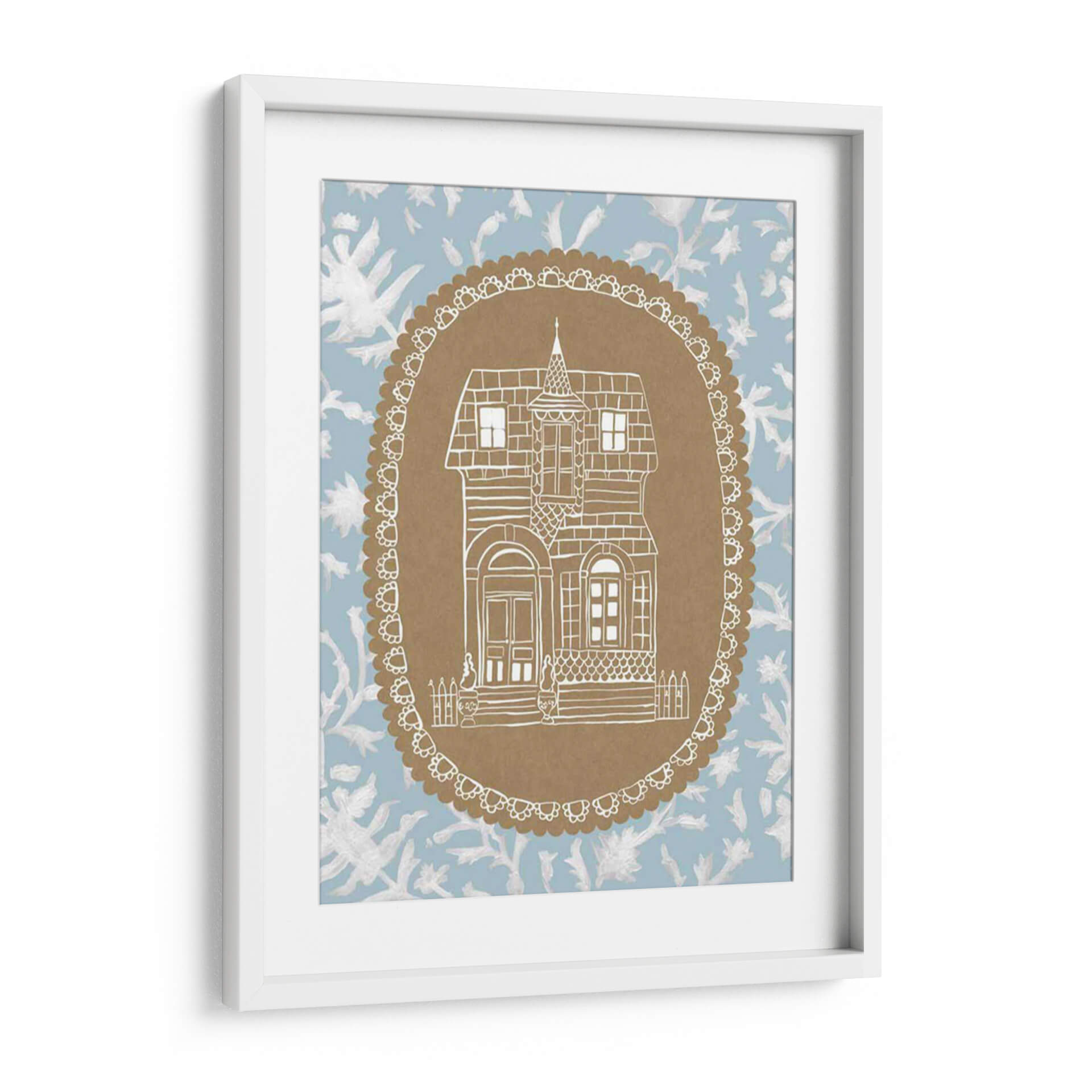 Sumérgete en el encanto nostálgico de 'Avery Dollhouse Iv', una obra de arte que evoca la calidez y la imaginación de un hogar de muñecas vintage. Este cuadro decorativo presenta una detallada ilustración lineal en blanco de una casa de estilo victoriano, enmarcada dentro de un óvalo decorativo con un borde festoneado. El contraste entre la delicadeza del dibujo y el fondo de estampado floral en tonos azul claro y blanco crea una atmósfera etérea y soñadora. La paleta de colores suave y la composición simétrica invitan a la calma y la contemplación. Es la pieza perfecta para añadir un toque de fantasía y serenidad a cualquier espacio, ya sea una sala de estar acogedora, un dormitorio tranquilo o un estudio creativo. 'Avery Dollhouse Iv' es ideal para quienes buscan una decoración con alma, que invite a la reflexión y al ensueño, aportando un aire de cuento de hadas moderno a tu hogar.