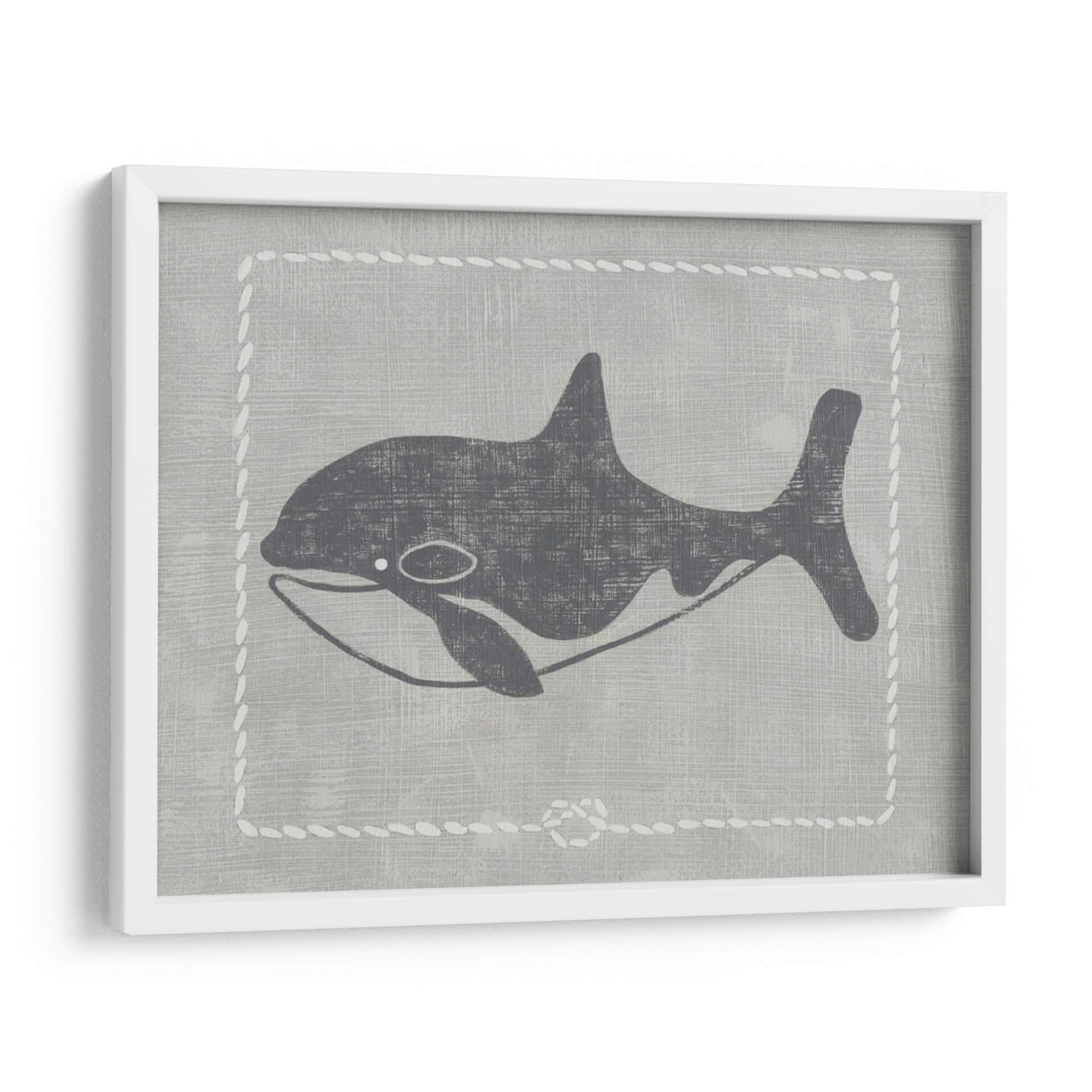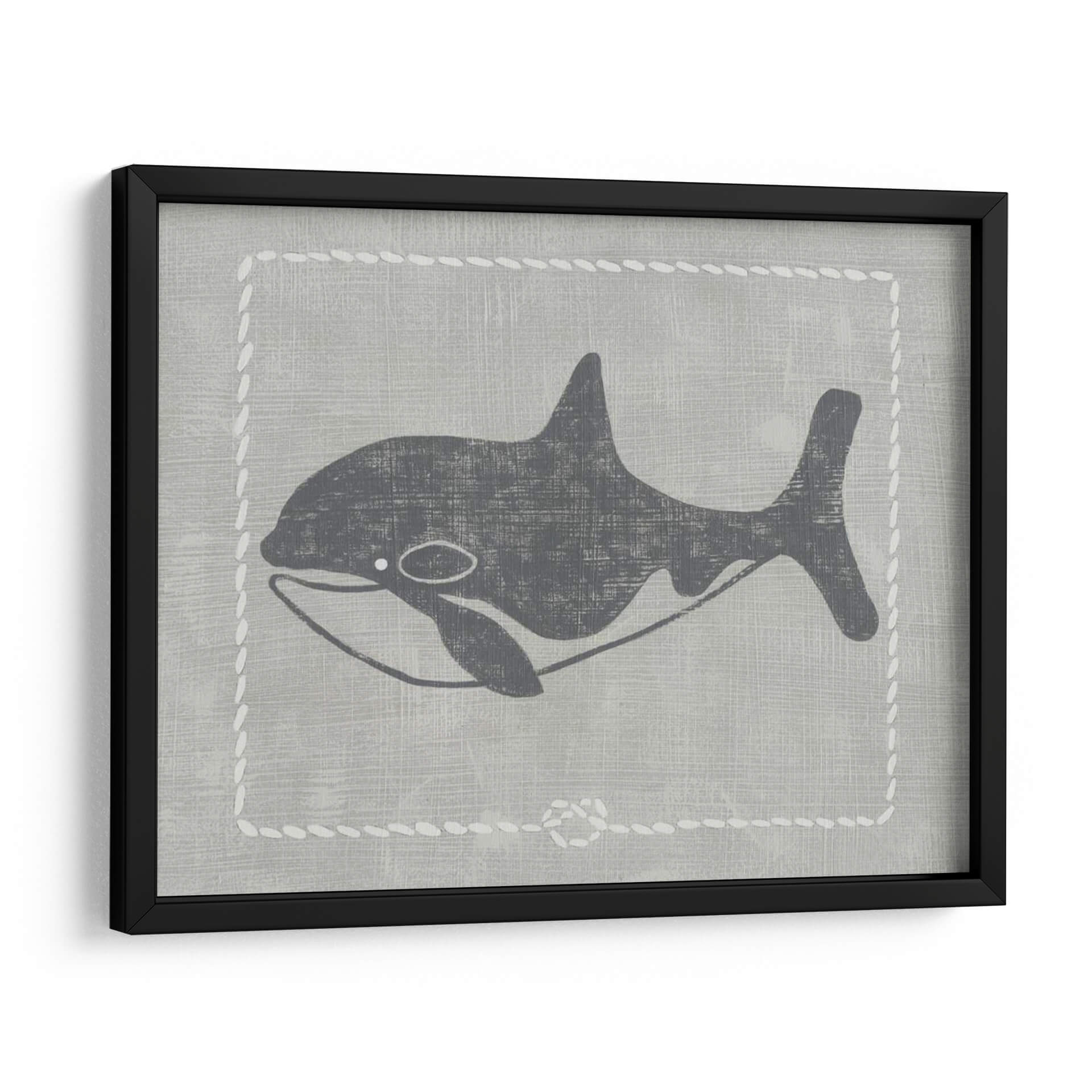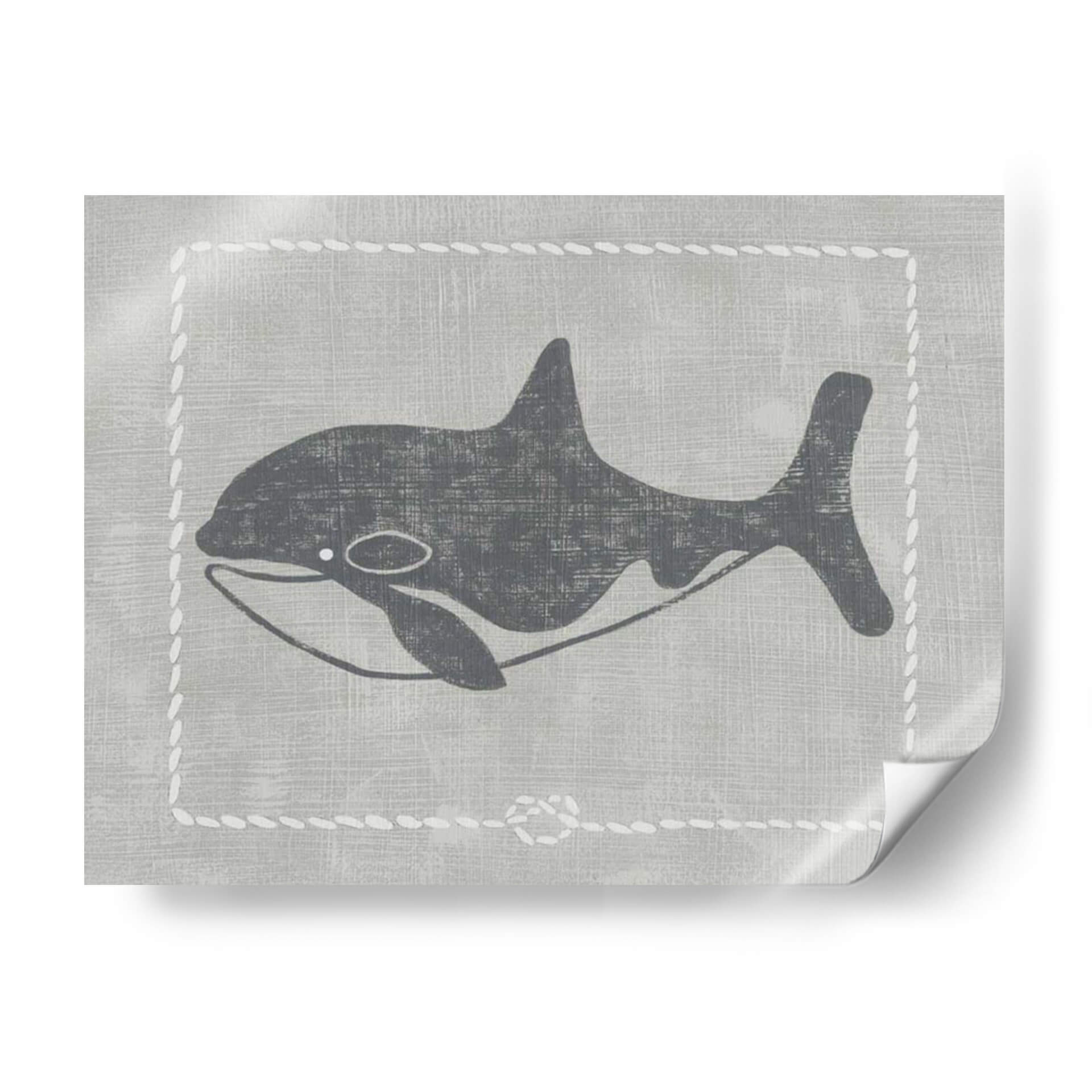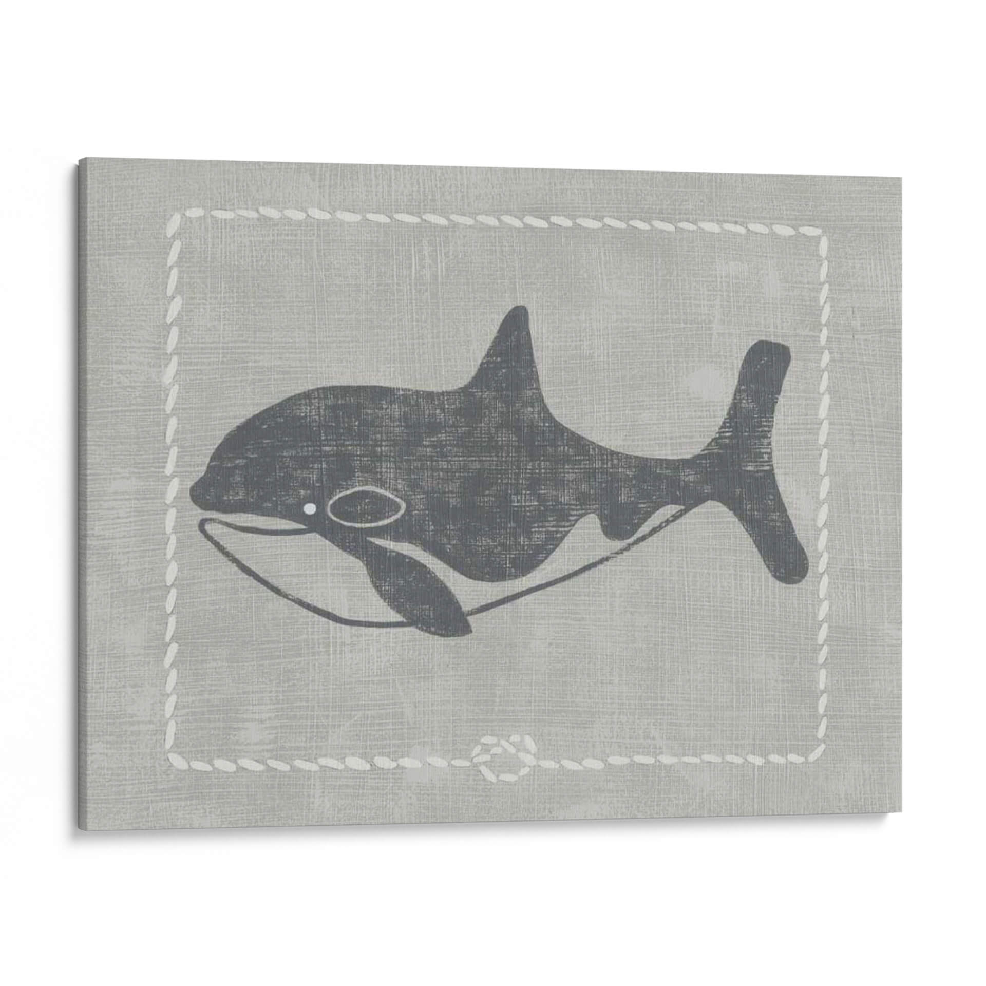 Sumérgete en la serenidad del océano con "Ballena De Un Cuento II", una obra de arte contemporáneo que captura la majestuosidad de la vida marina con un estilo gráfico y evocador. La pieza presenta una silueta estilizada de una ballena en tonos grises oscuros, contrastando sutilmente sobre un fondo texturizado que simula lino en un suave tono gris pálido. Un delicado borde decorativo, imitando puntadas de cuerda blanca, enmarca la figura, añadiendo un toque de encanto rústico y náutico. La composición es limpia y minimalista, centrada en la elegancia de la forma de la ballena, transmitiendo una sensación de calma, paz y la inmensidad del mar. Los colores neutros y la estética gráfica hacen de este cuadro decorativo una pieza versátil, perfecta para añadir un toque de sofisticación serena a cualquier habitación. Ideal para salones modernos, dormitorios que buscan tranquilidad o incluso espacios infantiles con un diseño cuidado. "Ballena De Un Cuento II" es más que una simple imagen; es una invitación a la contemplación y a la conexión con la naturaleza.