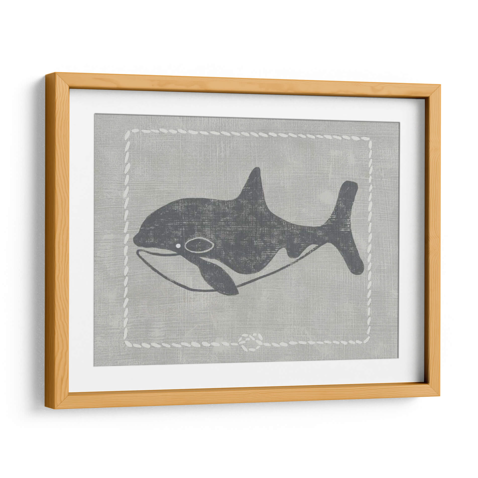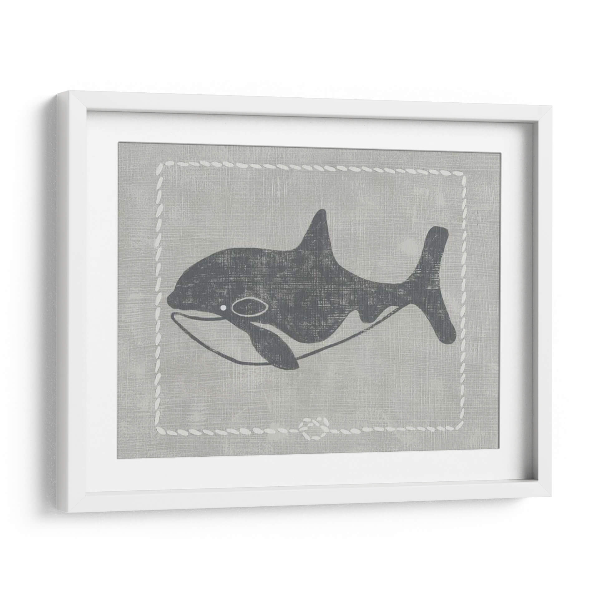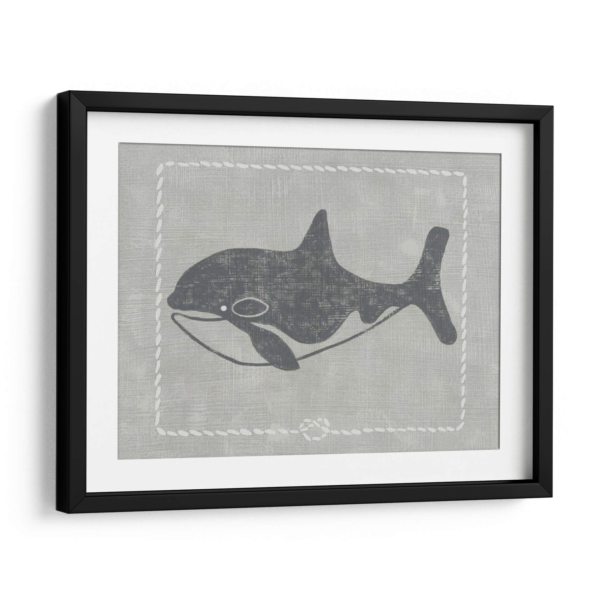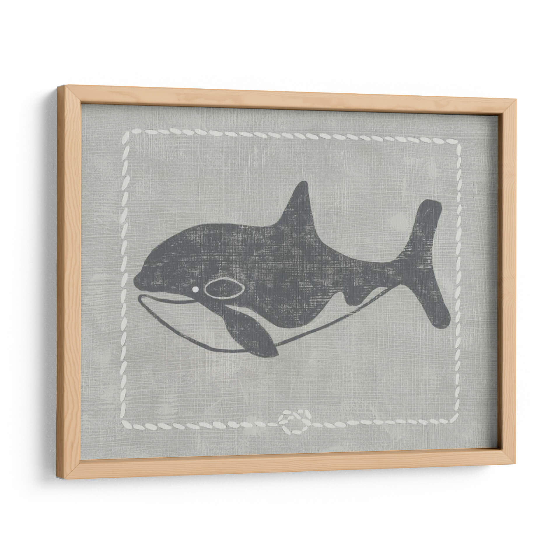 Sumérgete en la serenidad del océano con "Ballena De Un Cuento II", una obra de arte contemporáneo que captura la majestuosidad de la vida marina con un estilo gráfico y evocador. La pieza presenta una silueta estilizada de una ballena en tonos grises oscuros, contrastando sutilmente sobre un fondo texturizado que simula lino en un suave tono gris pálido. Un delicado borde decorativo, imitando puntadas de cuerda blanca, enmarca la figura, añadiendo un toque de encanto rústico y náutico. La composición es limpia y minimalista, centrada en la elegancia de la forma de la ballena, transmitiendo una sensación de calma, paz y la inmensidad del mar. Los colores neutros y la estética gráfica hacen de este cuadro decorativo una pieza versátil, perfecta para añadir un toque de sofisticación serena a cualquier habitación. Ideal para salones modernos, dormitorios que buscan tranquilidad o incluso espacios infantiles con un diseño cuidado. "Ballena De Un Cuento II" es más que una simple imagen; es una invitación a la contemplación y a la conexión con la naturaleza.