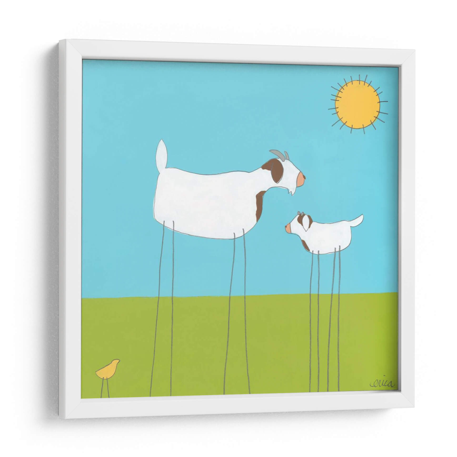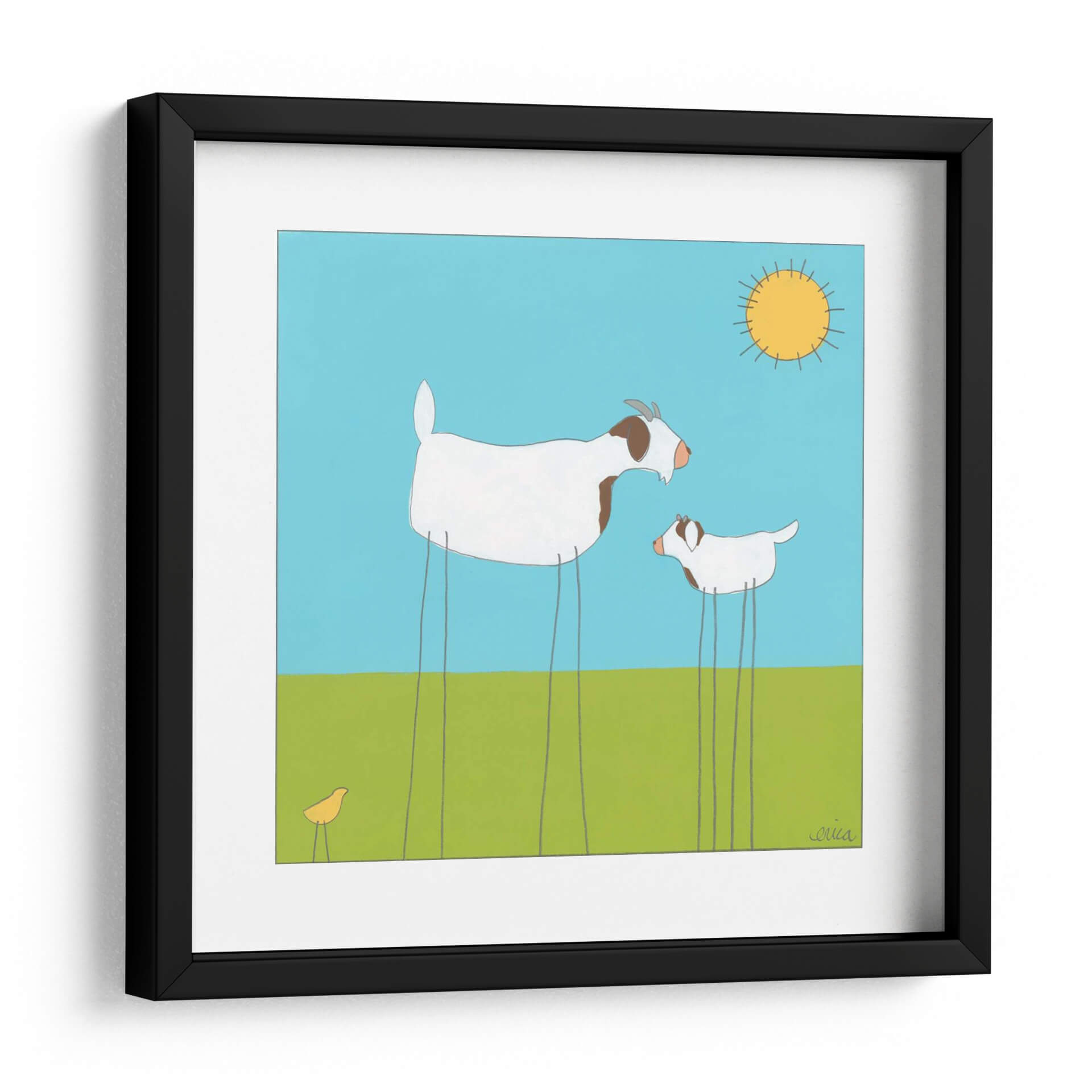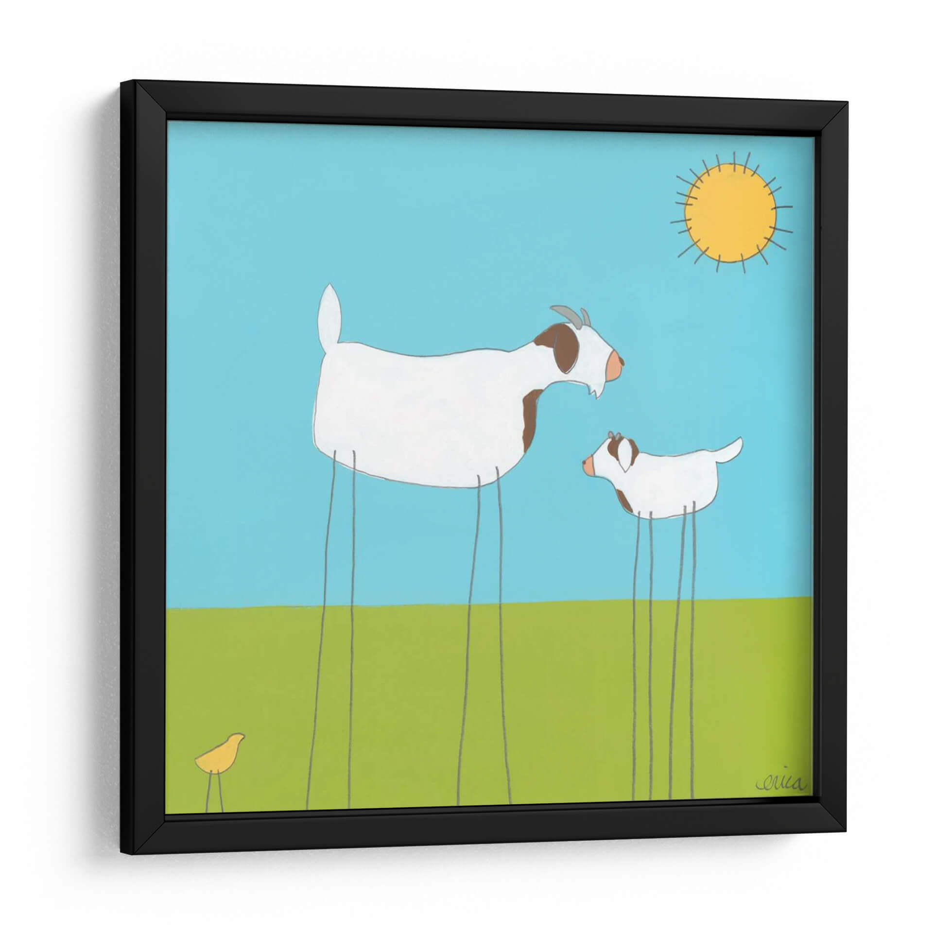 Adéntrate en un mundo de fantasía y alegría con "Cabra De La Pierna", una obra de arte cautivadora de June Erica Vess. Este cuadro decorativo abstracto presenta dos cabras con patas largas y estilizadas, una adulta y una cría, bajo un cielo azul vibrante y un sol juguetón. La paleta de colores, dominada por el azul del cielo y el verde brillante del campo, crea una atmósfera de serenidad y optimismo. El estilo minimalista y encantador, con líneas sencillas y una composición lúdica, evoca una sensación de inocencia y maravilla. Ideal para añadir un toque de originalidad y calidez a cualquier espacio, desde una sala de estar moderna hasta una habitación infantil. "Cabra De La Pierna" es una pieza que invita a la sonrisa y a la contemplación, perfecta para aquellos que buscan arte que transmita emociones positivas y un estilo único. Descubre la magia de este cuadro decorativo y transforma tu hogar en un oasis de creatividad y buen gusto.