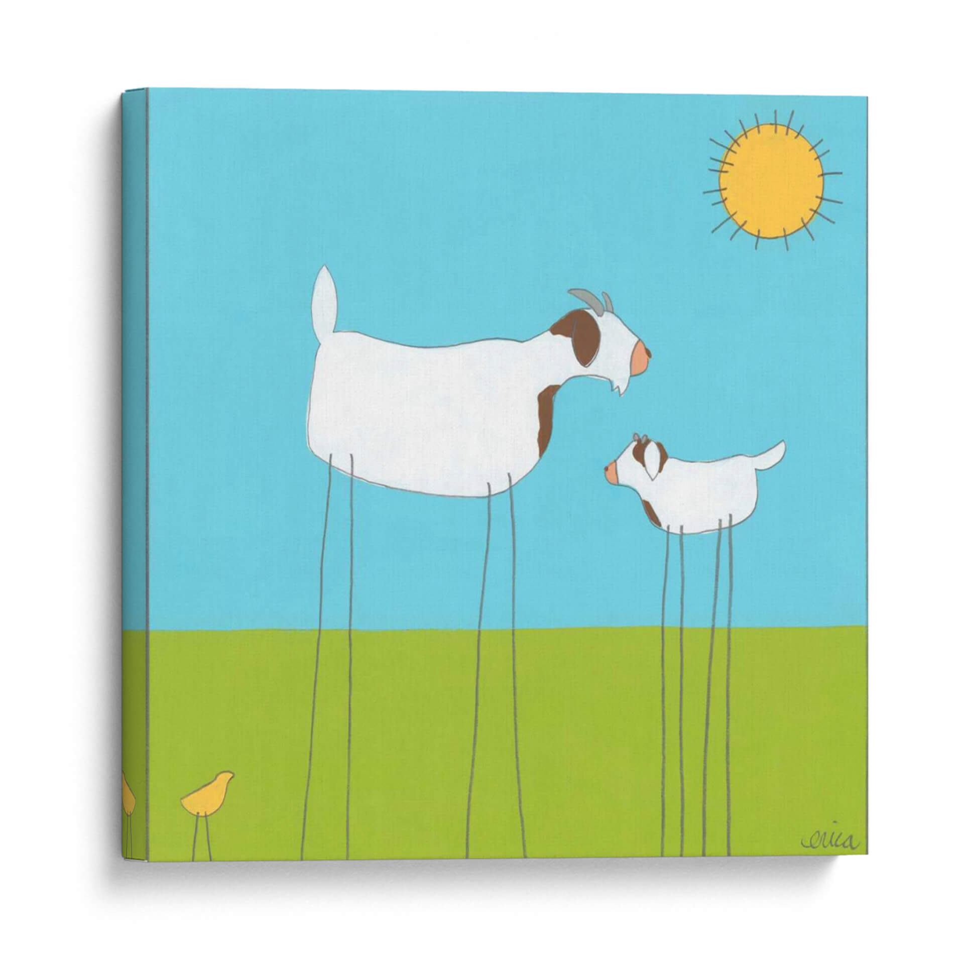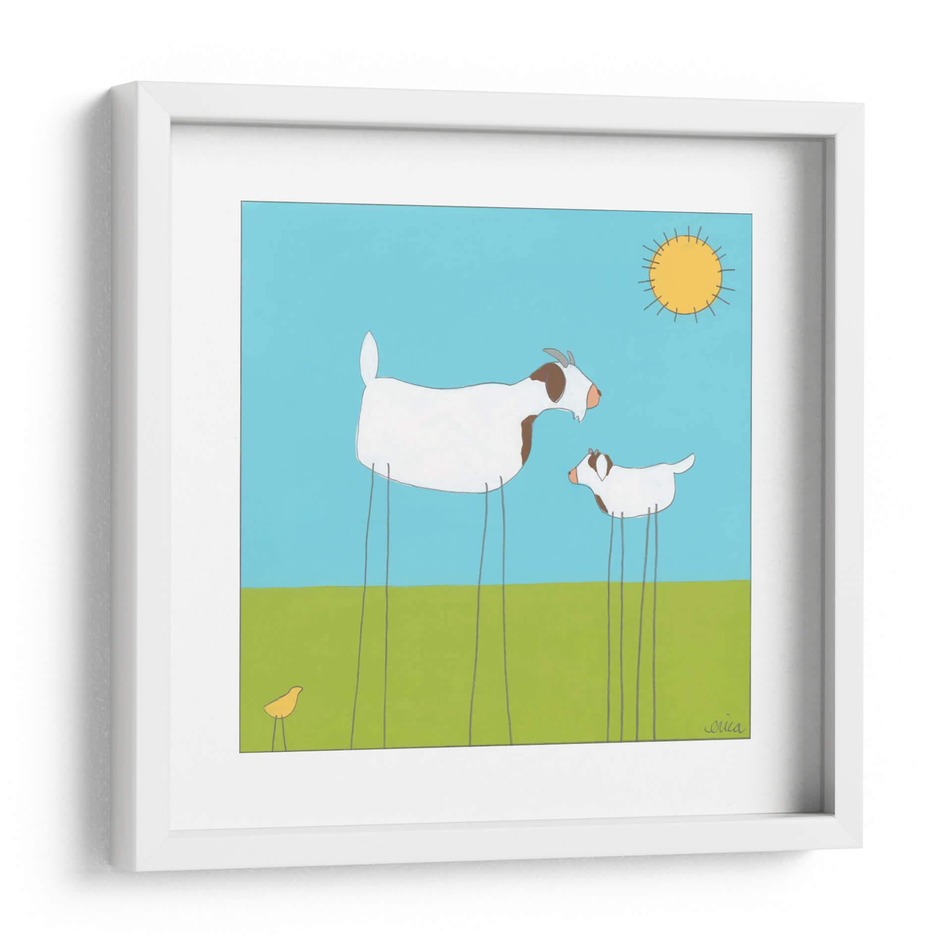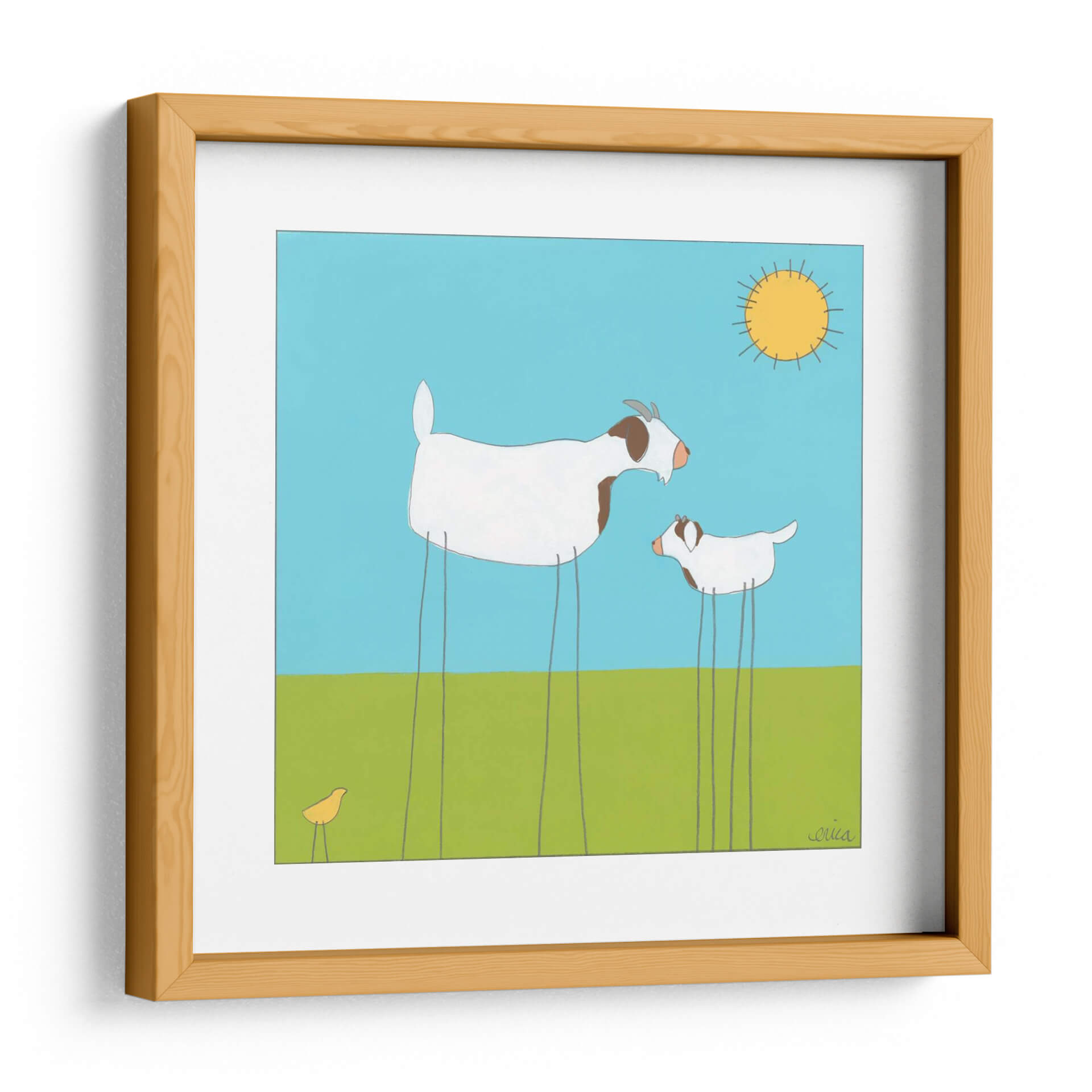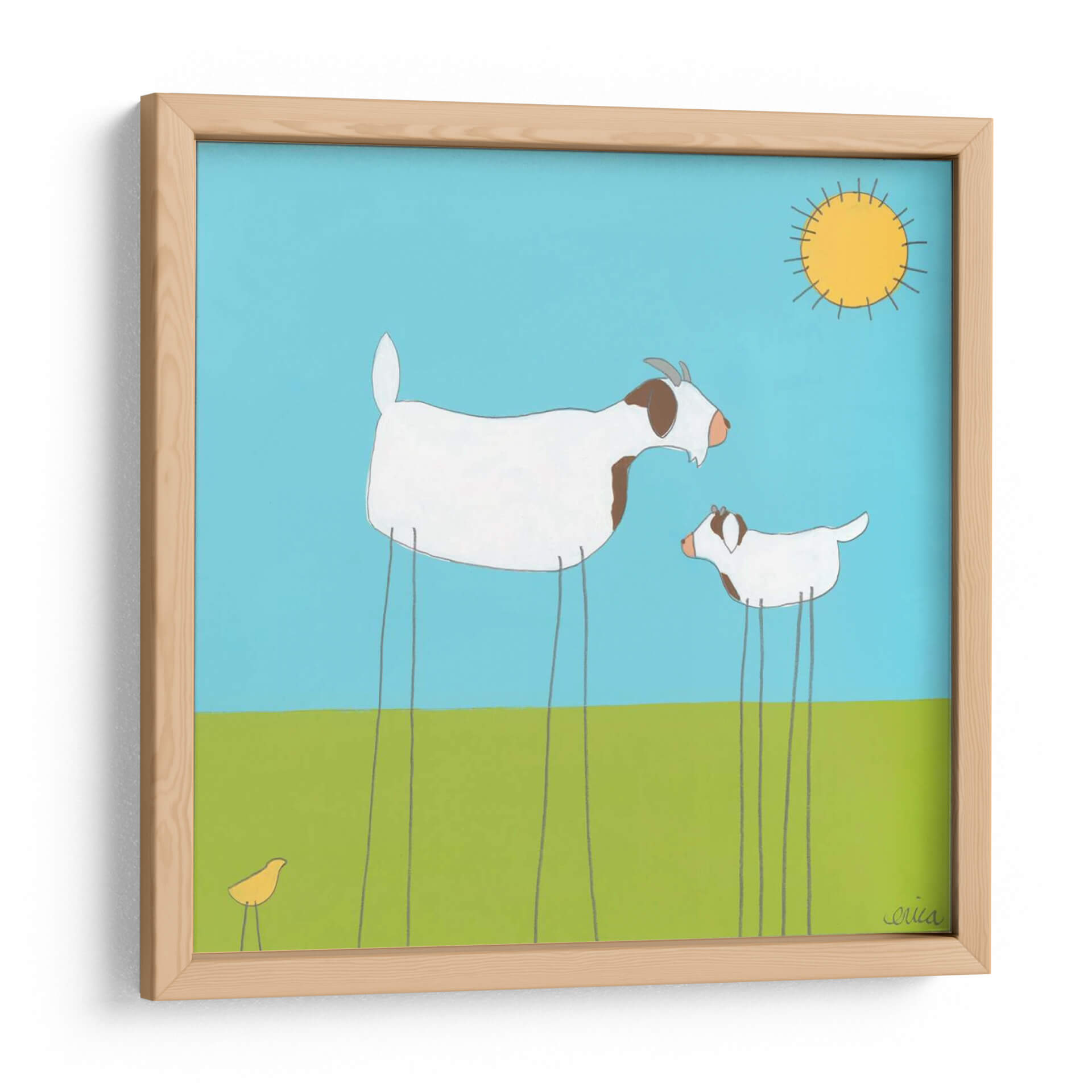 Adéntrate en un mundo de fantasía y alegría con "Cabra De La Pierna", una obra de arte cautivadora de June Erica Vess. Este cuadro decorativo abstracto presenta dos cabras con patas largas y estilizadas, una adulta y una cría, bajo un cielo azul vibrante y un sol juguetón. La paleta de colores, dominada por el azul del cielo y el verde brillante del campo, crea una atmósfera de serenidad y optimismo. El estilo minimalista y encantador, con líneas sencillas y una composición lúdica, evoca una sensación de inocencia y maravilla. Ideal para añadir un toque de originalidad y calidez a cualquier espacio, desde una sala de estar moderna hasta una habitación infantil. "Cabra De La Pierna" es una pieza que invita a la sonrisa y a la contemplación, perfecta para aquellos que buscan arte que transmita emociones positivas y un estilo único. Descubre la magia de este cuadro decorativo y transforma tu hogar en un oasis de creatividad y buen gusto.