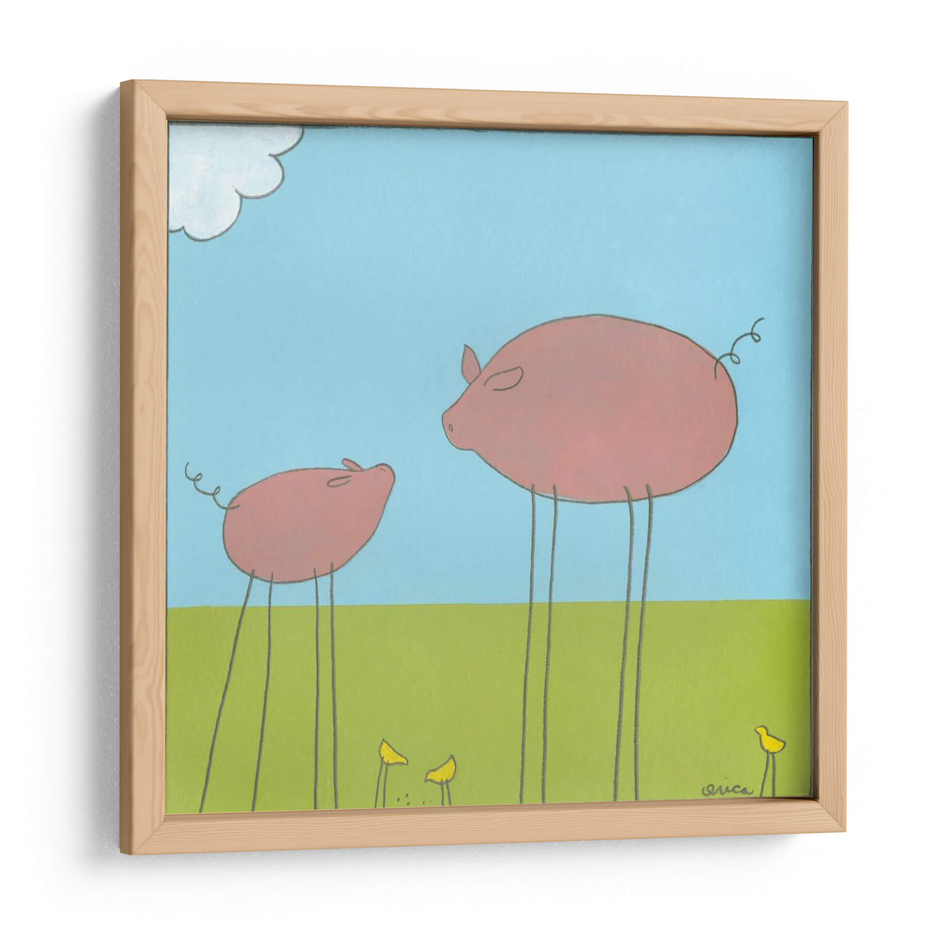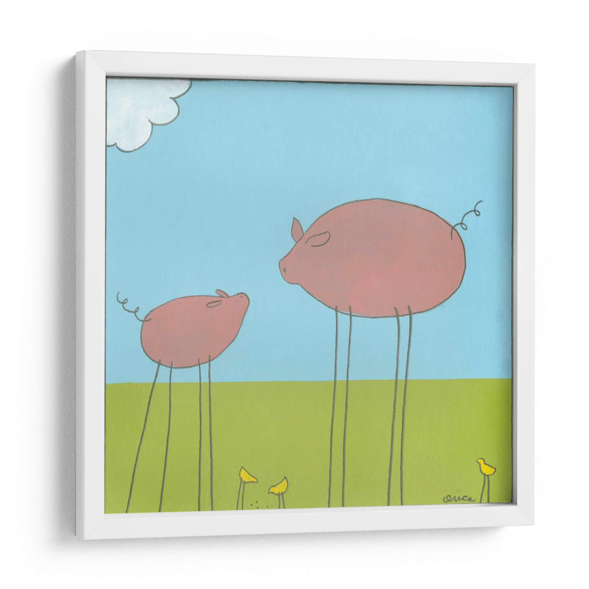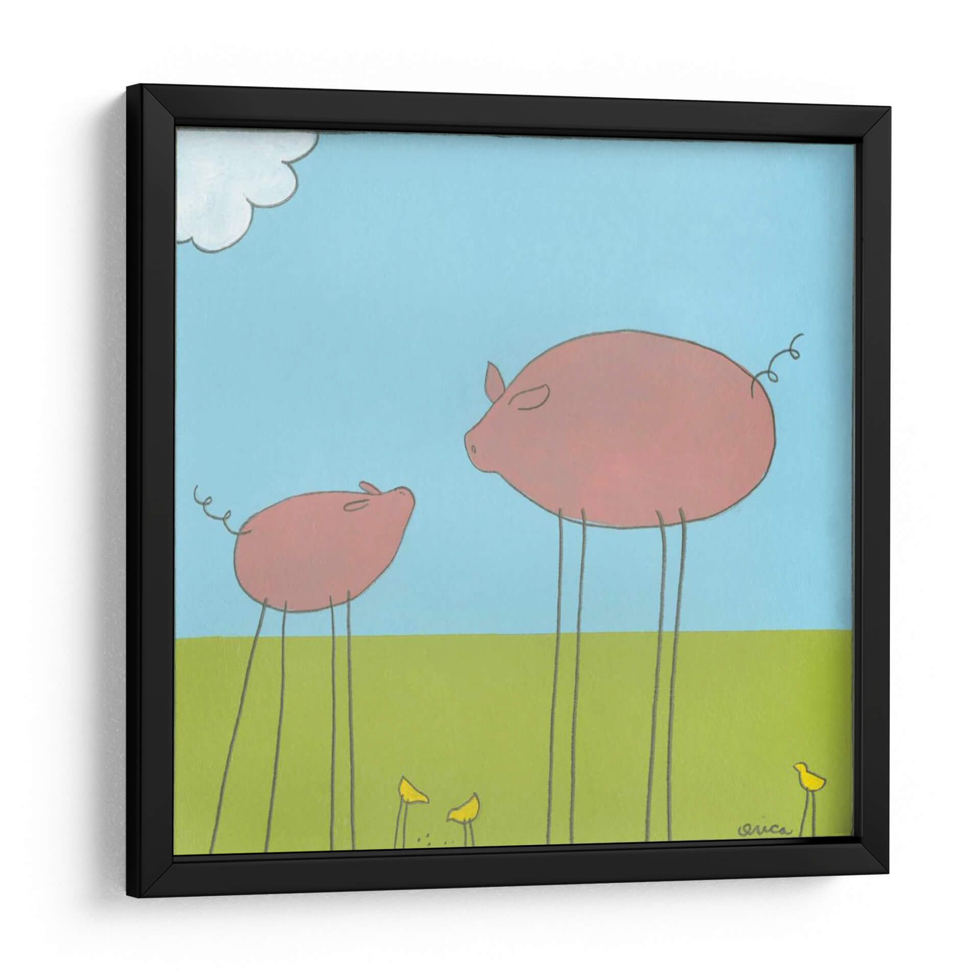 Captura la imaginación con "Cerdo De La Pierna II", una obra de arte encantadora y peculiar del artista June Erica Vess. Esta pieza presenta dos cerdos rosados, uno grande y uno pequeño, que se destacan sobre un vibrante campo verde bajo un cielo azul claro con una nube juguetona. Los animales, con sus delgadas y largas patas, aportan un toque surrealista y divertido a la escena, mientras que las pequeñas flores amarillas y los pájaros añaden detalles adorables. La paleta de colores es brillante y alegre, dominada por azules y verdes que evocan una sensación de paz y simplicidad. El estilo de Vess es distintivo, con líneas limpias y formas redondeadas que crean una estética amigable y accesible. "Cerdo De La Pierna II" es ideal para añadir un toque de humor y originalidad a cualquier espacio, desde una sala de estar moderna hasta una habitación infantil o una oficina con personalidad. Este cuadro decorativo es perfecto para aquellos que buscan piezas únicas que provoquen una sonrisa y generen conversación, transmitiendo una atmósfera de inocencia y calidez.