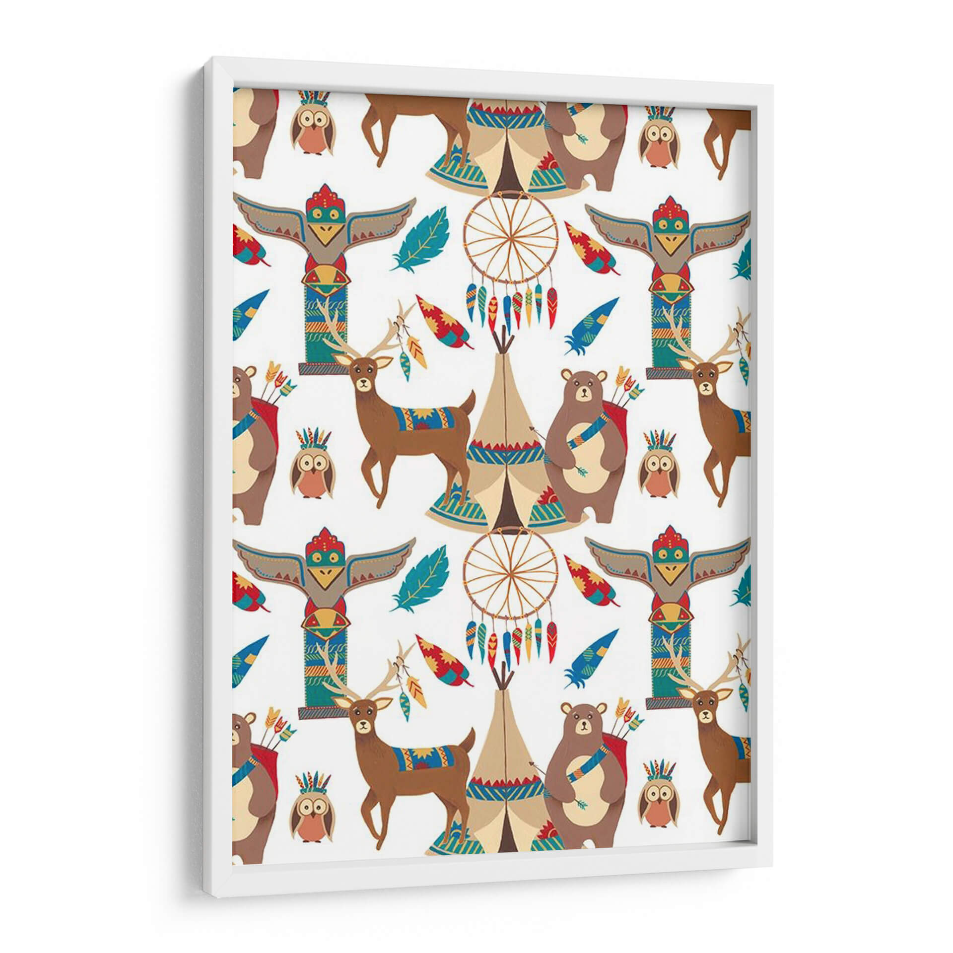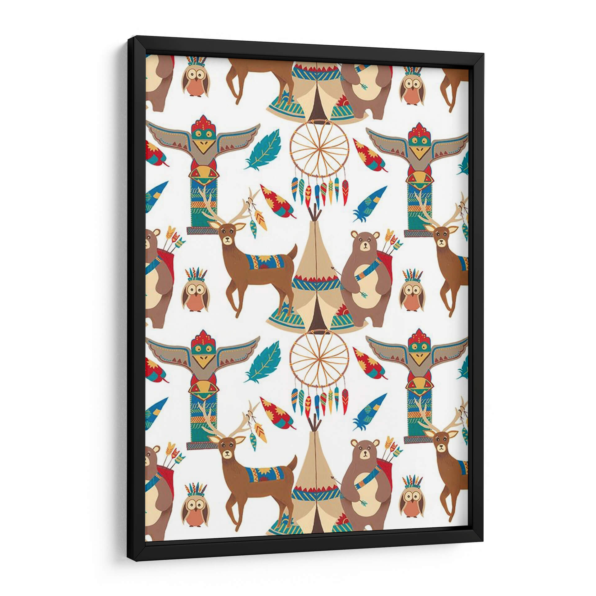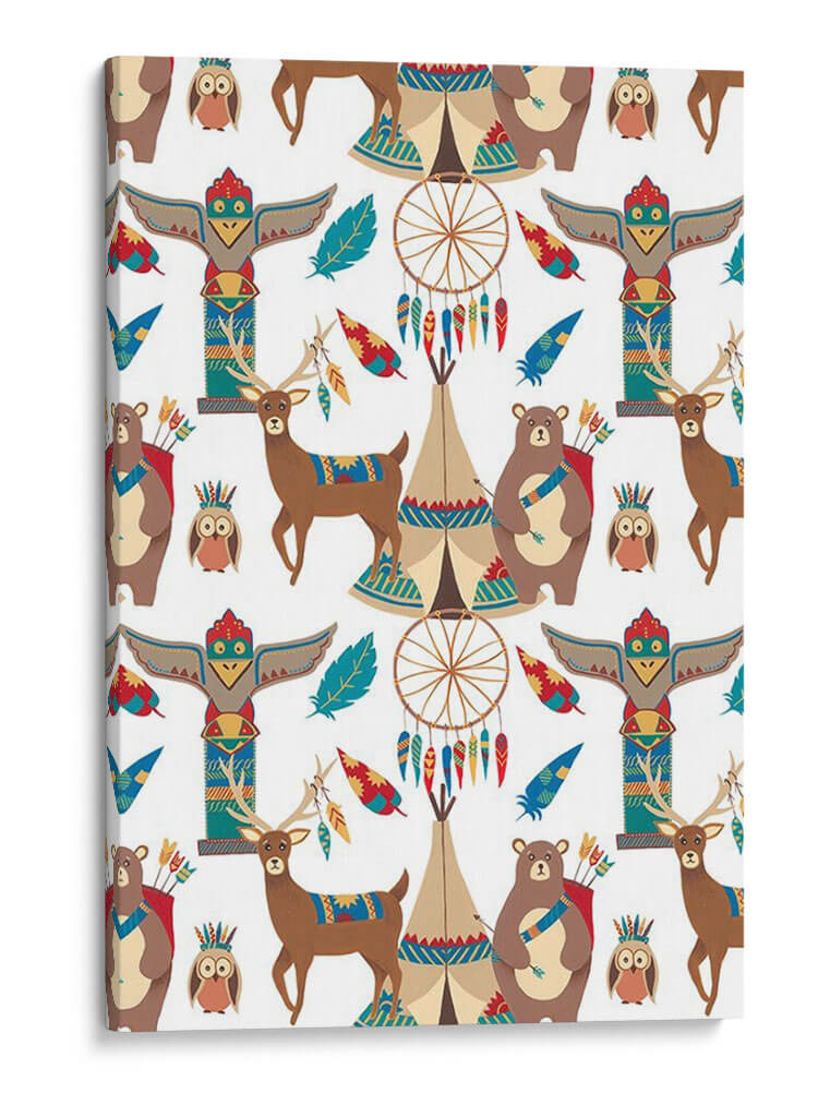 Sumérgete en la magia del espíritu nativo americano con esta cautivadora obra de arte, 'Colección Warland Warriors E', de la talentosa Regina Moore. Esta pieza presenta un vibrante patrón repetitivo que celebra la conexión con la naturaleza y la cultura tribal. El diseño está poblado por encantadores osos, ciervos majestuosos, búhos sabios, tótems estilizados y alegres tipis, todos dispuestos sobre un fondo blanco inmaculado que resalta cada detalle. La paleta de colores, rica en tonos tierra, azules profundos y acentos rojos y amarillos, evoca una sensación de aventura y armonía con el entorno natural. Las plumas y los atrapasueños añaden un toque etéreo y espiritual, invitando a la contemplación. Este cuadro decorativo es ideal para infundir calidez y carácter en habitaciones infantiles, salas de estar rústicas o espacios que buscan un toque de originalidad y significado cultural. Transforma tu hogar en un santuario de paz y conexión con la historia con esta pieza única que habla de fuerza, sabiduría y el legado de los guerreros.