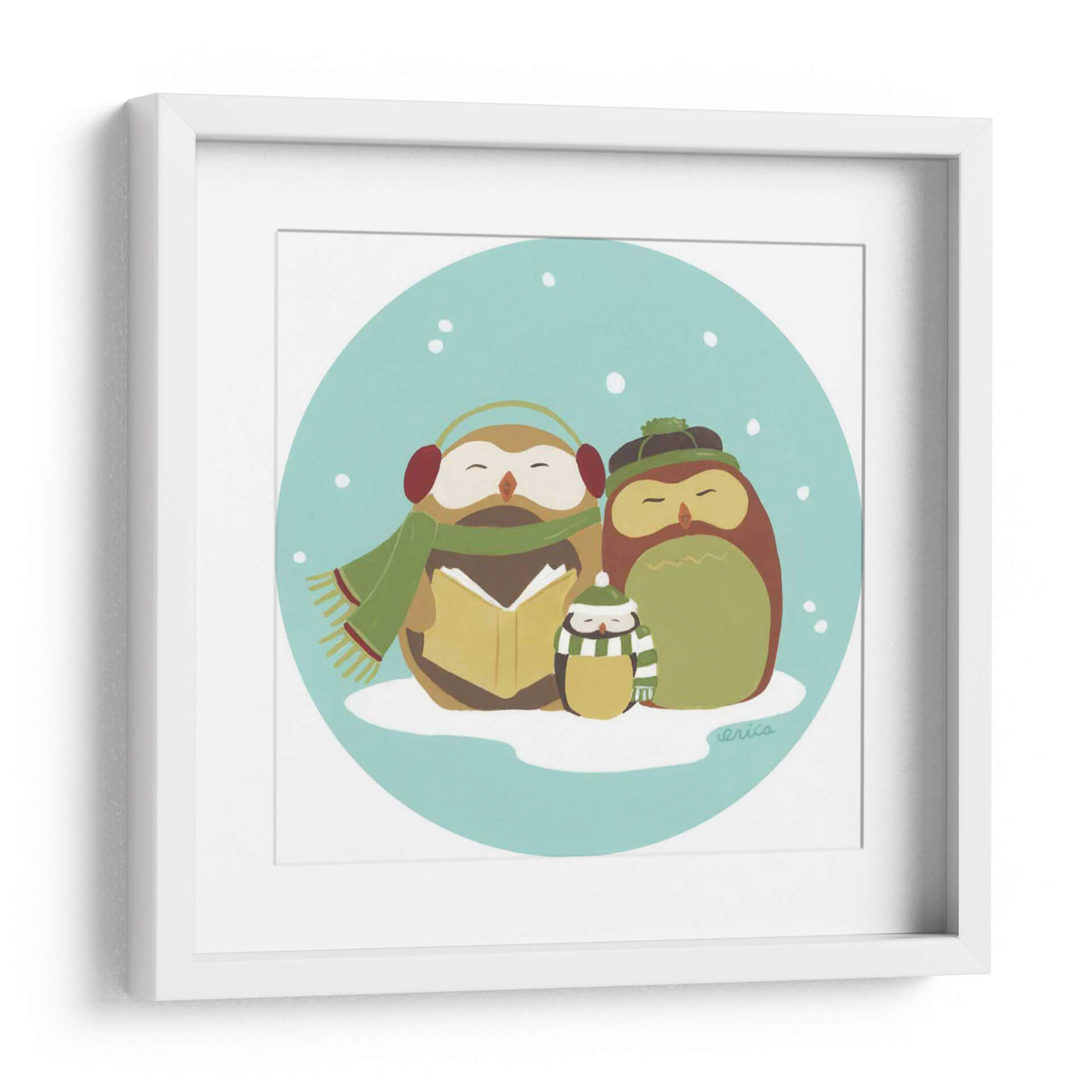 Sumérgete en la ternura invernal con "Felices Owlidays II", una encantadora obra de arte de June Erica Vess que captura la esencia de la calidez familiar y la alegría de las fiestas. Este cuadro decorativo presenta una familia de búhos adorables, vestidos con bufandas y gorros, acurrucados en un paisaje nevado. Uno de los búhos mayores lee un libro, mientras los más pequeños escuchan atentamente, creando una escena conmovedora que evoca sentimientos de unidad y paz. La paleta de colores, dominada por tonos tierra cálidos, verdes acogedores y un fondo azul cielo sereno, transmite una atmósfera de tranquilidad y nostalgia, perfecta para añadir un toque de dulzura a cualquier hogar. El estilo de ilustración, sencillo y encantador, es ideal para espacios infantiles, dormitorios o cualquier rincón que necesite un toque de alegría y color. Esta pieza es una invitación a celebrar los momentos simples y la conexión familiar. El cuadro decorativo "Felices Owlidays II" es una elección perfecta para quienes buscan un arte que irradie felicidad y un espíritu festivo durante todo el año.