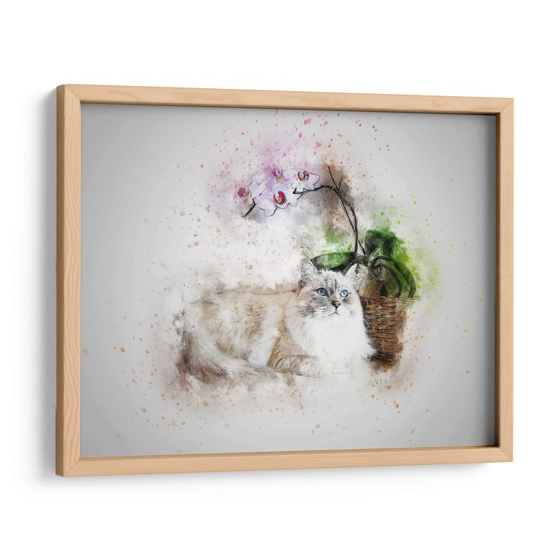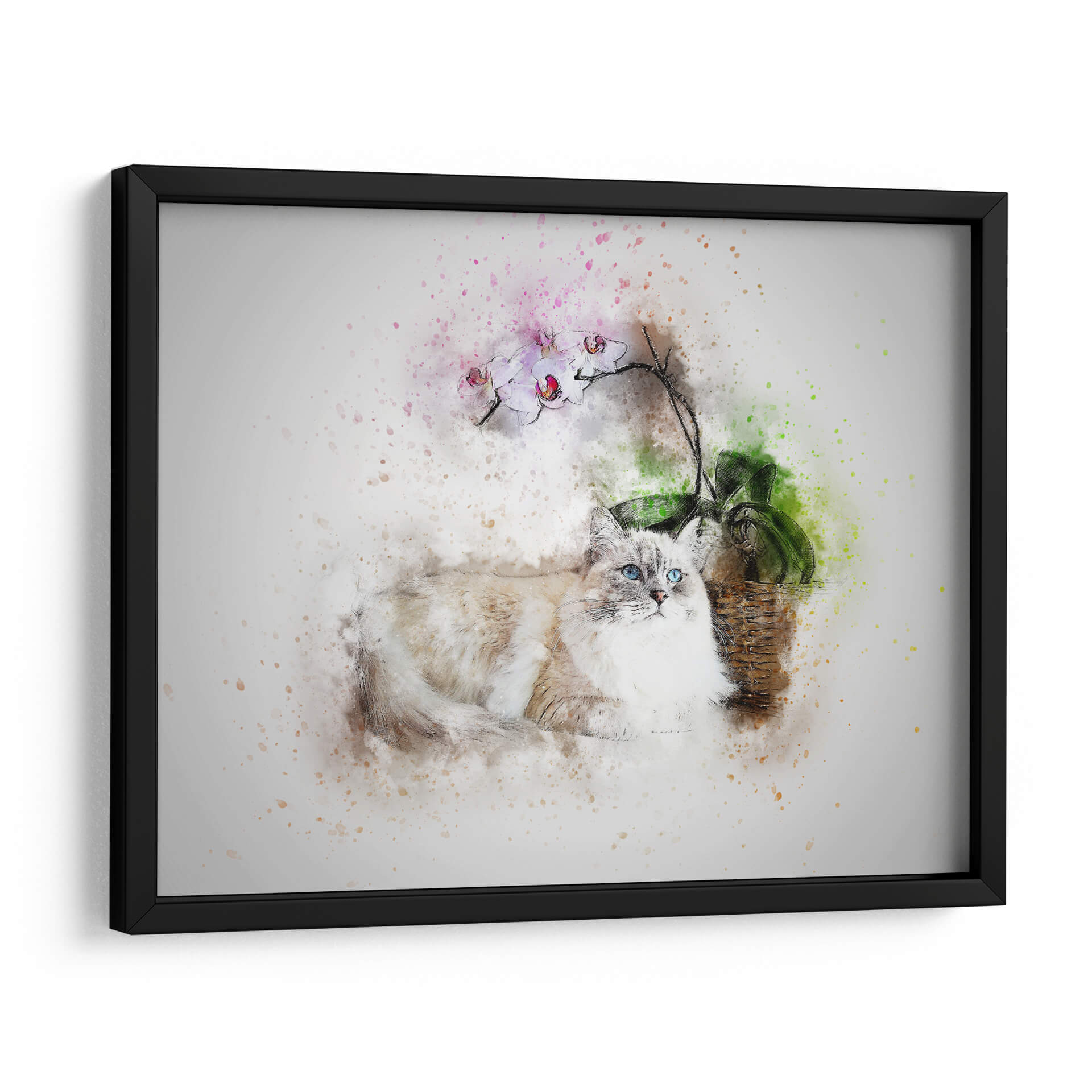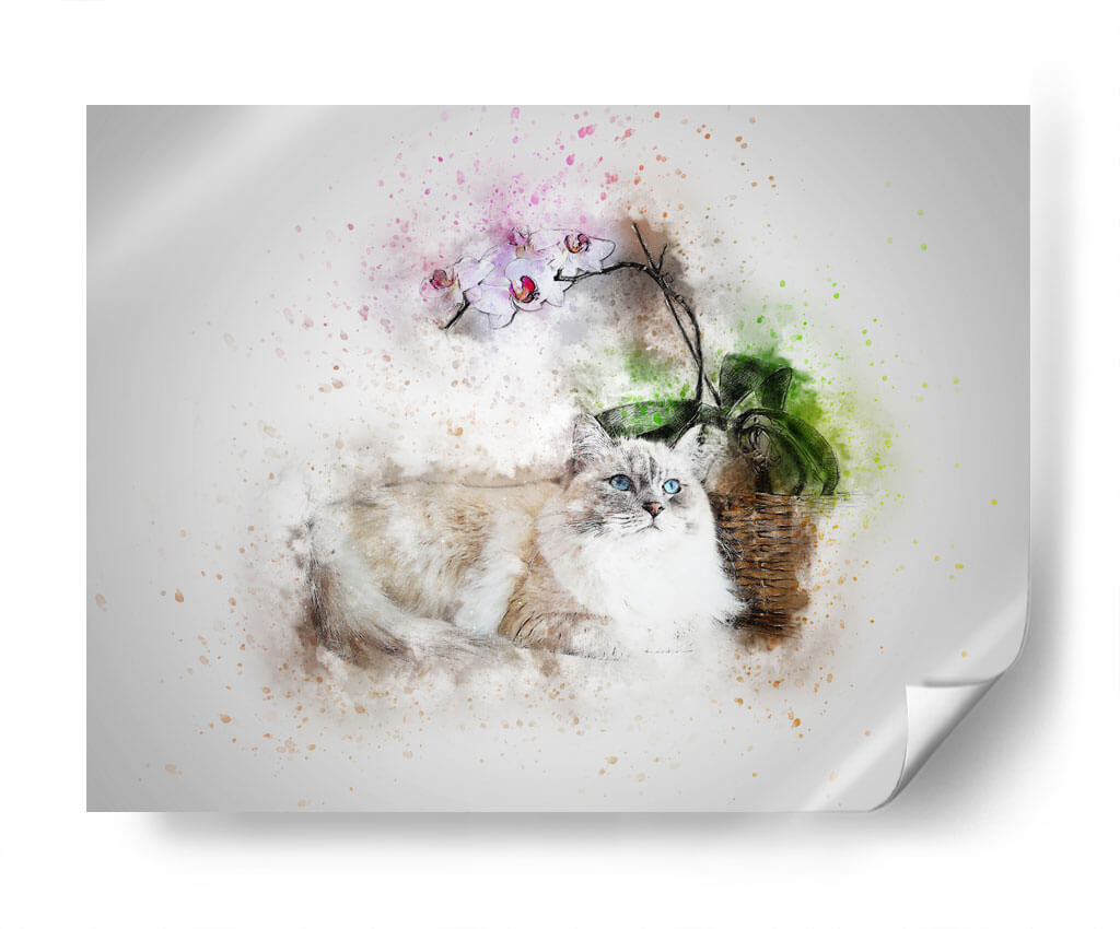 Captura la elegancia y la serenidad con esta exquisita obra de arte de un gato, magistralmente representada con detalles de acuarela. La pieza presenta un felino de pelaje blanco y grisáceo, con penetrantes ojos azules, recostado plácidamente junto a una planta de orquídeas en plena floración. El estilo de acuarela aporta una ligereza etérea y un toque artístico distintivo, con salpicaduras de color rosa, verde y ocre que crean una atmósfera vibrante pero delicada. La composición, centrada en la figura del gato y la floración, transmite una sensación de calma y contemplación. Este lienzo es perfecto para añadir un punto focal de belleza natural y sofisticación a cualquier sala de estar, dormitorio o estudio. Su paleta de colores suaves y los toques de acuarela lo convierten en una pieza decorativa ideal para espacios que buscan un ambiente acogedor y con carácter. Ideal para amantes de los gatos y apreciadores del arte contemporáneo con un toque de suavidad.