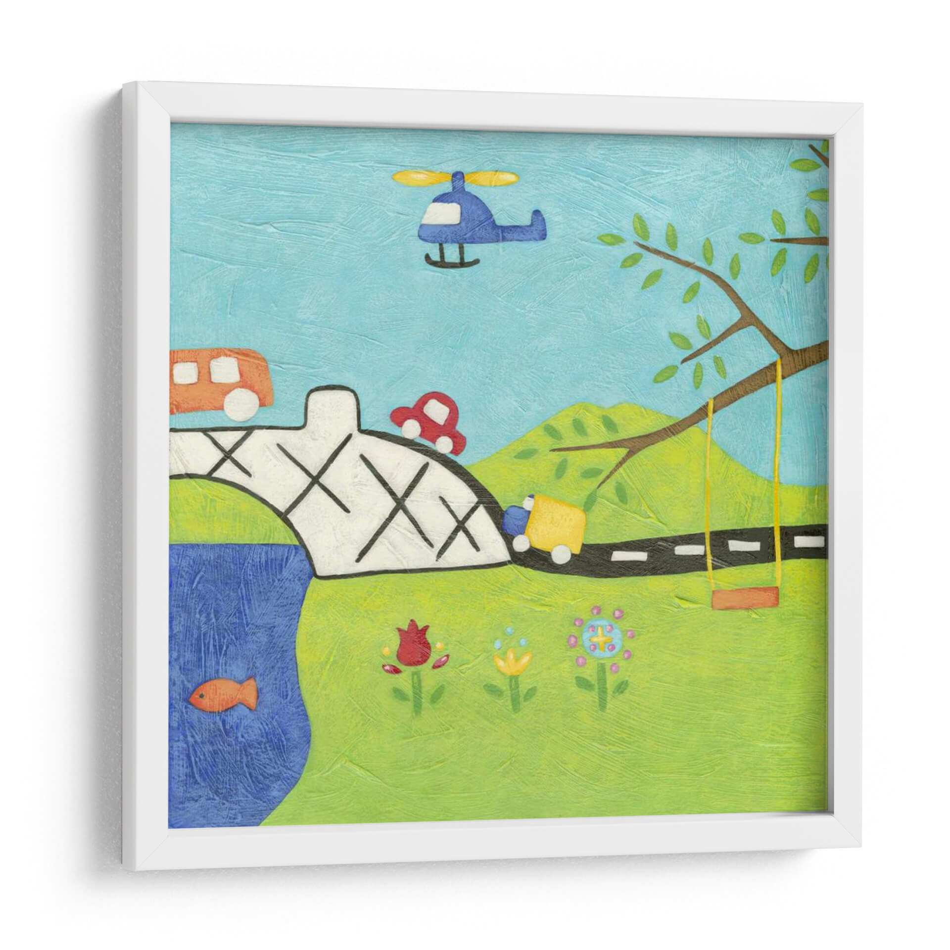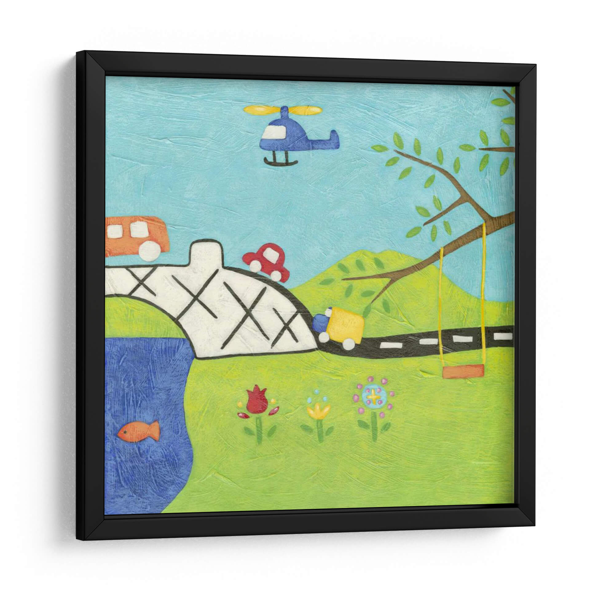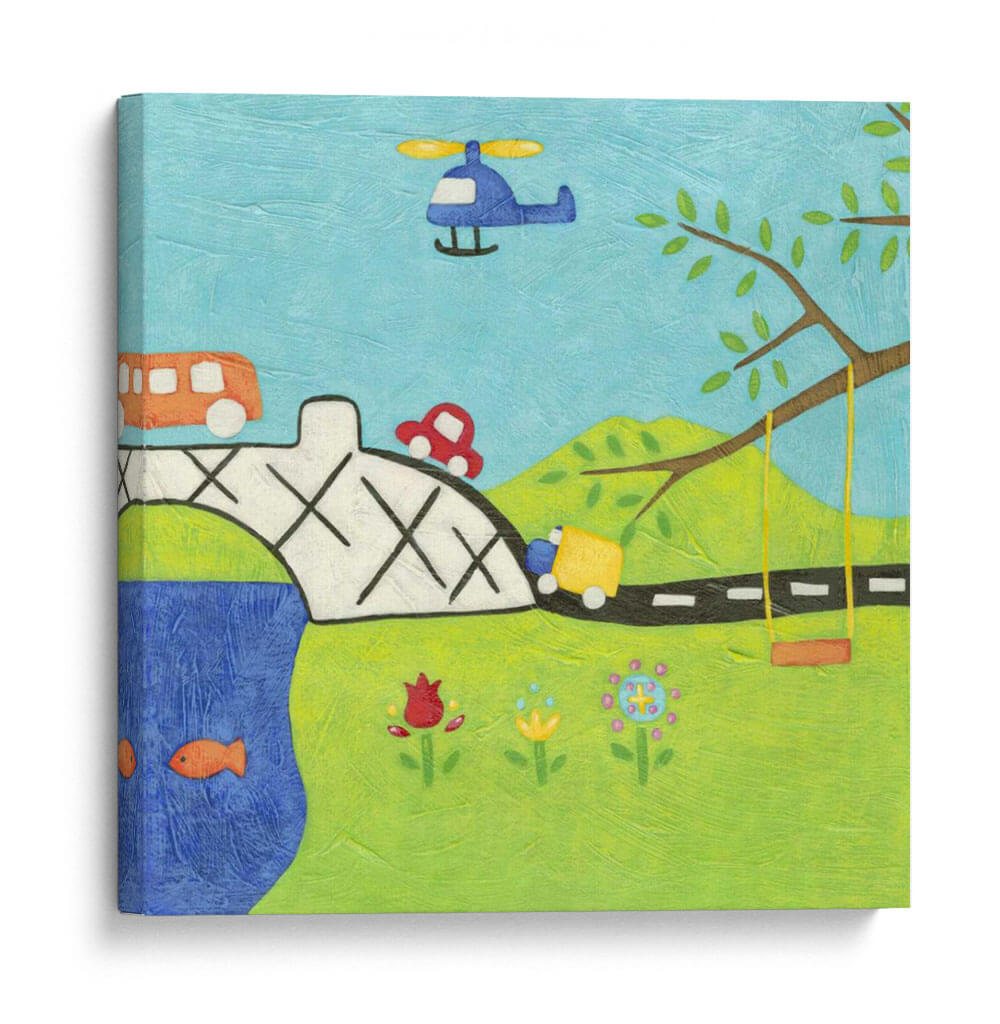 Sumérgete en un mundo de fantasía y juego con "Lejano Y Lejos Ii" de Chariklia Zarris, una obra de arte que evoca la inocencia y la aventura de la infancia. Este cuadro decorativo captura una escena vibrante y alegre, llena de elementos entrañables: un puente robusto sobre un río azul, vehículos de colores como un autobús y un camión, un coche rojo juguetón, y un helicóptero surcando el cielo claro. El verde exuberante del paisaje se adorna con flores sencillas y una rama robusta que sostiene un columpio, invitando a imaginar momentos de diversión despreocupada. La paleta de colores vivos y la textura palpable de la obra transmiten una sensación de calidez y optimismo. Ideal para habitaciones infantiles, ludotecas o cualquier espacio que busque un toque de alegría y nostalgia, "Lejano Y Lejos Ii" es una invitación a celebrar la imaginación y los pequeños grandes placeres de la vida. Añade esta pieza única a tu decoración para infundir energía positiva y encanto a tu hogar.
