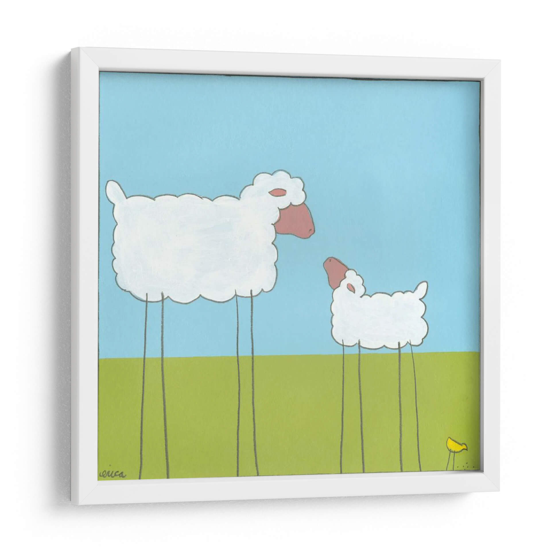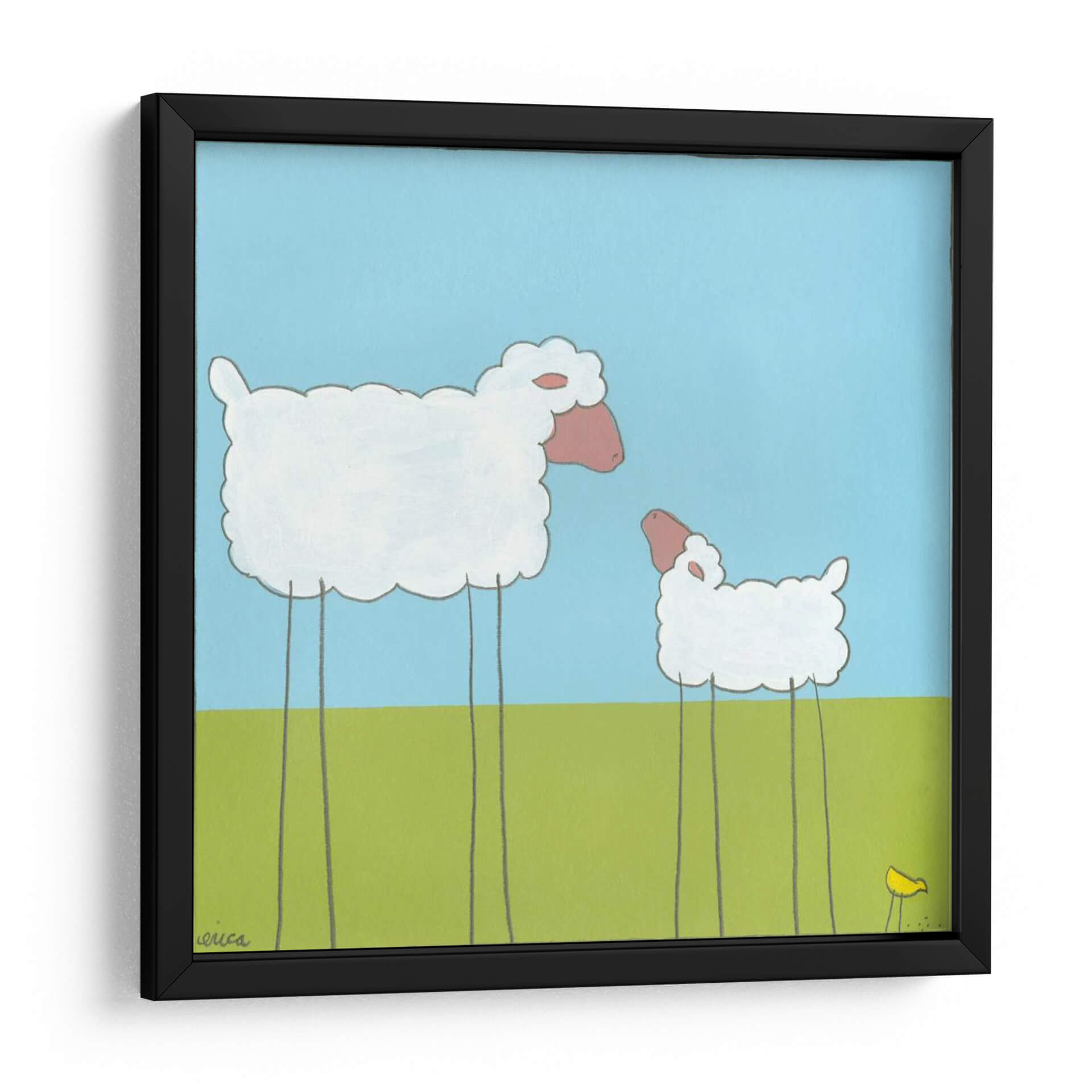 Sumérgete en la ternura y el encanto de "Oveja De La Pierna I", una obra de arte que captura la inocencia y la simplicidad de la naturaleza. Este cuadro decorativo, creado por la talentosa June Erica Vess, presenta dos ovejas estilizadas con un diseño minimalista y juguetón, destacando sobre un fondo de cielo azul claro y un prado verde vibrante. La paleta de colores, dominada por blancos puros, rosas suaves y verdes y azules alegres, crea una atmósfera de calma y serenidad, perfecta para cualquier espacio que necesite un toque de dulzura. La composición, con las ovejas de patas largas y delgadas, aporta un elemento surrealista y peculiar que invita a la contemplación y la sonrisa. Ideal para habitaciones infantiles, dormitorios, salas de estar o cualquier rincón que busque una dosis de alegría y originalidad, este cuadro decorativo se convertirá en un punto focal que evoca sensaciones de paz y bienestar. Añade una pincelada de arte contemporáneo y un aire de inocencia pastoral a tu hogar con esta pieza única.