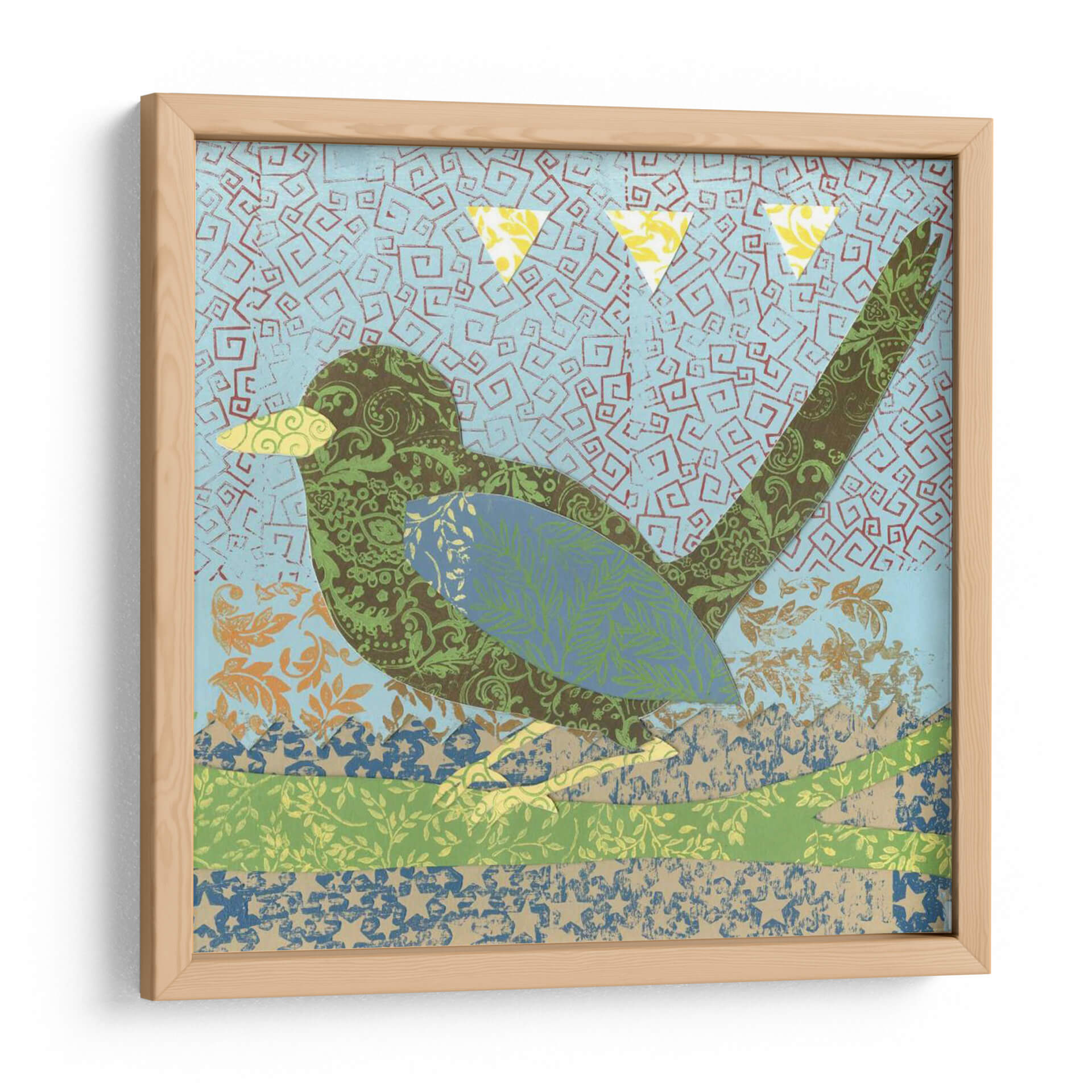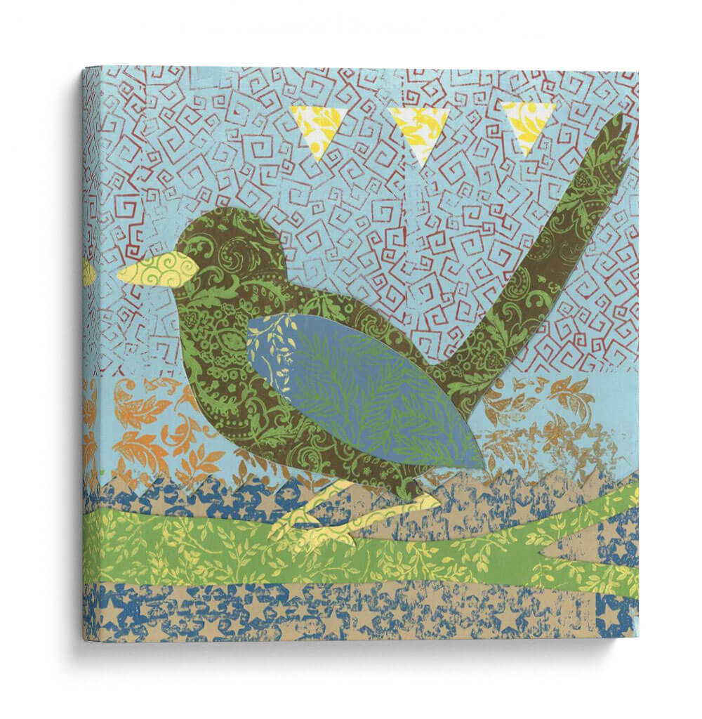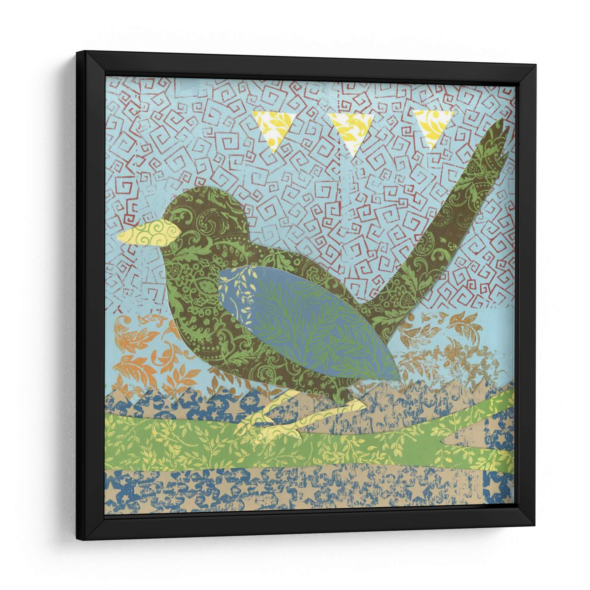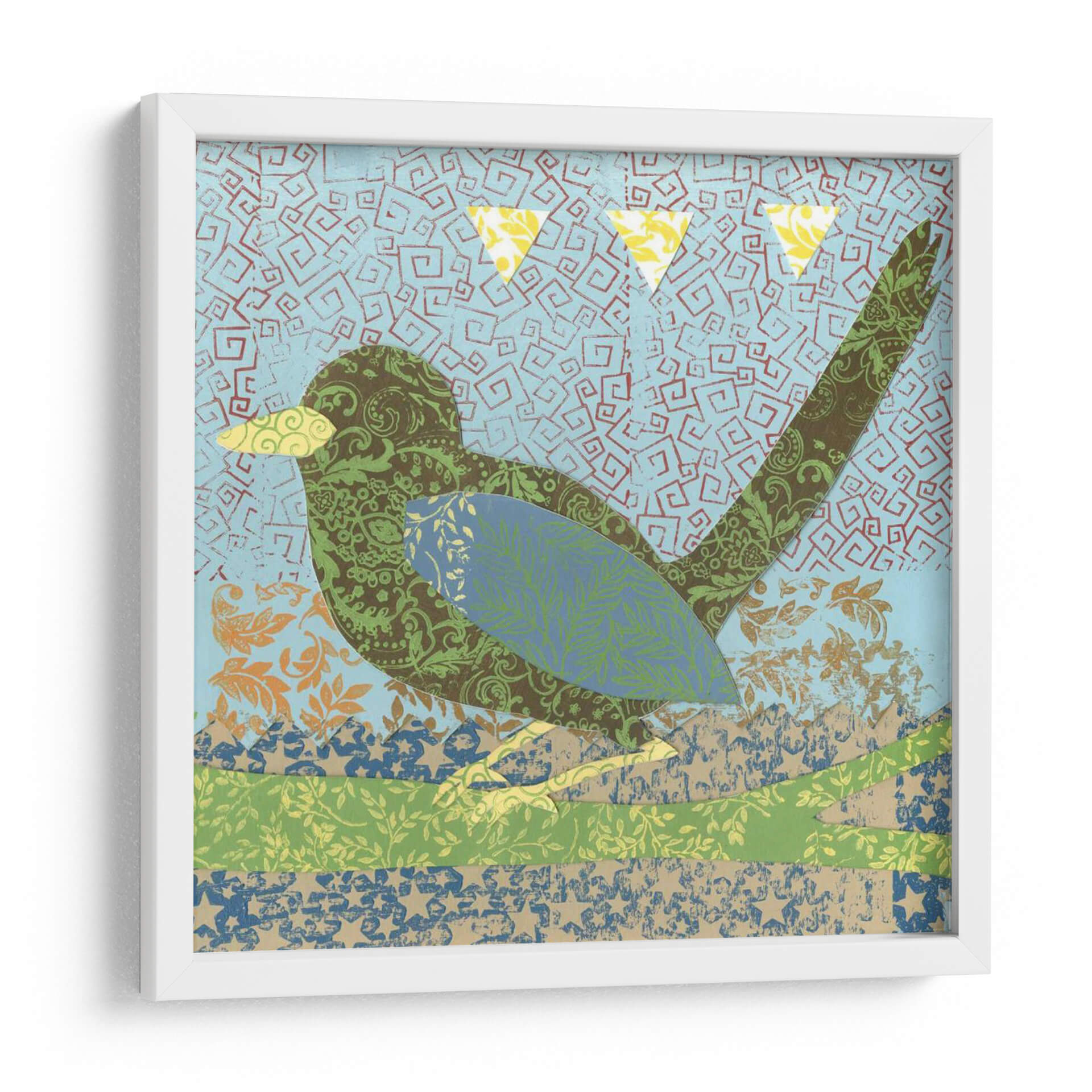 Sumérgete en la encantadora obra 'Patrones De Vuelo Ii' de Megan Meagher, una pieza que combina la naturaleza y la abstracción con una paleta de colores vibrantes y texturas ricas. Este cuadro decorativo presenta un pájaro estilizado, compuesto enteramente de intrincados patrones florales y geométricos en tonos verdes, marrones y azules. El fondo, de un azul cielo salpicado de motivos abstractos en forma de espiral, evoca una sensación de movimiento y aire libre. Las sutiles texturas de diferentes papeles o telas superpuestas añaden profundidad y un tacto artesanal a la composición. Tres triángulos amarillos flotan en la parte superior, añadiendo un toque de alegría y dinamismo. El estilo distintivo de Meagher, que mezcla elementos collagistas con un diseño gráfico audaz, hace de esta obra una adición única y cautivadora a cualquier espacio. Ideal para infundir energía y un espíritu bohemio en salones, dormitorios o estudios, este cuadro decorativo es una celebración de la creatividad y la belleza natural, transformando tus paredes en un lienzo de expresión artística contemporánea.