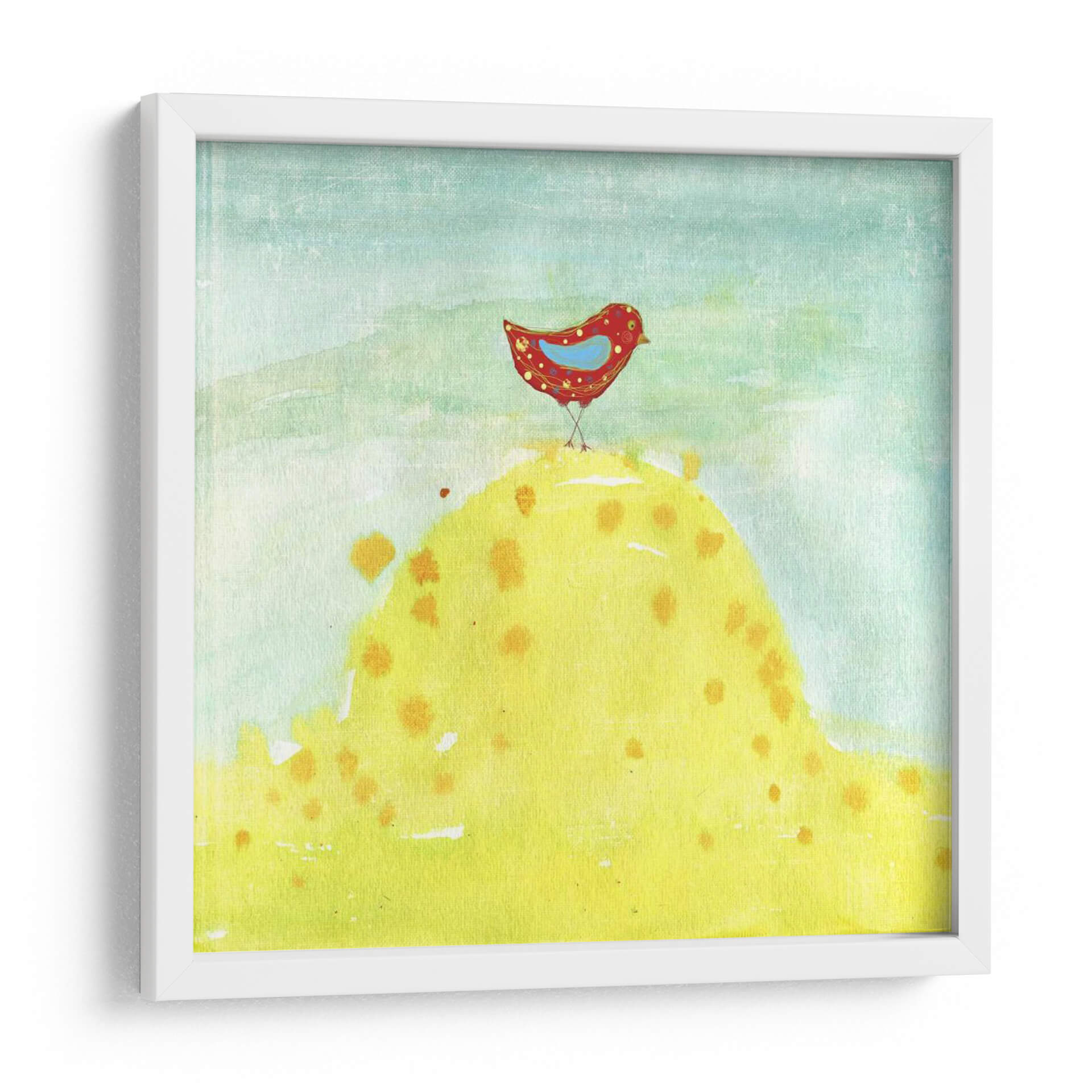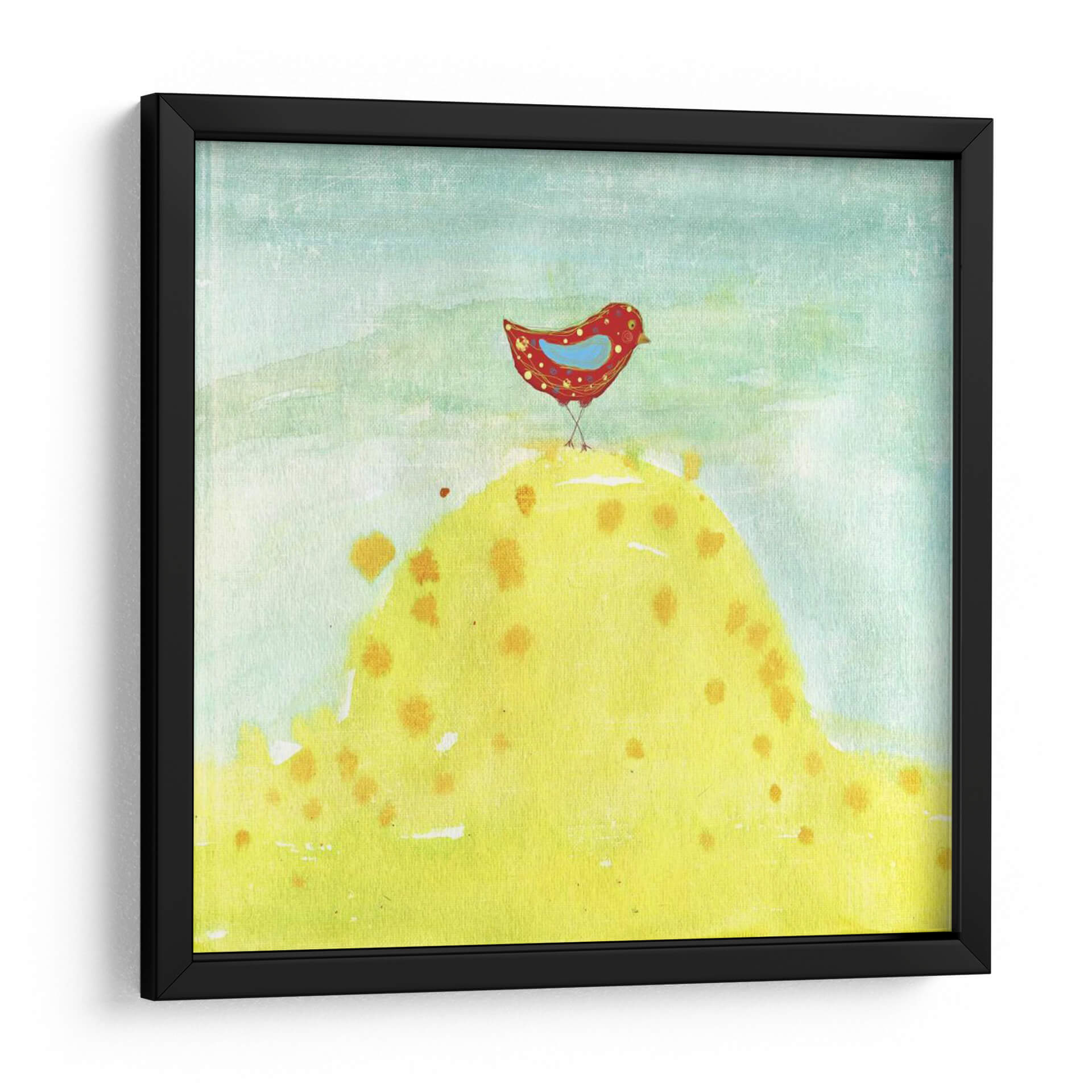 Sumérgete en la encantadora y vibrante obra de arte 'Plumas, Puntos Y Rayas Xii' de Ingrid Blixt, una pieza que irradia alegría y simplicidad. Este cuadro decorativo presenta una simpática figura de pájaro de color rojo brillante, adornado con puntos dorados y un interior azul sereno, posado en la cima de una colina exuberante de un amarillo radiante. La colina, salpicada de motas doradas que evocan pétalos o gotas de rocío, se alza contra un cielo etéreo en tonos celestes y aguamarina, que aportan una sensación de amplitud y calma. La técnica de acuarela y texturas sutiles otorgan a la pieza una cualidad etérea y artesanal, invitando a la contemplación. El estilo es figurativo con un toque naíf y contemporáneo, perfecto para añadir un punto de color y optimismo a cualquier espacio. Ideal para decorar salas de estar modernas, dormitorios infantiles o como un acento alegre en una oficina, este cuadro abstracto con elementos figurativos aportará una atmósfera de serenidad y vitalidad, recordándonos la belleza de las cosas sencillas de la vida. Es una adición perfecta para quienes buscan arte de pared que transmita emociones positivas y un diseño único.