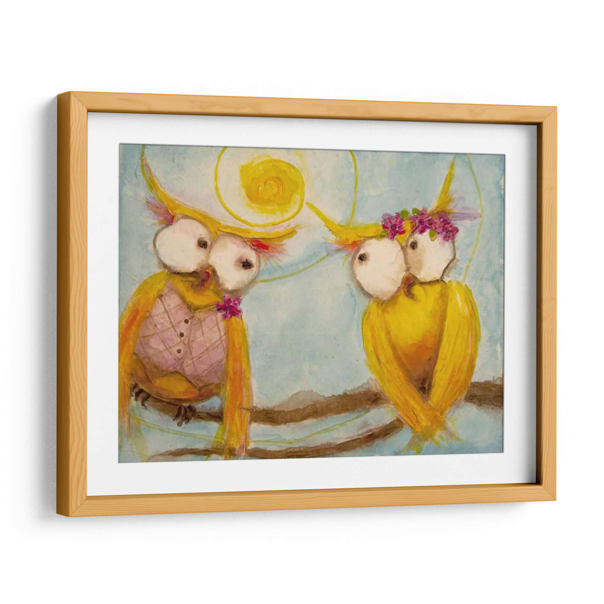 Sumérgete en la ternura y el encanto de "Rama De Hoos Para Dos", una obra de arte vibrante y llena de personalidad de Marabeth Quin. Este cuadro decorativo captura la esencia de dos adorables búhos, adornados con flores y vestimenta singular, posados juntos en una rama. La paleta de colores, dominada por amarillos cálidos y un cielo azul sereno, junto con detalles en tonos tierra, crea una atmósfera alegre y acogedora. El estilo, con toques de acuarela y una ejecución que recuerda a la ilustración infantil, transmite una sensación de inocencia y conexión. Las grandes y expresivas ojos de los búhos invitan a la contemplación y añaden un toque de humor y dulzura a la composición. Es una pieza perfecta para añadir un punto de interés y calidez a cualquier espacio, ideal para dormitorios, salas de estar o incluso una guardería, infundiendo alegría y un espíritu juguetón. Este cuadro decorativo es una celebración de la compañía y la naturaleza, diseñado para evocar sonrisas y conversaciones. Integra elementos de arte contemporáneo con una narrativa visual entrañable, asegurando que destaque como un elemento central en tu decoración.