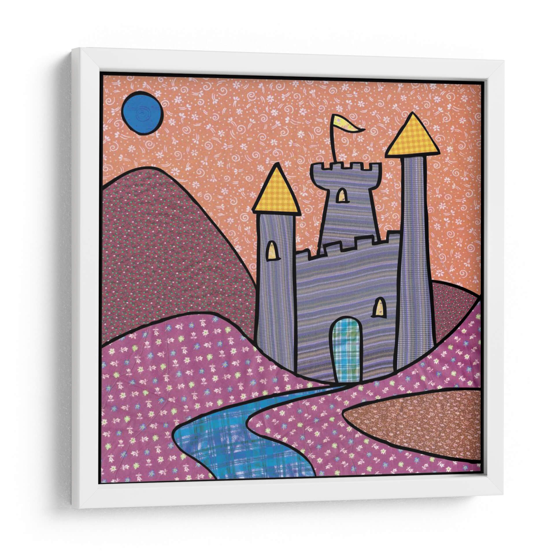 Adéntrate en un mundo de fantasía con 'Reino Calico II', una obra de arte vibrante y juguetona que captura la esencia de un castillo de cuento de hadas rodeado de un paisaje onírico. El artista Charles Swinford nos presenta una composición audaz, dominada por una paleta de colores cálidos y alegres, donde los tonos anaranjados del cielo y los vibrantes morados y rosas del paisaje se fusionan con la majestuosidad de un castillo azul con detalles en amarillo dorado. Las texturas ricas y los patrones intrincados que cubren las colinas y el cielo añaden una profundidad visual fascinante, invitando al espectador a explorar cada rincón de esta escena encantadora. La luna azul suspendida en el firmamento y el río serpenteante que atraviesa el valle complementan la narrativa visual, evocando una sensación de maravilla y aventura. Este cuadro decorativo es perfecto para infundir alegría y un toque de escapismo en cualquier habitación, ya sea una sala de estar, un dormitorio infantil o una oficina que necesite un soplo de vitalidad y creatividad. Su estilo único, que mezcla elementos naïf con una ejecución detallada, lo convierte en una pieza de conversación ideal para quienes buscan arte que inspire y transporte.