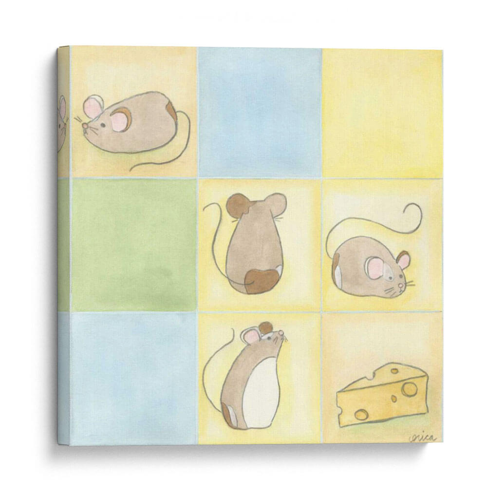 Sumérgete en la encantadora obra de arte "Tic-Tac Ratones En Azul", una pieza que evoca ternura y un toque lúdico. Este cuadro decorativo presenta una composición dividida en nueve secciones cuadradas, cada una con una ilustración de un ratón o un trozo de queso, creadas con un estilo que recuerda a las acuarelas infantiles. Los colores pastel de fondo, que varían entre el azul claro, el verde menta y el amarillo suave, crean una atmósfera serena y alegre, perfecta para añadir un toque de dulzura a cualquier espacio. Las figuras de los ratones, dibujadas con trazos sencillos y líneas finas, transmiten una sensación de inocencia y curiosidad. La presencia del queso añade un elemento juguetón a la escena. "Tic-Tac Ratones En Azul" es ideal para decorar habitaciones infantiles, salas de estar o cualquier rincón que necesite un estallido de color suave y una pizca de fantasía. Esta obra de arte es una invitación a la alegría y la simplicidad, un recordatorio de los pequeños placeres de la vida, y una adición encantadora a tu colección de arte de pared.
