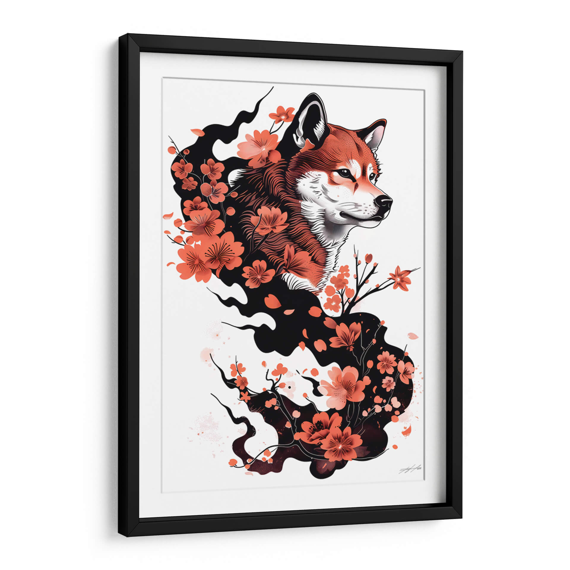 La obra evoca una sensación de lealtad, energía contenida y la belleza efímera de las flores de cerezo, creando una atmósfera de admiración y conexión con el mundo natural y animal. Las flores, con sus pétalos delicados y sus ramas finas, añaden un elemento de gracia y movimiento, mientras que la mirada penetrante del Shiba Inu aporta intensidad. Es una pieza que invita a la contemplación y realza la decoración con su originalidad y su profunda resonancia emocional.