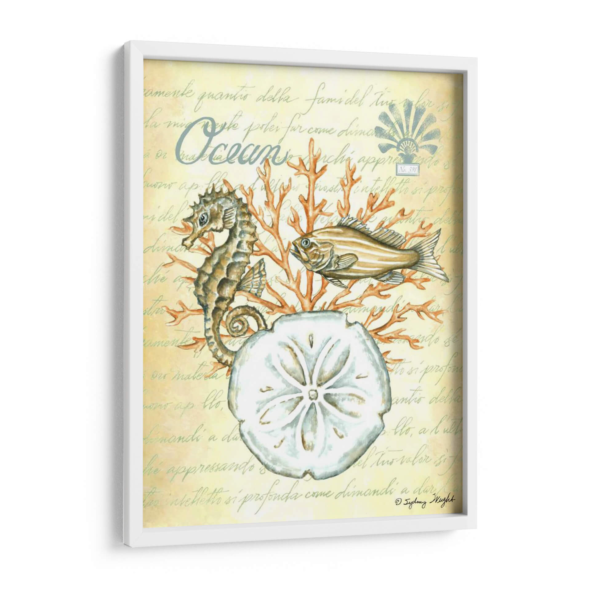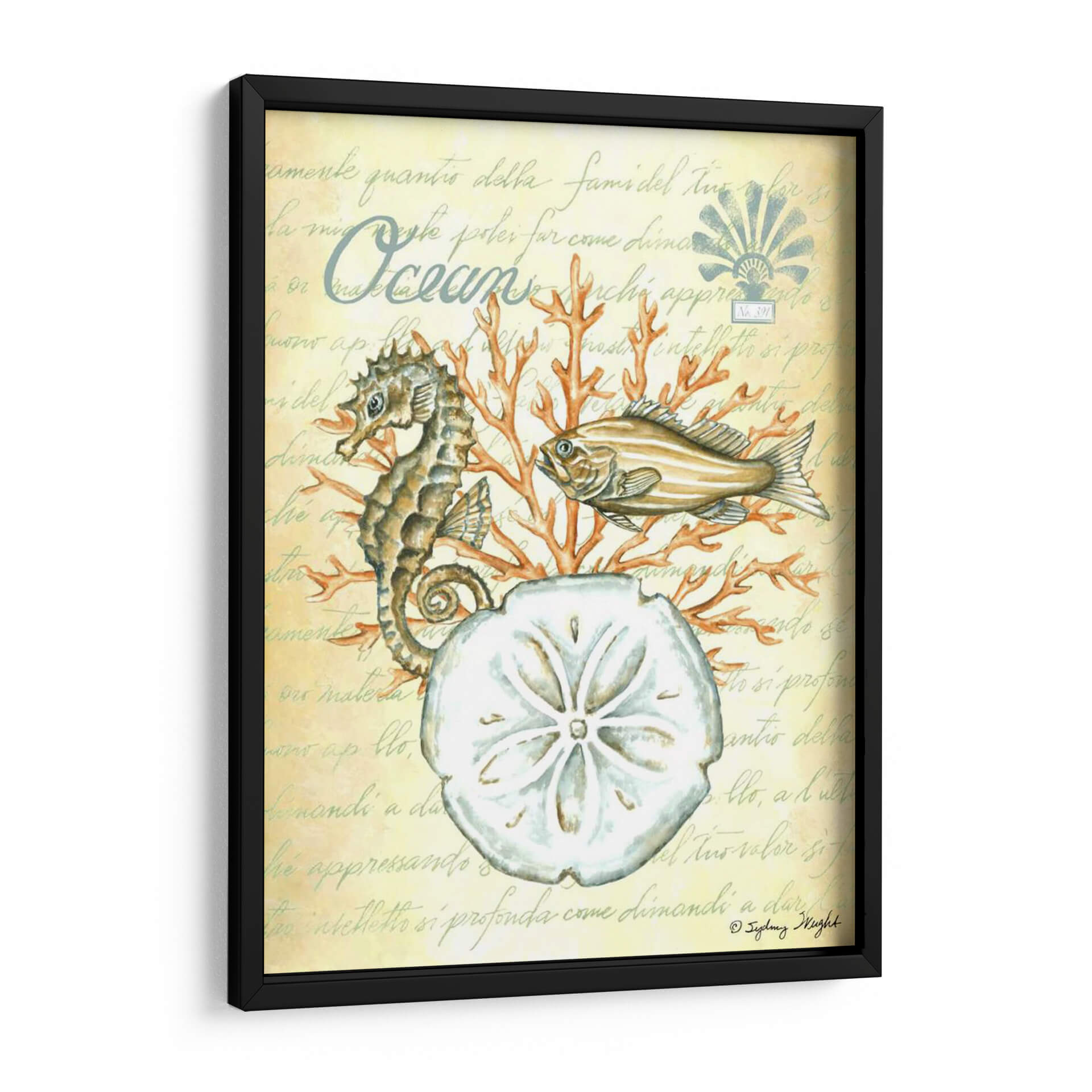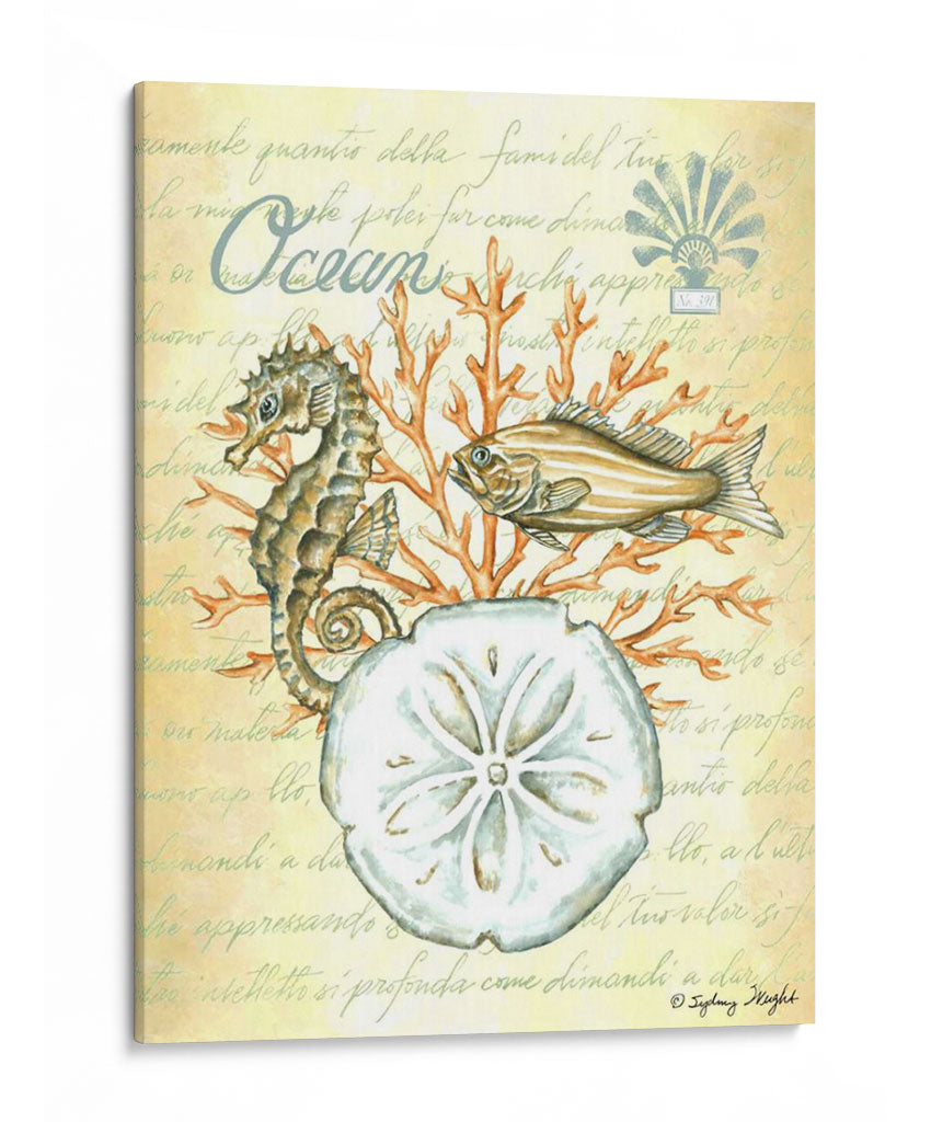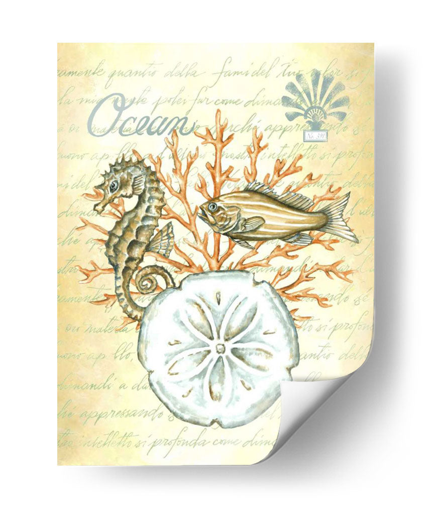 Sumérgete en la serenidad del océano con "Bajo El Mar III", una cautivadora obra de arte de Sydney Wright. Esta pieza evoca la tranquilidad de las profundidades marinas, presentando un detallado caballito de mar, un pez de aspecto sereno y la delicada forma de un dólar de arena, todo ello rodeado de vibrantes corales. La paleta de colores, dominada por tonos suaves y terrosos con toques de naranja coral, crea una atmósfera de calma y conexión con la naturaleza. El fondo texturizado con escritura antigua añade un toque de misterio y elegancia, sugiriendo la historia y el encanto del mundo submarino. "Bajo El Mar III" es ideal para añadir un toque de paz y sofisticación a cualquier espacio, ya sea una sala de estar, un dormitorio o un estudio. Este cuadro decorativo es perfecto para los amantes del mar y para quienes buscan infundir serenidad y belleza natural en su hogar u oficina. Descubre la magia del mundo acuático y transforma tu decoración con esta exquisita pieza.