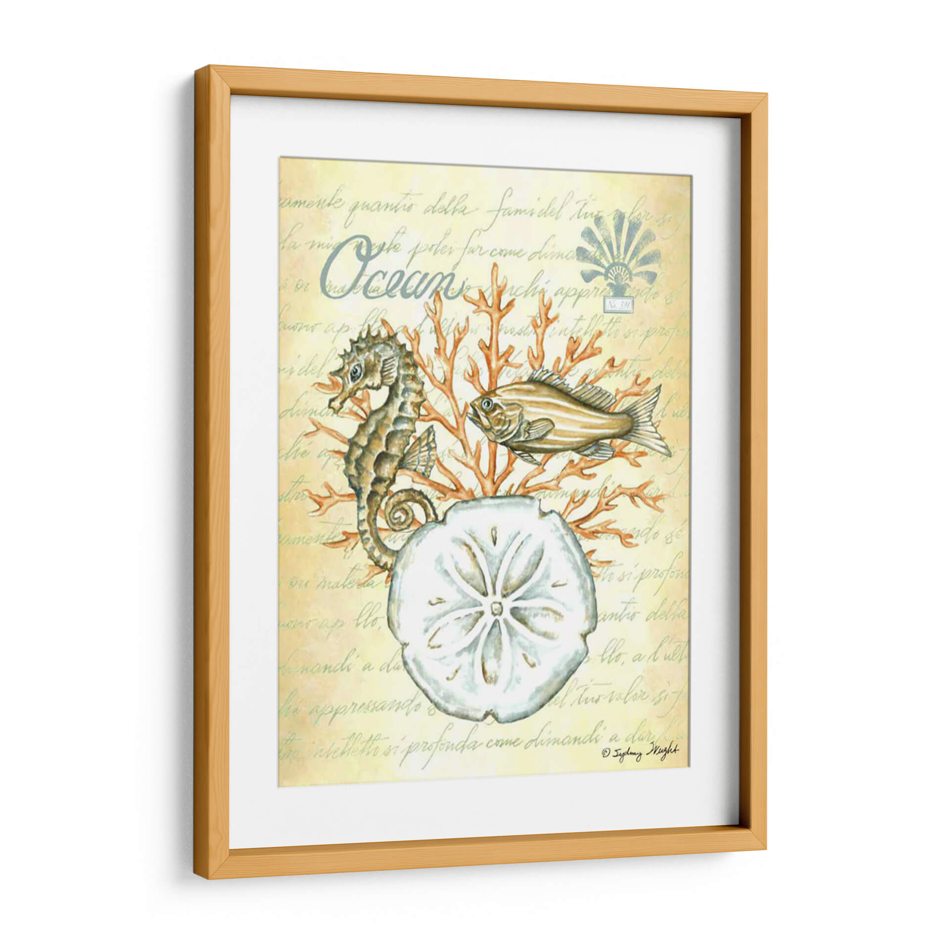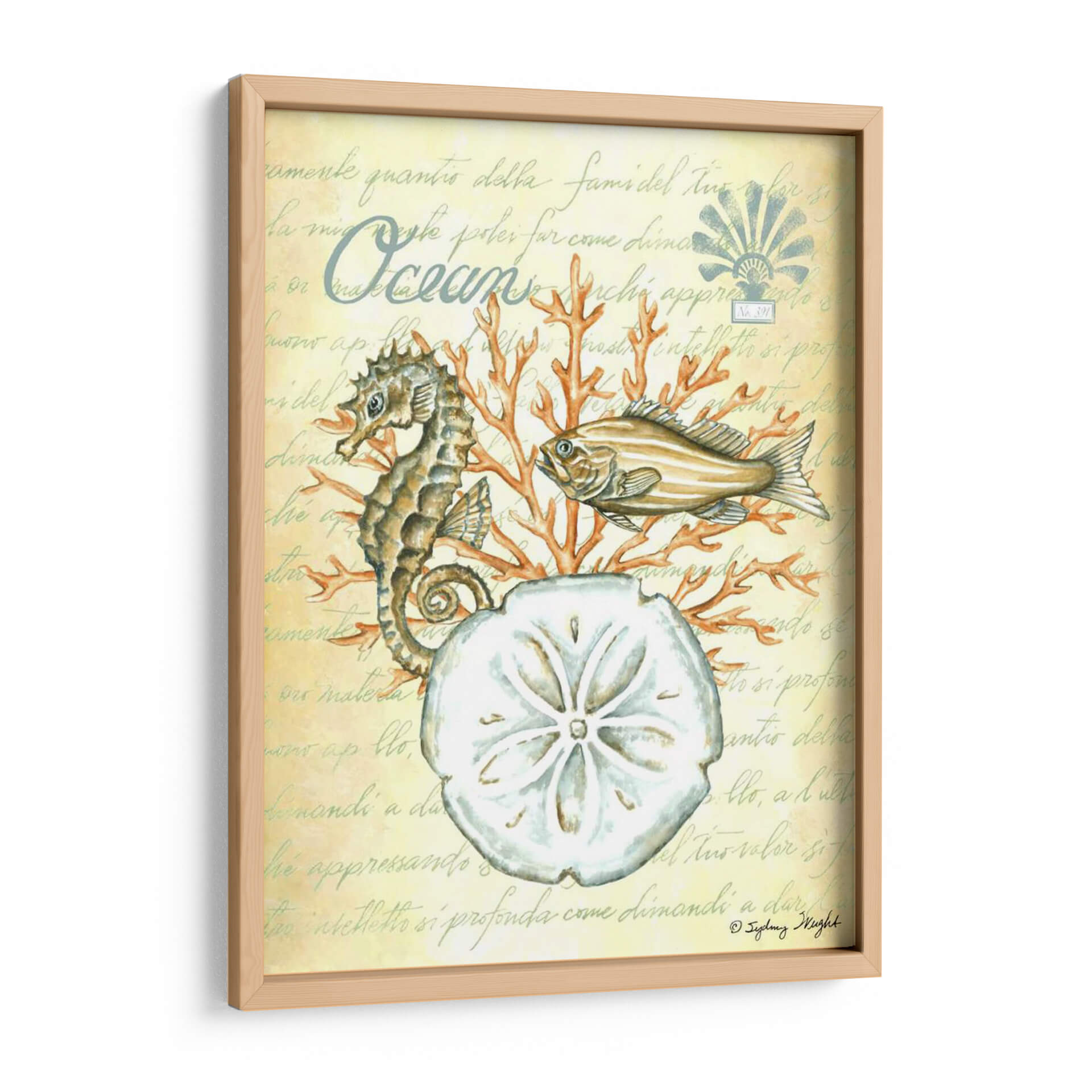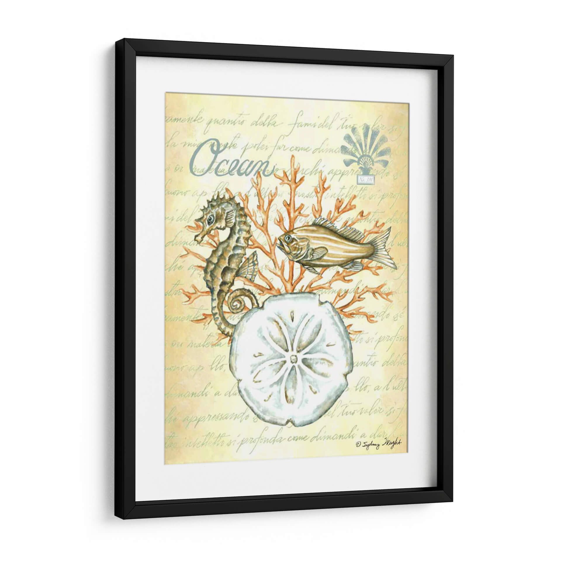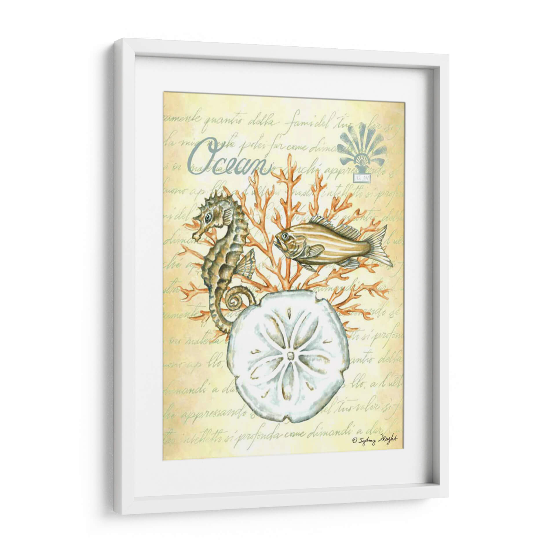 Sumérgete en la serenidad del océano con "Bajo El Mar III", una cautivadora obra de arte de Sydney Wright. Esta pieza evoca la tranquilidad de las profundidades marinas, presentando un detallado caballito de mar, un pez de aspecto sereno y la delicada forma de un dólar de arena, todo ello rodeado de vibrantes corales. La paleta de colores, dominada por tonos suaves y terrosos con toques de naranja coral, crea una atmósfera de calma y conexión con la naturaleza. El fondo texturizado con escritura antigua añade un toque de misterio y elegancia, sugiriendo la historia y el encanto del mundo submarino. "Bajo El Mar III" es ideal para añadir un toque de paz y sofisticación a cualquier espacio, ya sea una sala de estar, un dormitorio o un estudio. Este cuadro decorativo es perfecto para los amantes del mar y para quienes buscan infundir serenidad y belleza natural en su hogar u oficina. Descubre la magia del mundo acuático y transforma tu decoración con esta exquisita pieza.