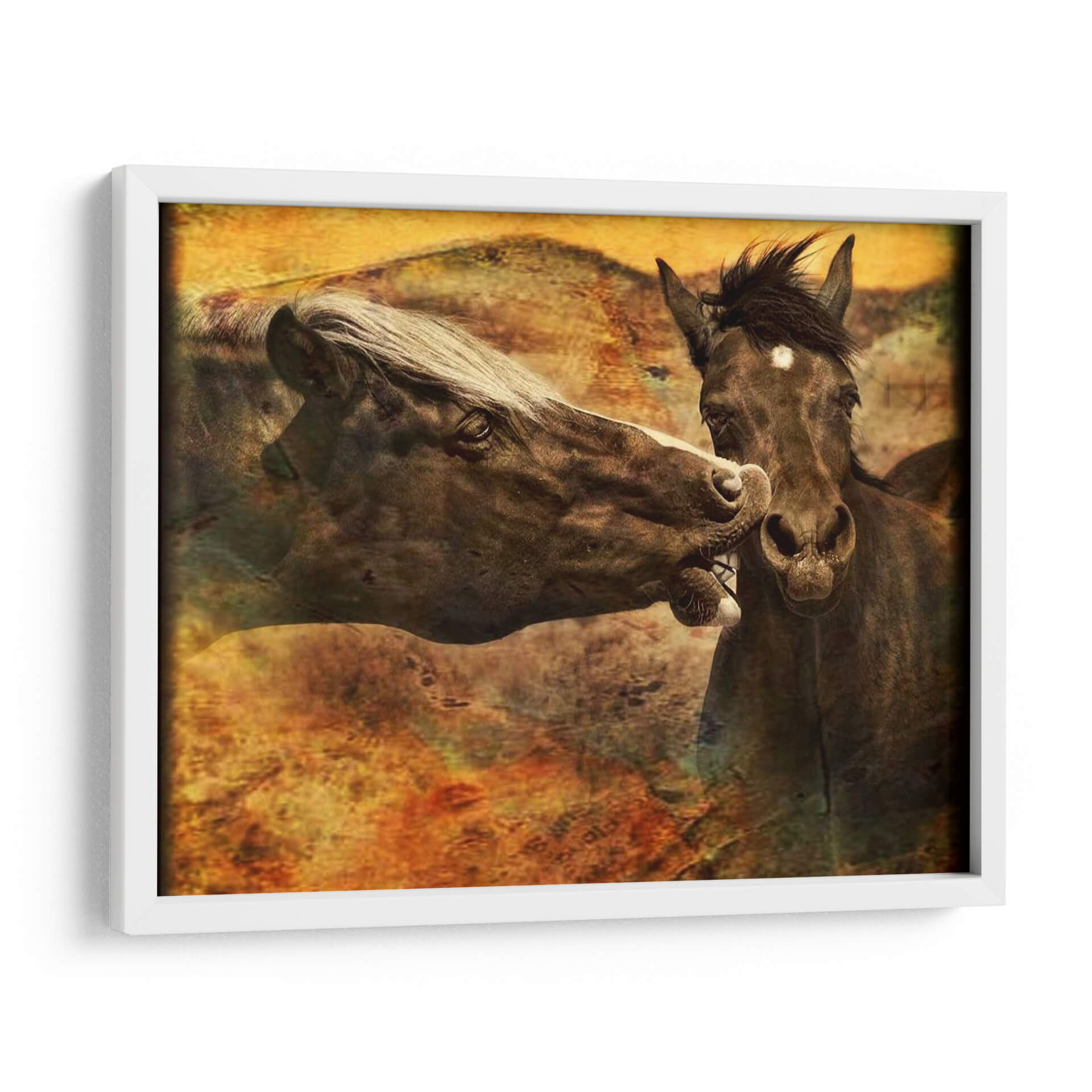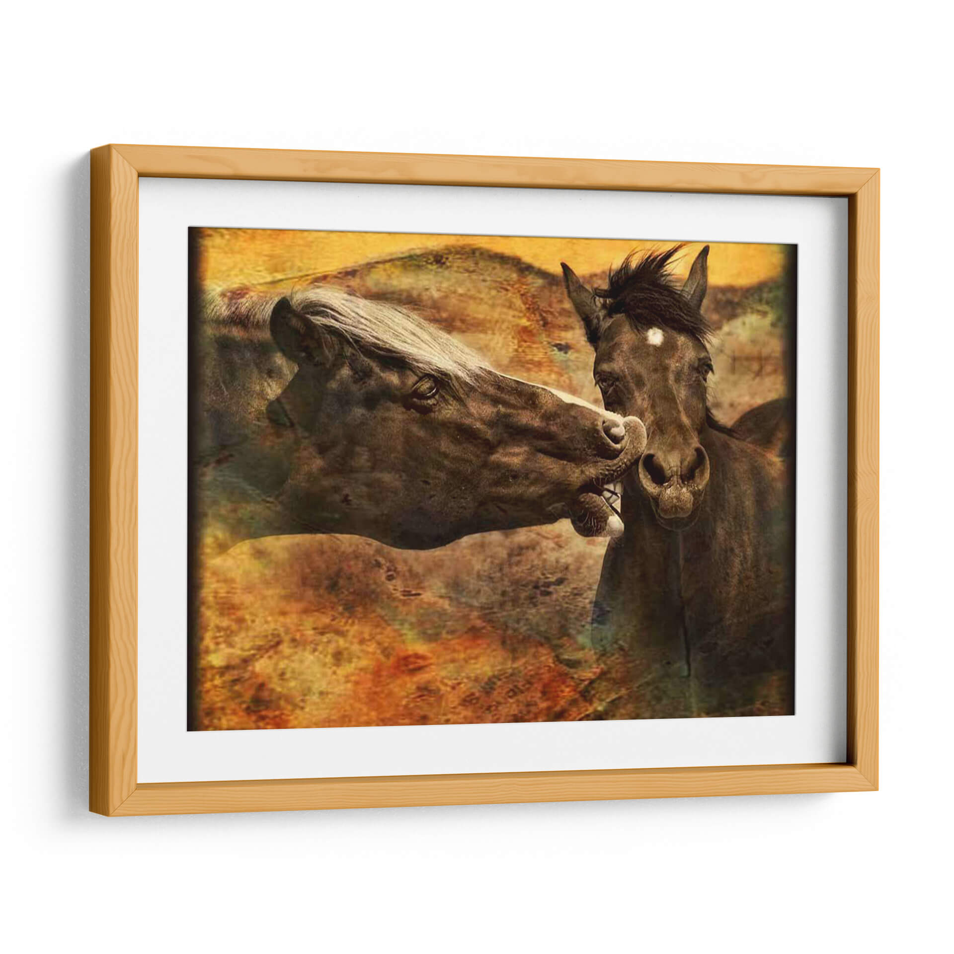 Captura la fuerza y la ternura de la naturaleza con este cautivador cuadro decorativo 'Besos De Caballos I' de David Drost. La obra presenta un primer plano íntimo de dos caballos, donde uno parece ofrecer un suave gesto de afecto al otro. La composición se centra en las expresiones faciales de los animales, transmitiendo una conexión profunda y un momento de delicadeza en medio de su poderío natural. La paleta de colores, dominada por cálidos tonos tierra, naranjas y ocres, evoca una sensación de calidez, vitalidad y conexión con la tierra. El fondo texturizado, con sutiles matices que recuerdan a escritos antiguos o patrones orgánicos, añade profundidad y un aire de misterio a la pieza, invitando a la contemplación. Este cuadro decorativo es ideal para quienes buscan infundir a sus espacios un toque de elegancia rústica y un recordatorio de la belleza de las relaciones en el reino animal. Perfecto para salas de estar, estudios u oficinas, este arte de pared contemporáneo no solo embellecerá tu hogar, sino que también inspirará conversaciones y generará una atmósfera de serenidad y aprecio por la vida silvestre. Añade una pieza única que celebra la lealtad y el vínculo en tu decoración.