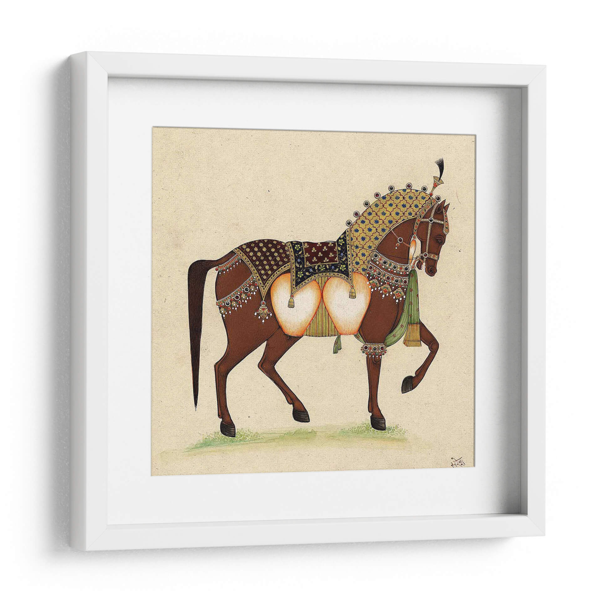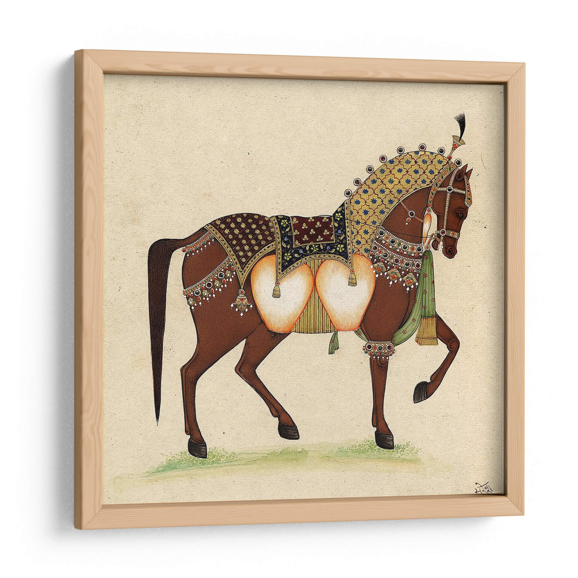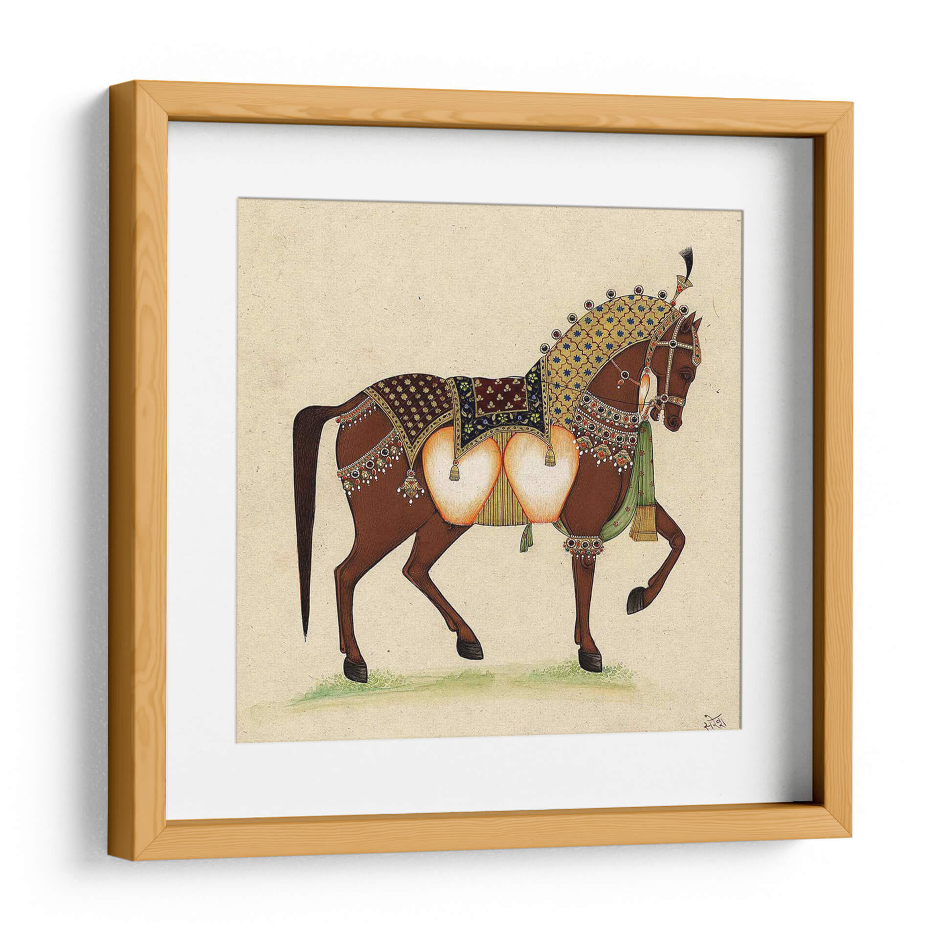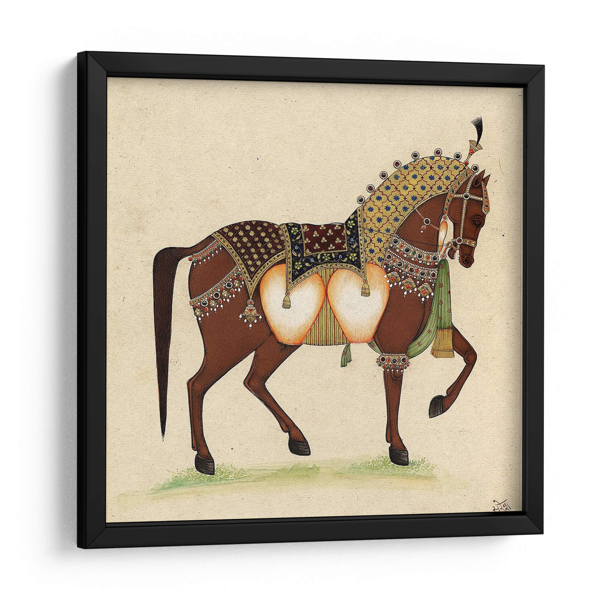 Embárcate en un viaje visual hacia la majestuosidad de la India con "Caballo De La India II", una obra de arte que captura la elegancia y el espíritu de estos nobles animales. Este cuadro decorativo presenta un caballo de pelaje castaño, ricamente adornado con una vestimenta tradicional que evoca la opulencia y la tradición de la realeza india. Cada detalle de la ornamentación, desde los intrincados patrones dorados y azules en la cabeza y el lomo hasta las campanas y gemas que cuelgan de su arnés, está ejecutado con una precisión exquisita. La paleta de colores, dominada por tonos tierra, dorados, azules profundos y toques de verde esmeralda, crea una atmósfera de distinción y refinamiento. La composición, centrada en la figura del caballo de perfil, resalta su porte y movimiento grácil. Ideal para añadir un toque de carácter exótico y sofisticación a tu sala de estar, estudio u oficina, este cuadro decorativo es una pieza que invita a la admiración y la contemplación, transportando a cualquier espacio a un mundo de tradición y belleza atemporal. Es una adición perfecta para amantes de la cultura oriental y el arte ecuestre.