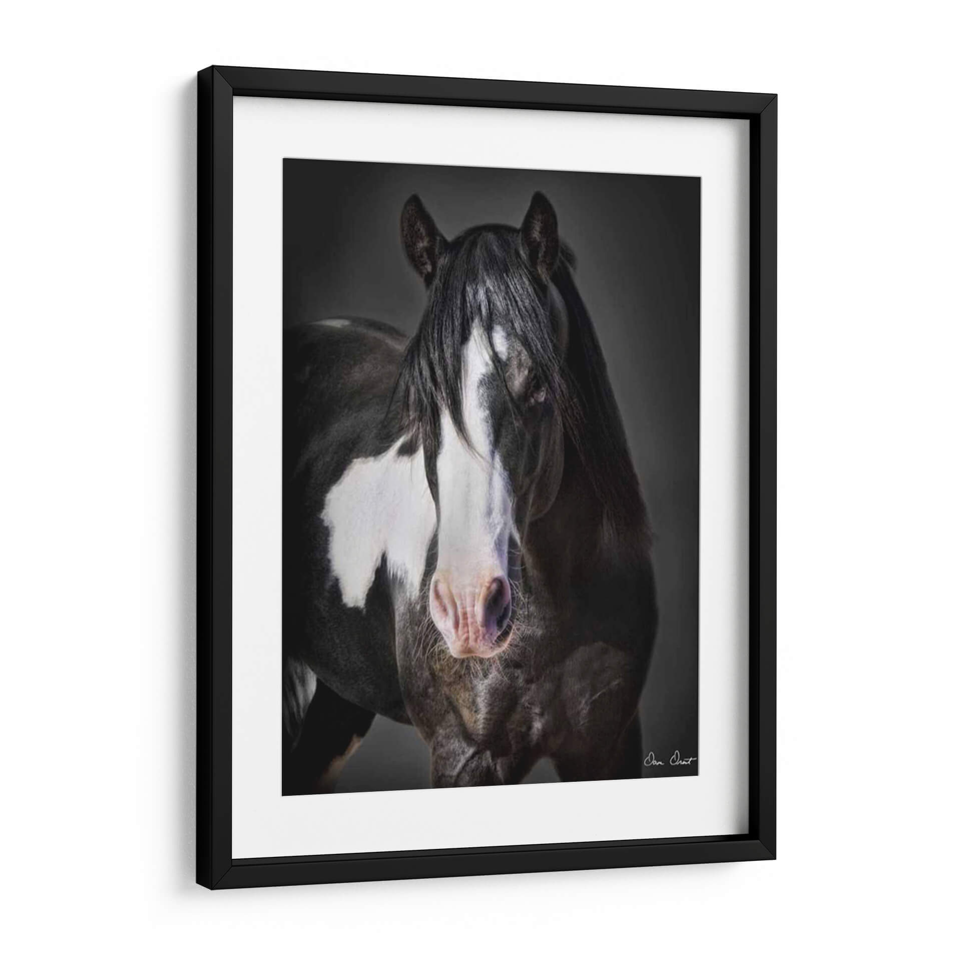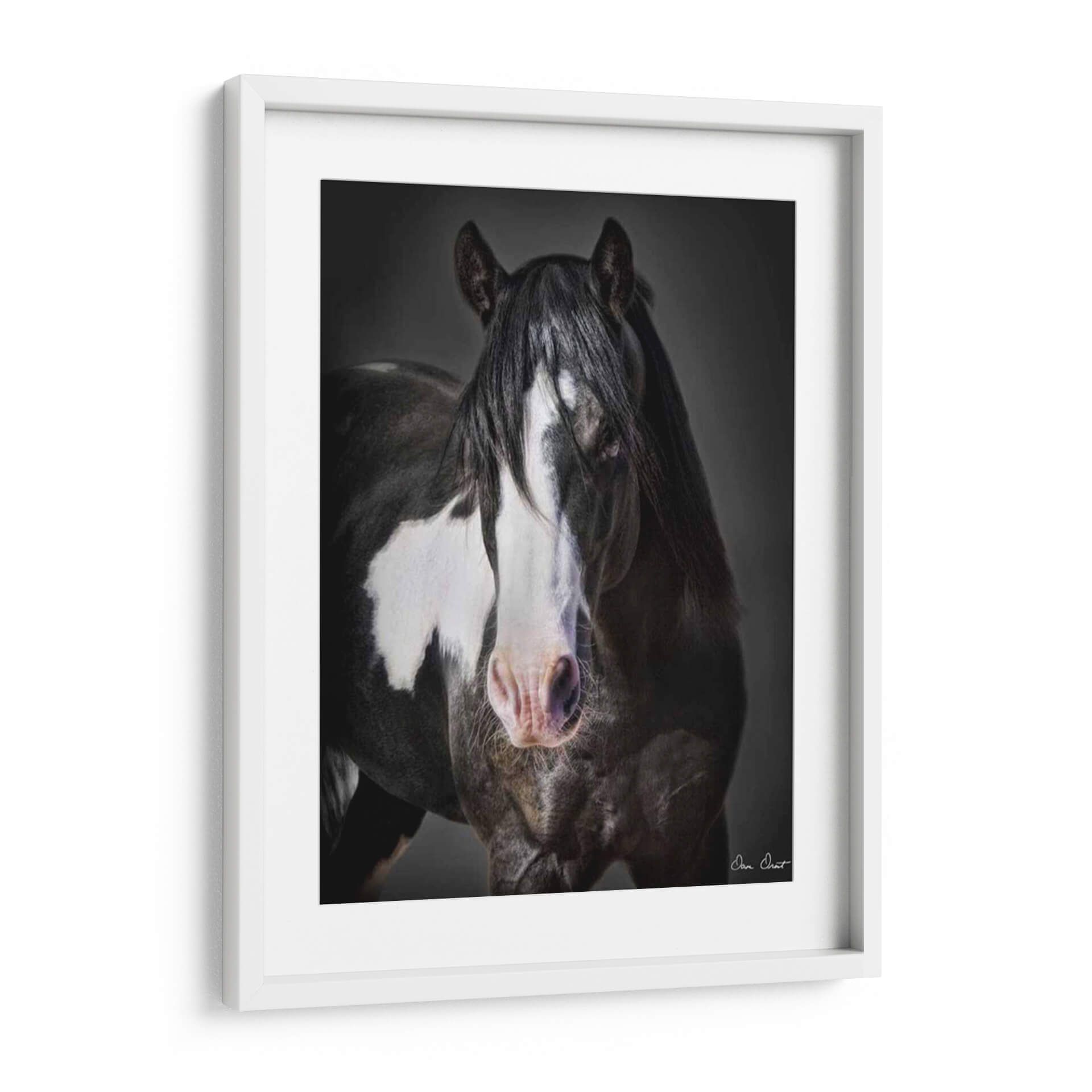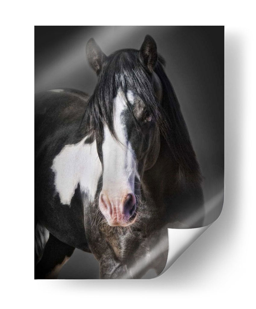Captura la majestuosidad y la fuerza indomable con este impresionante cuadro decorativo de un caballo, "Caballo Retrato II" de David Drost. La obra maestra presenta un primer plano de un caballo con una crin oscura y sedosa que enmarca un rostro penetrante, con distintivas marcas blancas que añaden carácter y profundidad a su semblante. La paleta de colores se centra en tonos oscuros y profundos, con contrastes sutiles que realzan la textura del pelaje y la intensidad de su mirada. La iluminación dramática crea un ambiente de misterio y elegancia, haciendo de esta pieza una adición sofisticada a cualquier espacio. Ideal para amantes de la equitación, entusiastas de la naturaleza o cualquiera que busque infundir su hogar u oficina con un toque de poder y belleza natural. Este cuadro decorativo es perfecto para salas de estar modernas, estudios o incluso como un punto focal audaz en un dormitorio. La composición centrada en el rostro del caballo invita a la contemplación y añade una conexión emocional profunda. Transforma tu decoración con esta pieza artística única que evoca el espíritu libre y la nobleza de estos magníficos animales. Descubre la elegancia atemporal de la vida silvestre capturada en arte.