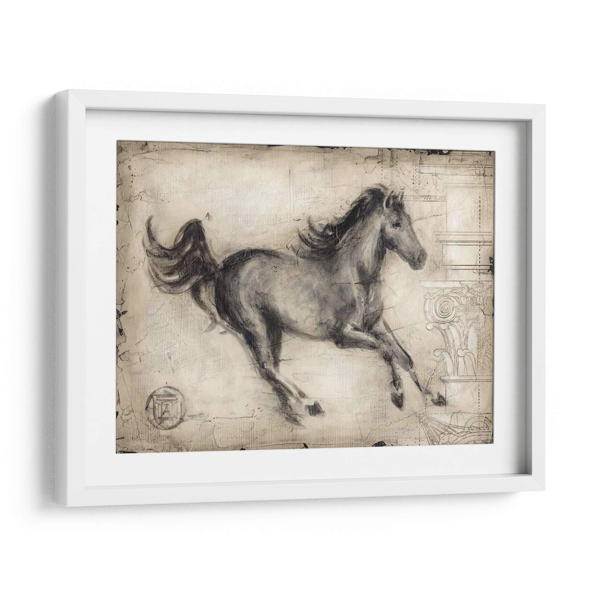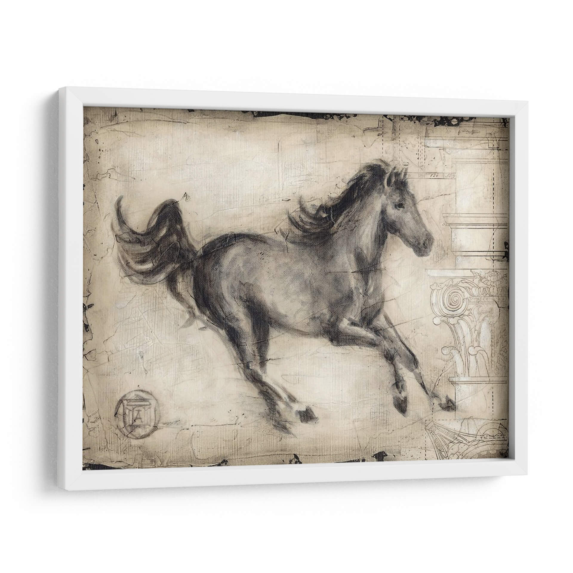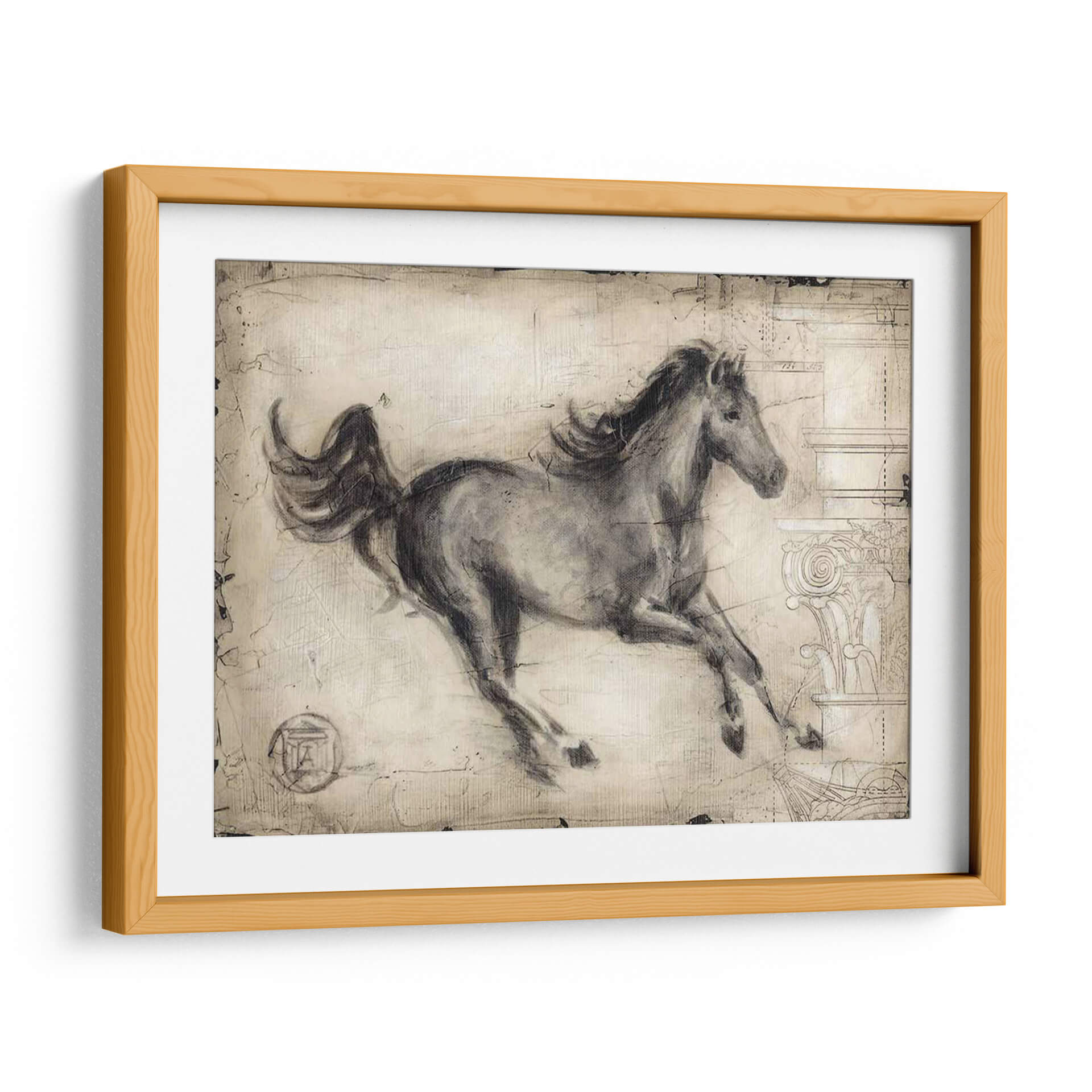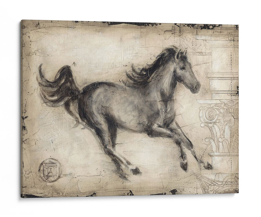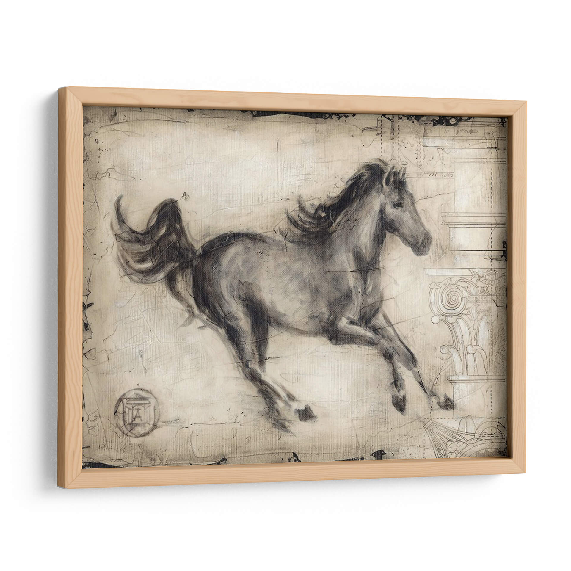 Sumérgete en la majestuosidad y el movimiento con "Caballo Romano I", una obra de arte digital que captura la esencia de la fuerza y la elegancia equina. El artista Ethan Harper presenta una pieza de estilo clásico, con influencias de bocetos arquitectónicos y estudios anatómicos, que evoca una atmósfera de estudio artístico y erudición. La paleta de colores se centra en tonos sepia y grises, creando una sensación de atemporalidad y profundidad, como si se tratara de un antiguo pergamino o un dibujo a carboncillo redescubierto. La figura del caballo, capturada en pleno galope, transmite una energía dinámica y una libertad indómita, mientras que los detalles de columnas clásicas y anotaciones de diseño en el fondo añaden un toque de sofisticación intelectual. Este cuadro decorativo es ideal para espacios que buscan un acento de carácter y refinamiento, como un estudio, una biblioteca, un despacho o una sala de estar con un toque clásico o ecléctico. Añade un elemento de poder y belleza atemporal a tu decoración con esta impactante representación del caballo romano.
