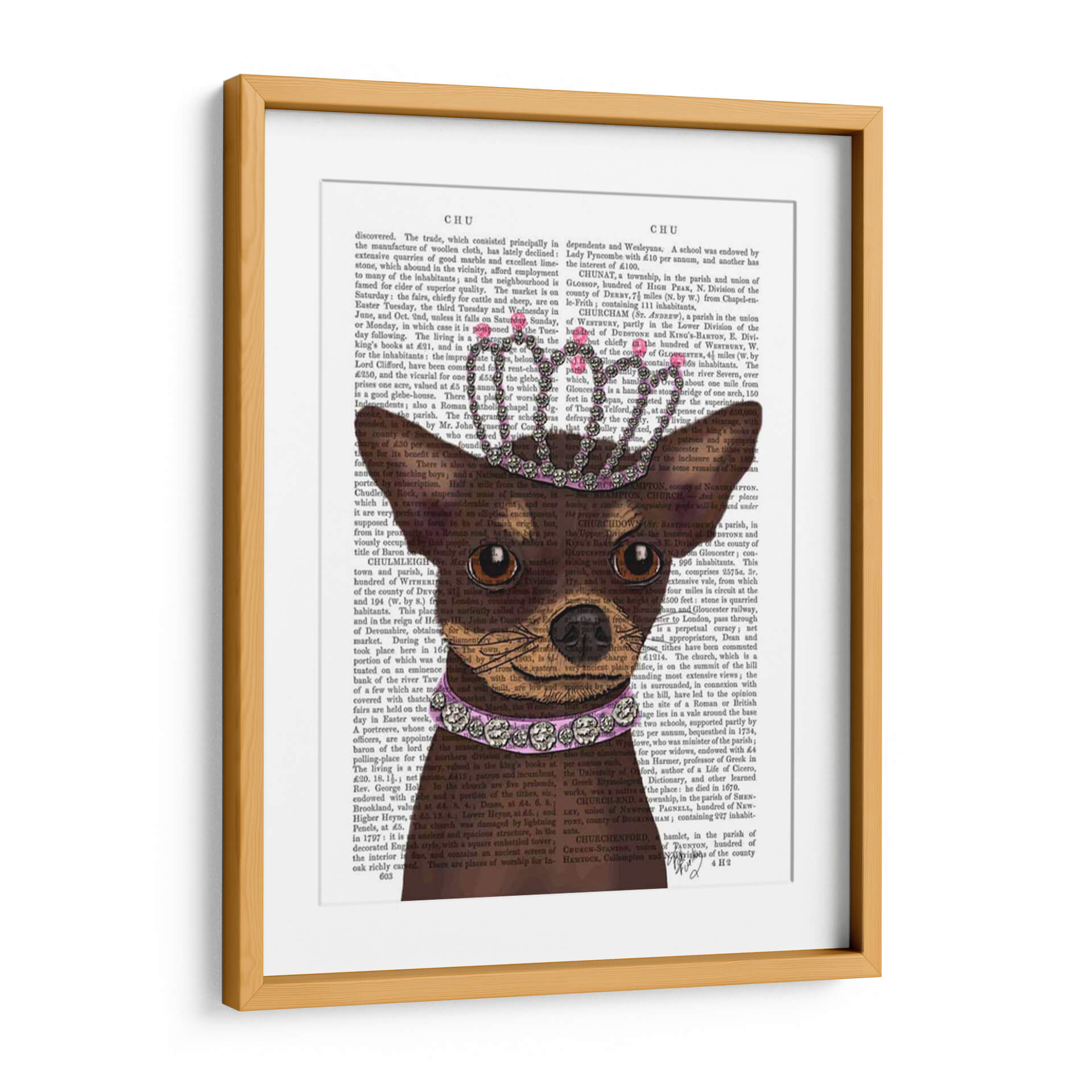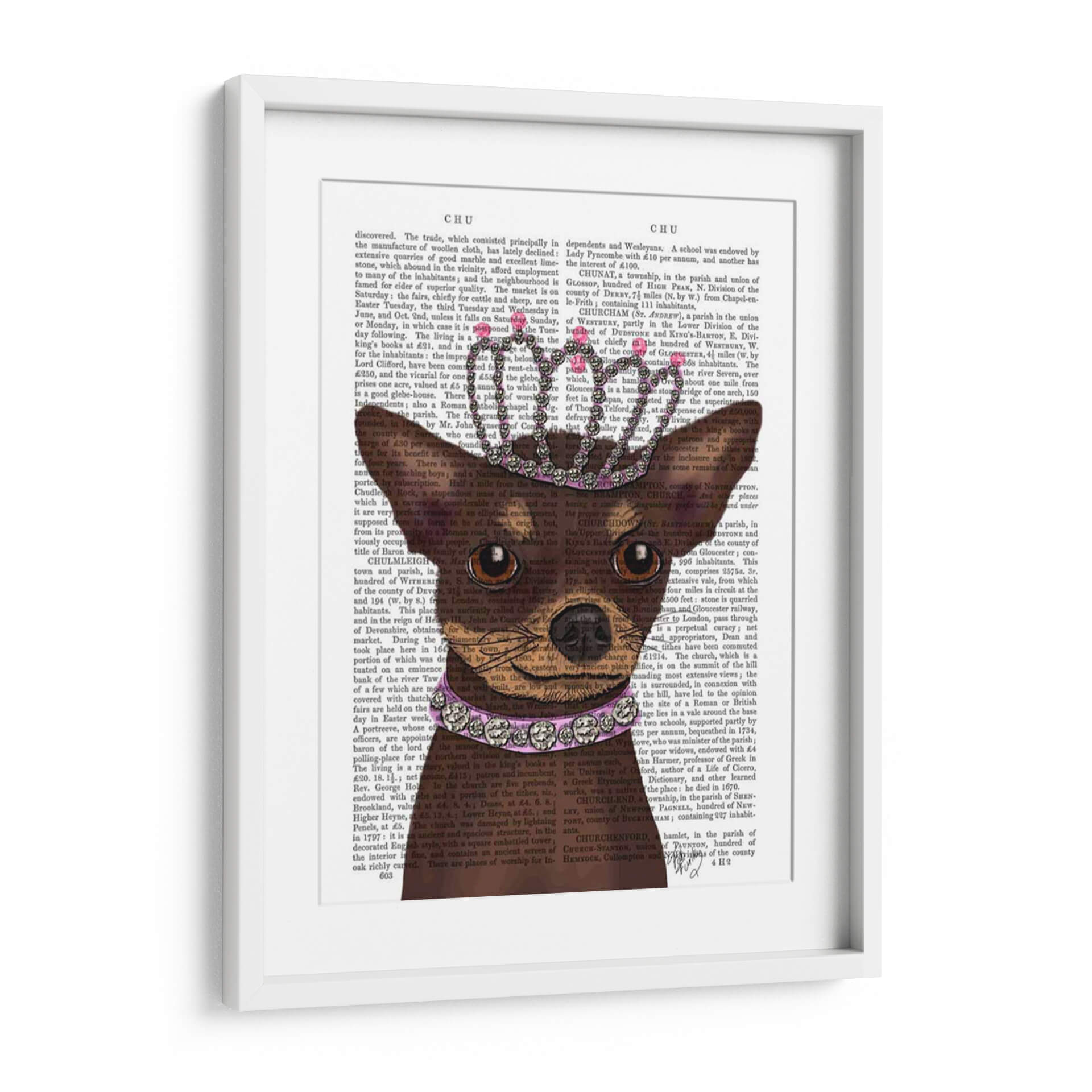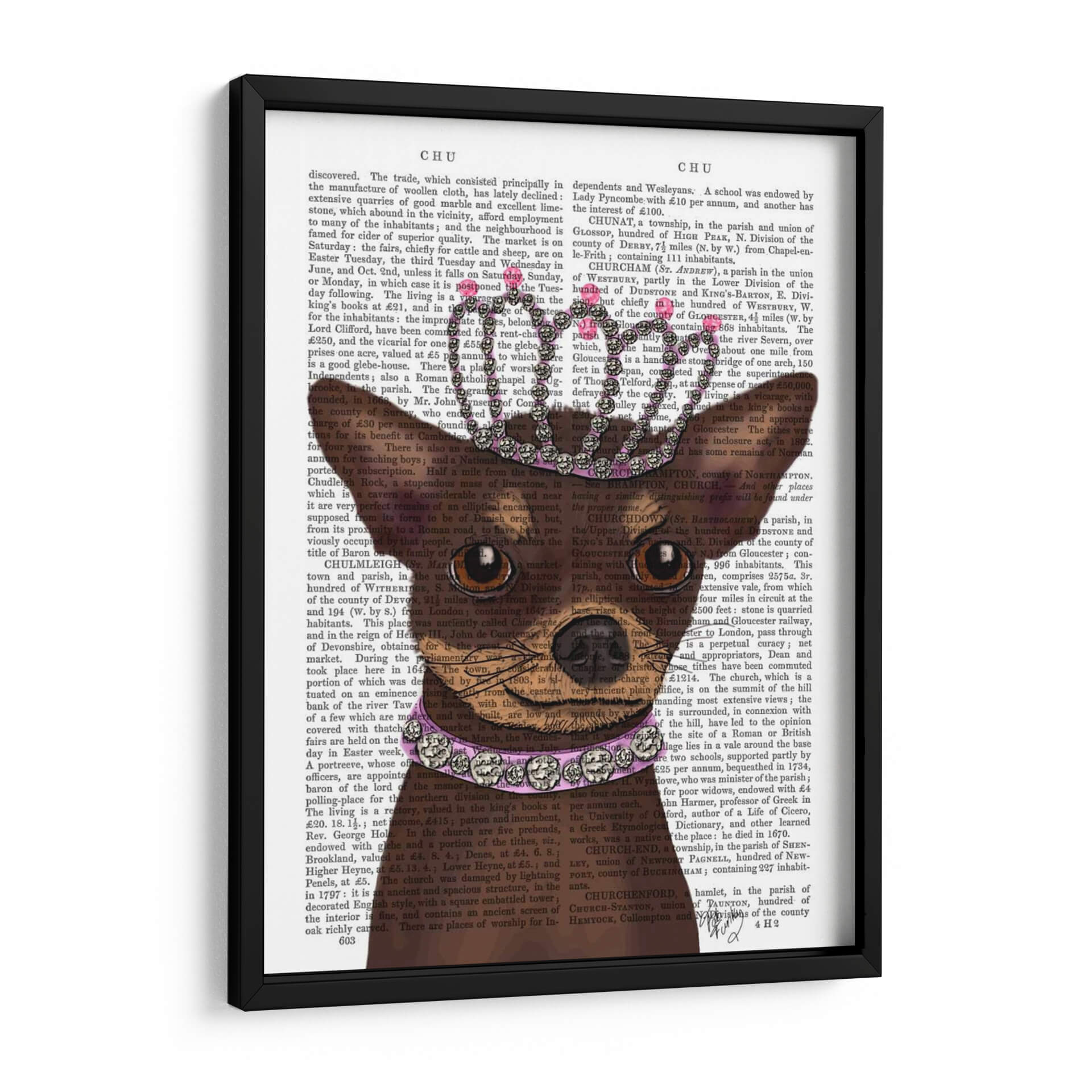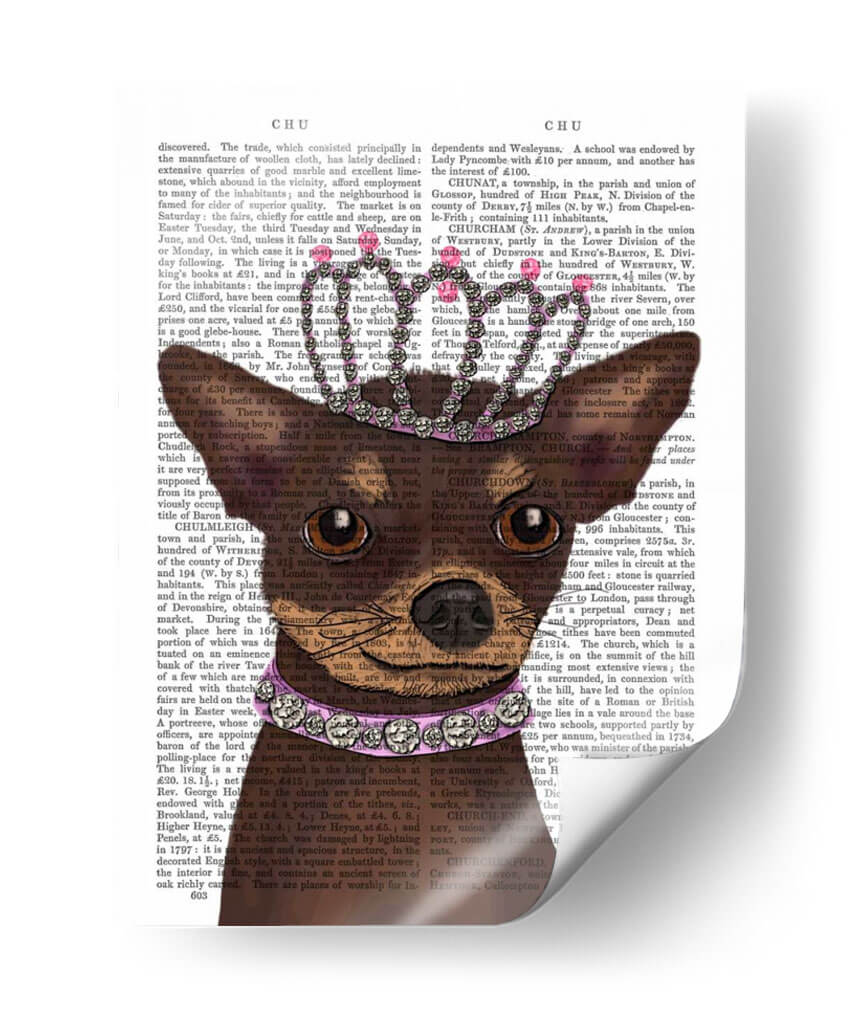 Transforma tu espacio con el encantador cuadro decorativo 'Chihuahua y Tiara Marrones' del artista Fab Funky. Esta cautivadora obra presenta un adorable chihuahua adornado con una majestuosa tiara y un collar brillante, posando con una mirada penetrante sobre un fondo de texto antiguo. La paleta de colores, dominada por tonos marrones cálidos y los detalles vibrantes de la joyería, crea una atmósfera juguetona y a la vez sofisticada. El estilo único de Fab Funky, que combina lo realista con un toque de fantasía, hace de esta pieza un punto focal intrigante para cualquier habitación. Ideal para amantes de los animales y admiradores del arte contemporáneo, este cuadro decorativo aportará personalidad y un toque de originalidad a tu sala de estar, oficina o dormitorio. Su composición detallada y la expresión del animal invitan a la contemplación, convirtiéndola en una adición memorable a tu colección de arte de pared, perfecta para quienes buscan piezas que cuenten una historia y evoquen emociones positivas.