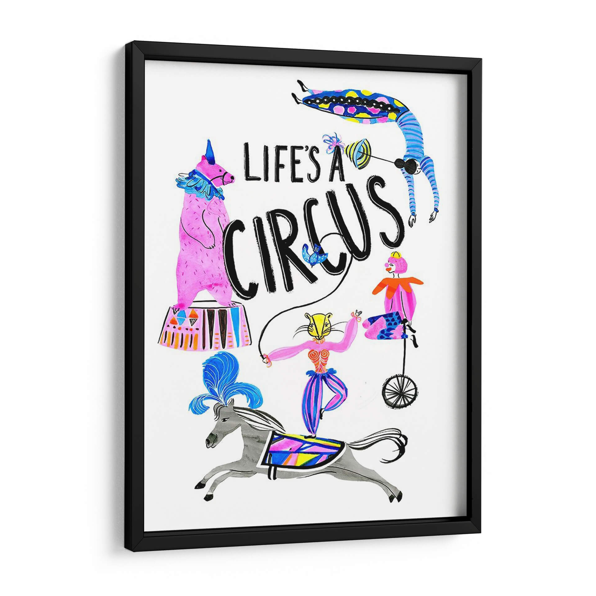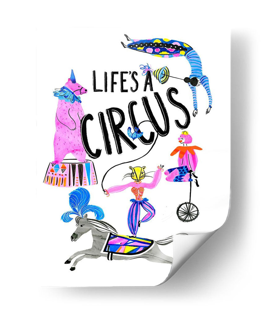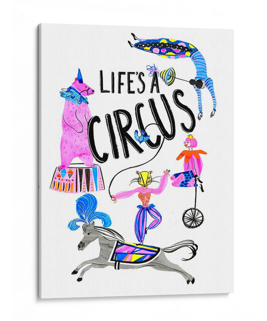Sumérgete en el vibrante mundo del 'Circo Divertido Iv', una obra de arte que captura la esencia lúdica y enérgica de la vida circense. Este cuadro decorativo, creado por el artista Stephen Switzer, presenta una cautivadora ilustración con una paleta de colores vivos y alegres, dominada por el rosa, azul y amarillo, que irradian optimismo y diversión. La composición dinámica, llena de personajes y elementos circenses como un oso de pie, una acróbata en un monociclo, y un jinete sobre un caballo, junto a la icónica frase "Life's a Circus", evoca una sensación de movimiento y espectáculo. El estilo ilustrativo y ligeramente caprichoso añade un toque de originalidad, haciéndola una pieza ideal para espacios que buscan un acento de color y personalidad. Perfecta para iluminar una sala de estar, un dormitorio infantil o incluso un espacio de trabajo creativo, esta obra es una invitación a celebrar la alegría y el espectáculo de la vida cotidiana. Añade este toque de fantasía y color a tu decoración y transforma cualquier ambiente.