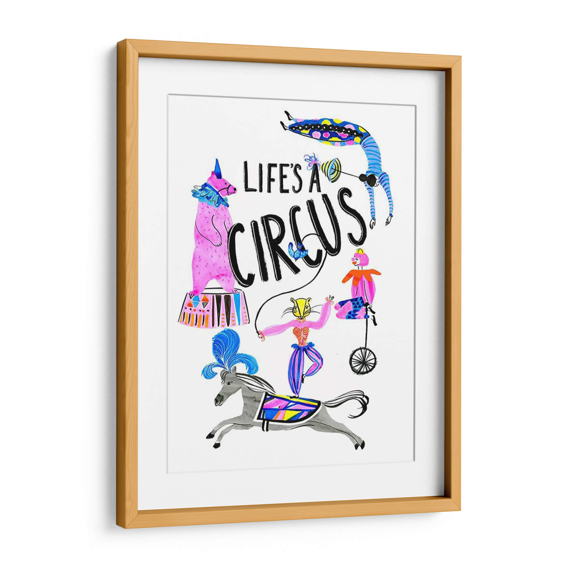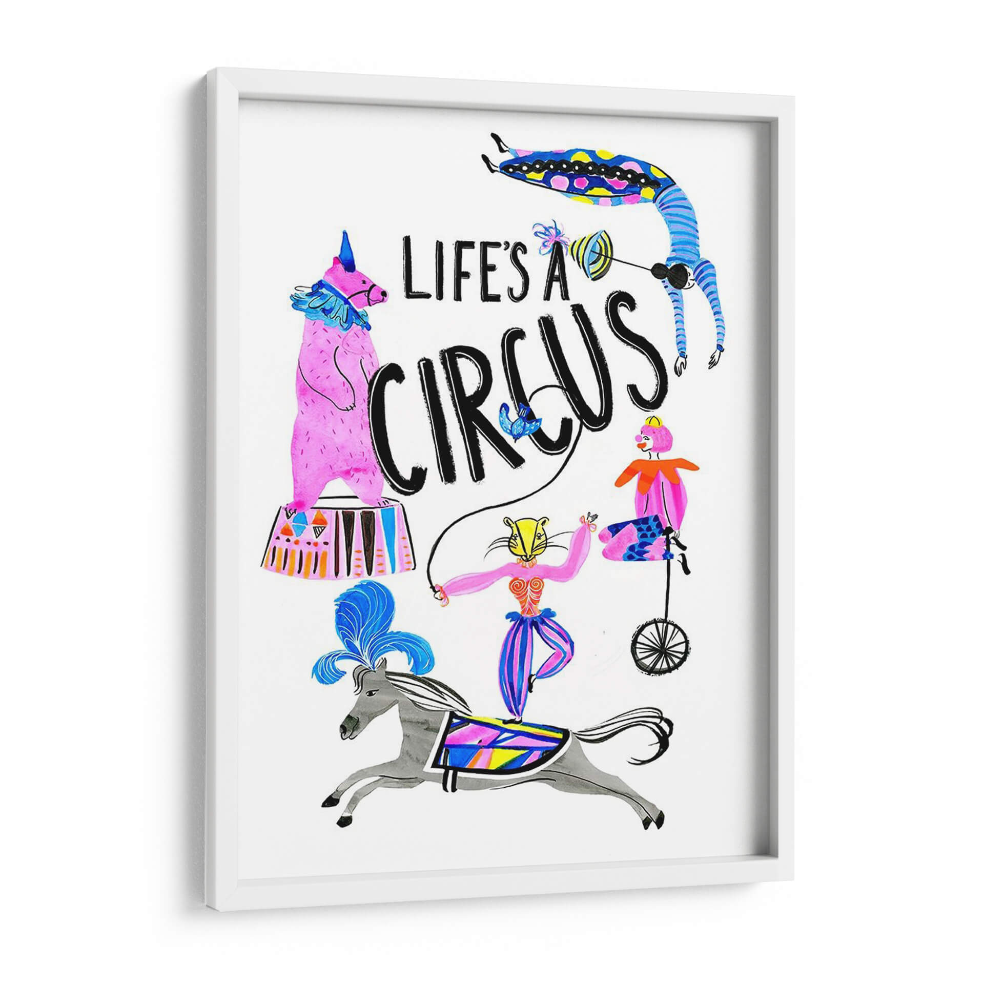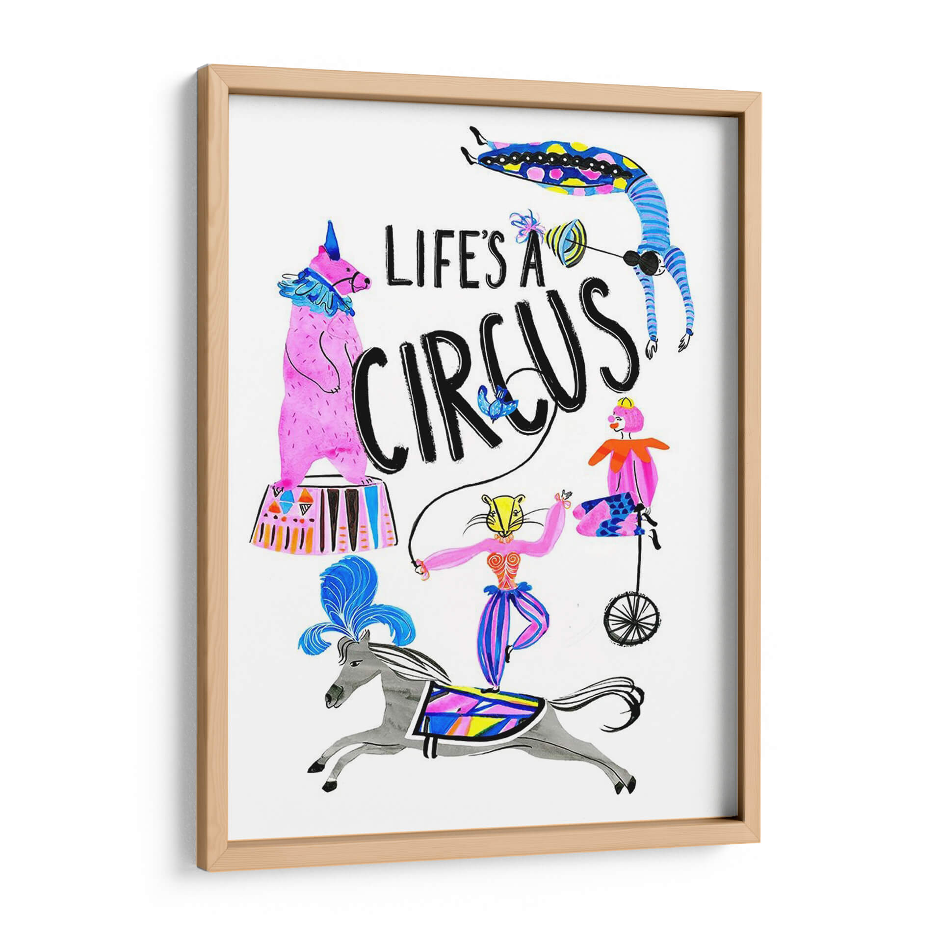 Sumérgete en el vibrante mundo del 'Circo Divertido Iv', una obra de arte que captura la esencia lúdica y enérgica de la vida circense. Este cuadro decorativo, creado por el artista Stephen Switzer, presenta una cautivadora ilustración con una paleta de colores vivos y alegres, dominada por el rosa, azul y amarillo, que irradian optimismo y diversión. La composición dinámica, llena de personajes y elementos circenses como un oso de pie, una acróbata en un monociclo, y un jinete sobre un caballo, junto a la icónica frase "Life's a Circus", evoca una sensación de movimiento y espectáculo. El estilo ilustrativo y ligeramente caprichoso añade un toque de originalidad, haciéndola una pieza ideal para espacios que buscan un acento de color y personalidad. Perfecta para iluminar una sala de estar, un dormitorio infantil o incluso un espacio de trabajo creativo, esta obra es una invitación a celebrar la alegría y el espectáculo de la vida cotidiana. Añade este toque de fantasía y color a tu decoración y transforma cualquier ambiente.