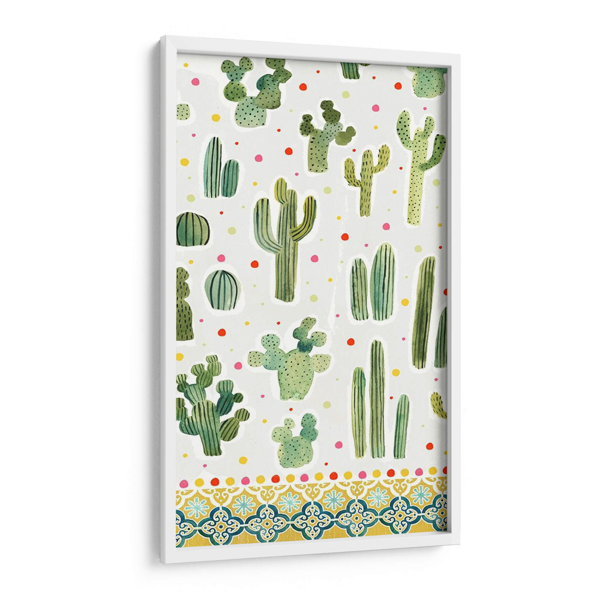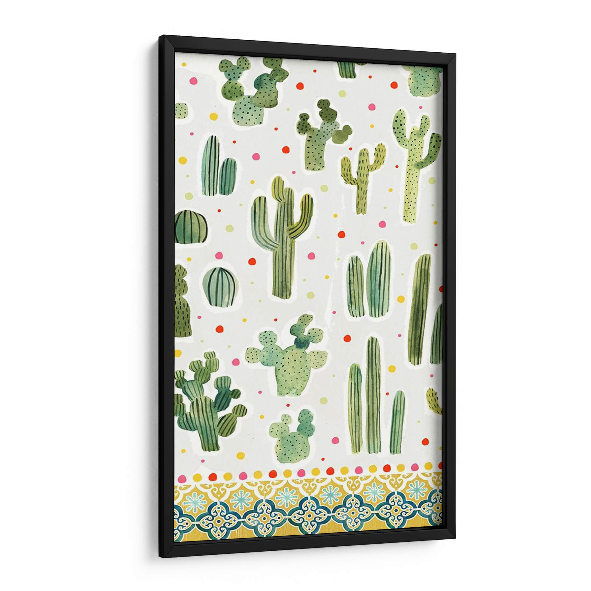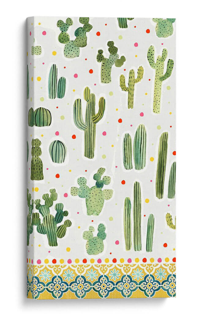 Adéntrate en el encanto del desierto con nuestra cautivadora obra "Colección De Alpaca Dulce B" de Victoria Borges. Este cuadro decorativo, con su vibrante y juguetona representación de diversas especies de cactus, es una explosión de color y vida para cualquier espacio. La paleta de verdes intensos de los suculentos contrasta maravillosamente con los puntos de colores primarios dispersos, creando una atmósfera alegre y refrescante. El estilo pictórico, que evoca la técnica de acuarela, añade un toque de suavidad y naturalidad a cada planta, mientras que la composición de patrón repetitivo aporta un ritmo visual dinámico y moderno. La parte inferior de la obra se adorna con un intrincado diseño de borde inspirado en mosaicos, que añade una dimensión extra de sofisticación y calidez, evocando la estética mediterránea o suroeste. Este cuadro es ideal para infundir personalidad y un toque bohemio-chic en salas de estar, dormitorios, oficinas o cualquier rincón que necesite un soplo de alegría y originalidad. Transforma tu hogar en un oasis de estilo contemporáneo con esta pieza única que celebra la belleza resiliente y encantadora de la naturaleza.