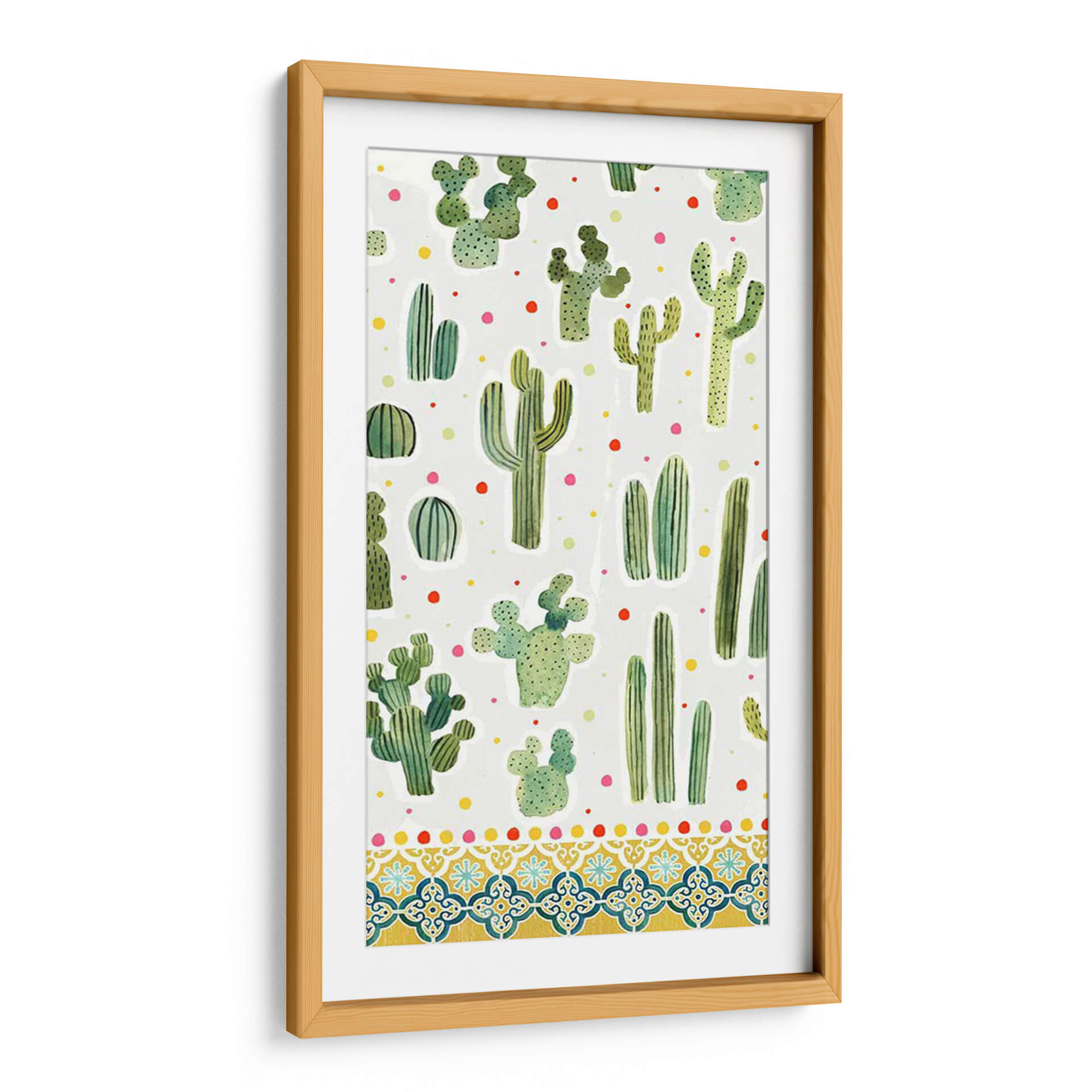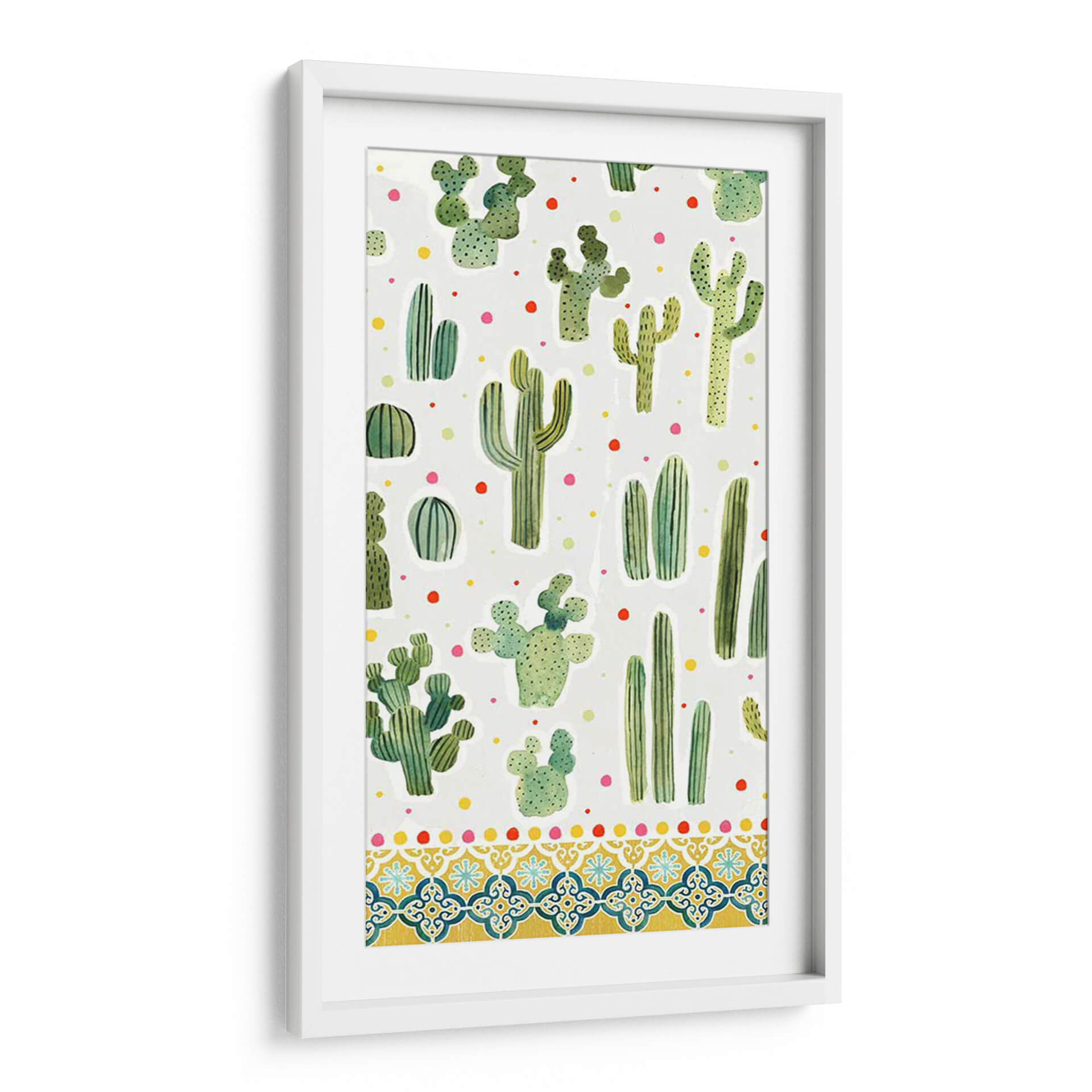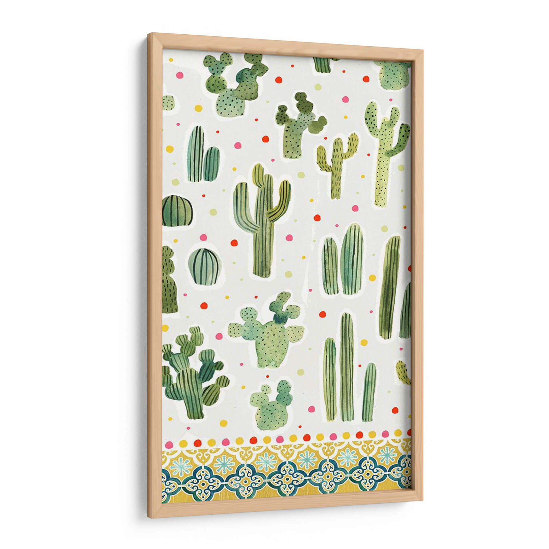 Adéntrate en el encanto del desierto con nuestra cautivadora obra "Colección De Alpaca Dulce B" de Victoria Borges. Este cuadro decorativo, con su vibrante y juguetona representación de diversas especies de cactus, es una explosión de color y vida para cualquier espacio. La paleta de verdes intensos de los suculentos contrasta maravillosamente con los puntos de colores primarios dispersos, creando una atmósfera alegre y refrescante. El estilo pictórico, que evoca la técnica de acuarela, añade un toque de suavidad y naturalidad a cada planta, mientras que la composición de patrón repetitivo aporta un ritmo visual dinámico y moderno. La parte inferior de la obra se adorna con un intrincado diseño de borde inspirado en mosaicos, que añade una dimensión extra de sofisticación y calidez, evocando la estética mediterránea o suroeste. Este cuadro es ideal para infundir personalidad y un toque bohemio-chic en salas de estar, dormitorios, oficinas o cualquier rincón que necesite un soplo de alegría y originalidad. Transforma tu hogar en un oasis de estilo contemporáneo con esta pieza única que celebra la belleza resiliente y encantadora de la naturaleza.