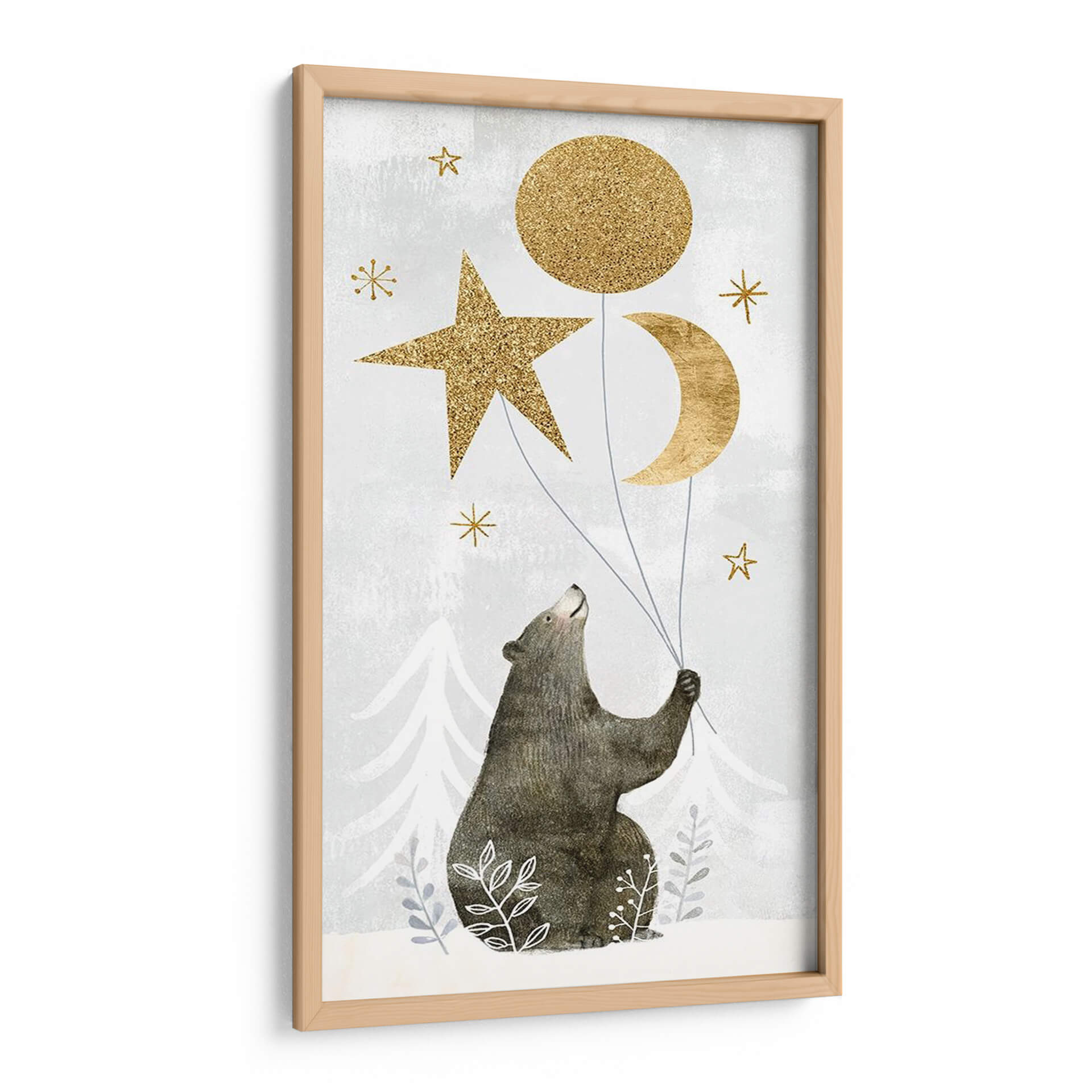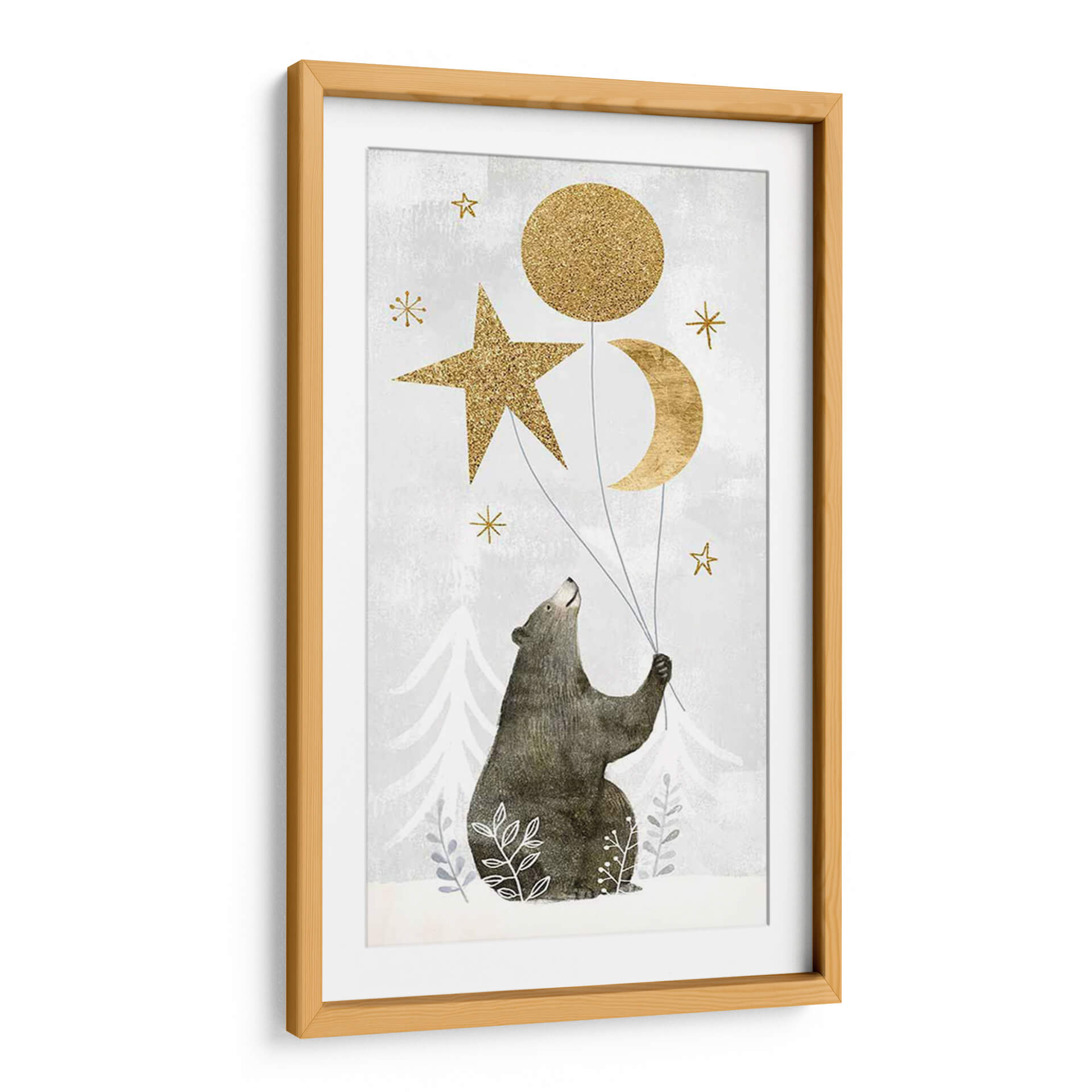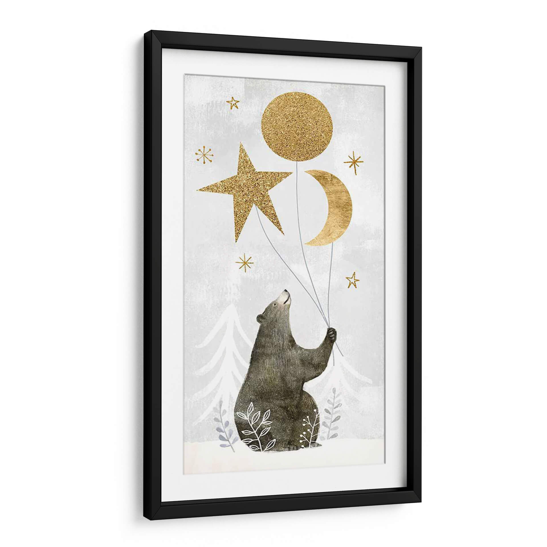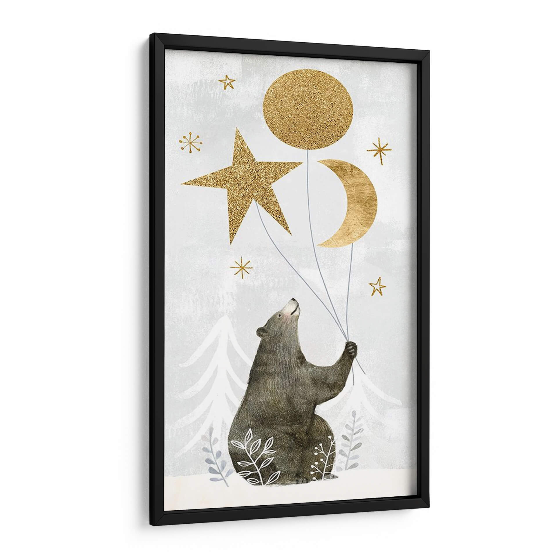 Sumérgete en la magia de la naturaleza con "Colección De Celebración De Bosques B", una obra de arte excepcional de Victoria Borges. Este cautivador cuadro decorativo representa a un tierno oso sosteniendo globos con forma de estrella, luna y sol, todos bañados en un deslumbrante acabado dorado. El fondo, de un suave gris texturizado, se adorna con siluetas de árboles nevados y delicados copos de nieve, creando una atmósfera de ensueño invernal. La paleta de colores, dominada por grises tenues y el vibrante brillo del dorado, evoca una sensación de calma, celebración y maravilla infantil. El estilo artístico, con toques de acuarela y texturas sutiles, confiere a la pieza una calidad etérea y acogedora. Ideal para habitaciones infantiles, dormitorios o cualquier espacio que busque un toque de fantasía y serenidad. Este cuadro es perfecto para aquellos que aprecian el arte contemporáneo con un mensaje tierno y optimista, añadiendo un punto de luz y alegría a tu decoración.
